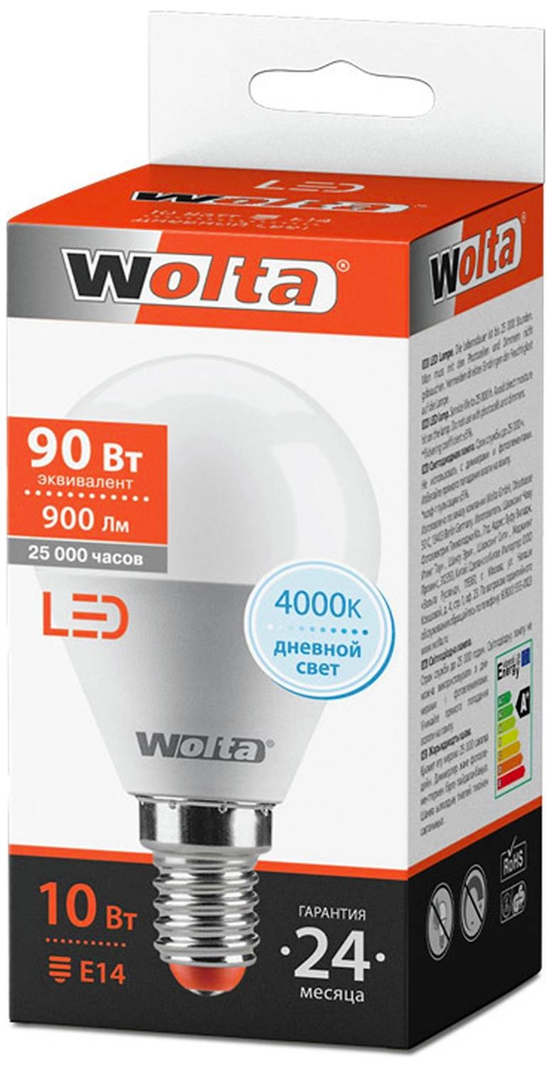 Wolta E14 10 Вт - компактная светодиодная лампа нейтрального дневного света с шарообразной колбой.