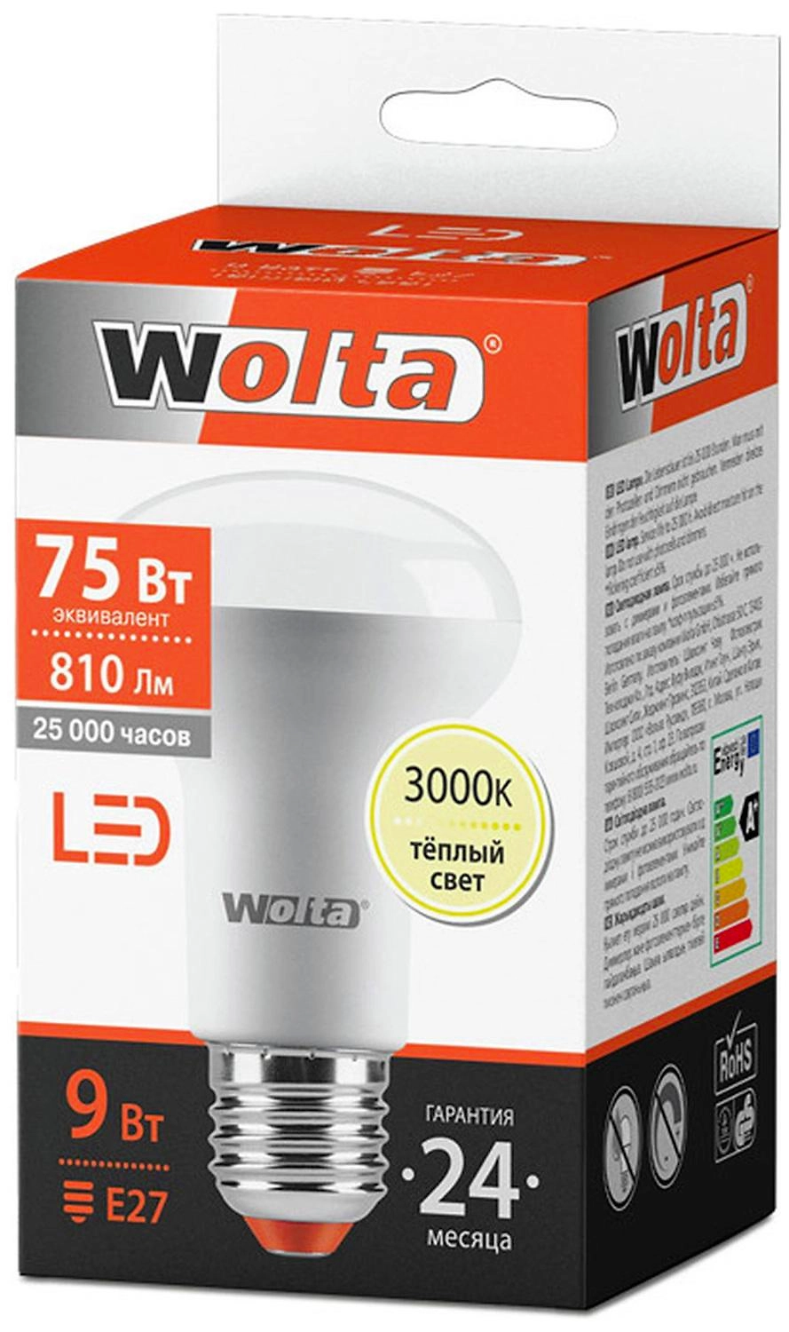 Светодиодная лампа Wolta Reflector E27 9 Вт 810 лм 3000 К имеет узкий угол рассеивания, создает концентрированный поток. По мощности источник света идентичен вольфрамовой лампочке 75 Вт.
