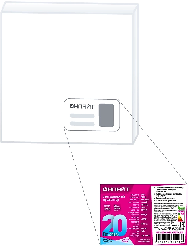Прожектор LED 20 Вт 4000 К IP65 черный 12х12х2,3 см