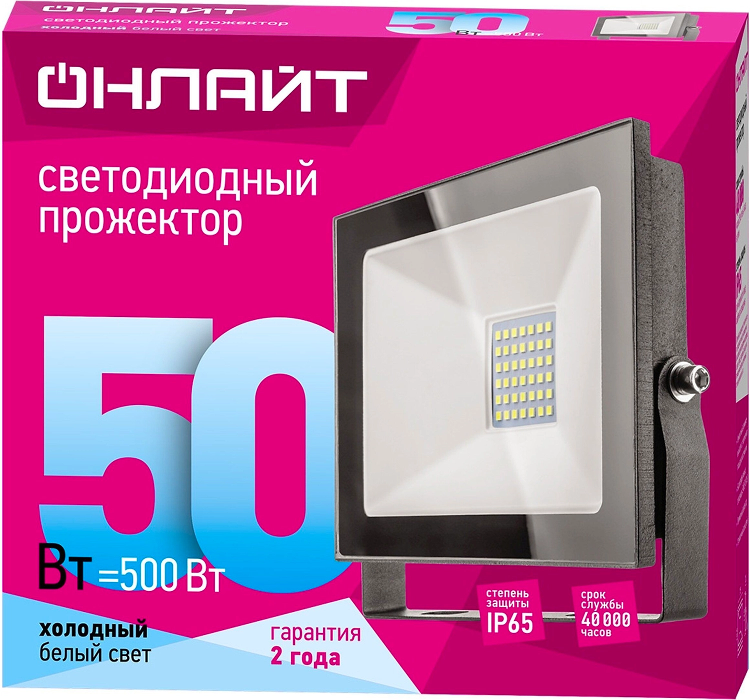 Светодиодный прожектор Онлайт мощностью 50 Вт - современный энергоэффективный источник светового потока 4000 Лм, аналогичный традиционному галогенному прожектору 500 Вт.