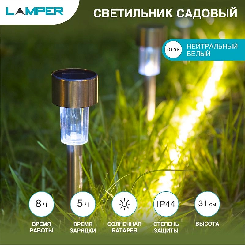 Светодиодный садовый светильник SLR-ST-31 на солнечной батарее высотой 31 см (с колышком) идеально подходит для подсветки газонов, цветников и дорожек. Данный светильник, сделанный из пластика, имеет высокие эксплуатационные показатели, что объясняется его повышенной стойкостью к механическим повреждениям и защищенностью от факторов внешней среды. Отсутствие внешних проводов делает данный светильник простым в установке и мобильным в перемещении. Эти светильники являются выгодным декором дачного участка благодаря своему неповторимому дизайну, который придает комфорт и уют атмосфере сада или двора. Размер: Ø47\*310 мм Материал: нержавеющая сталь + пластик Кол-во диодов: 1 шт. Цвет свечения: белый Степень защиты IP44 Время зарядки: 5 ч Время работы: 8 ч