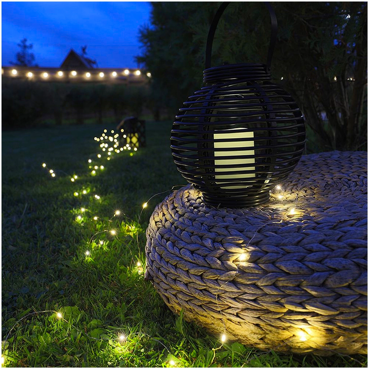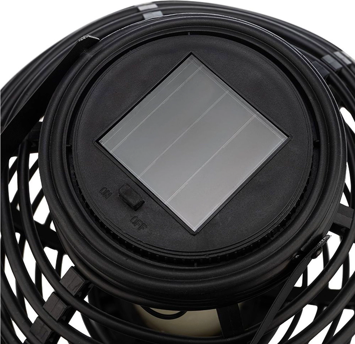 Декоративный фонарь в плетеном корпусе черного цвета работает на солнечной батарее, которая заряжает аккумулятор емкостью 200 мАч.