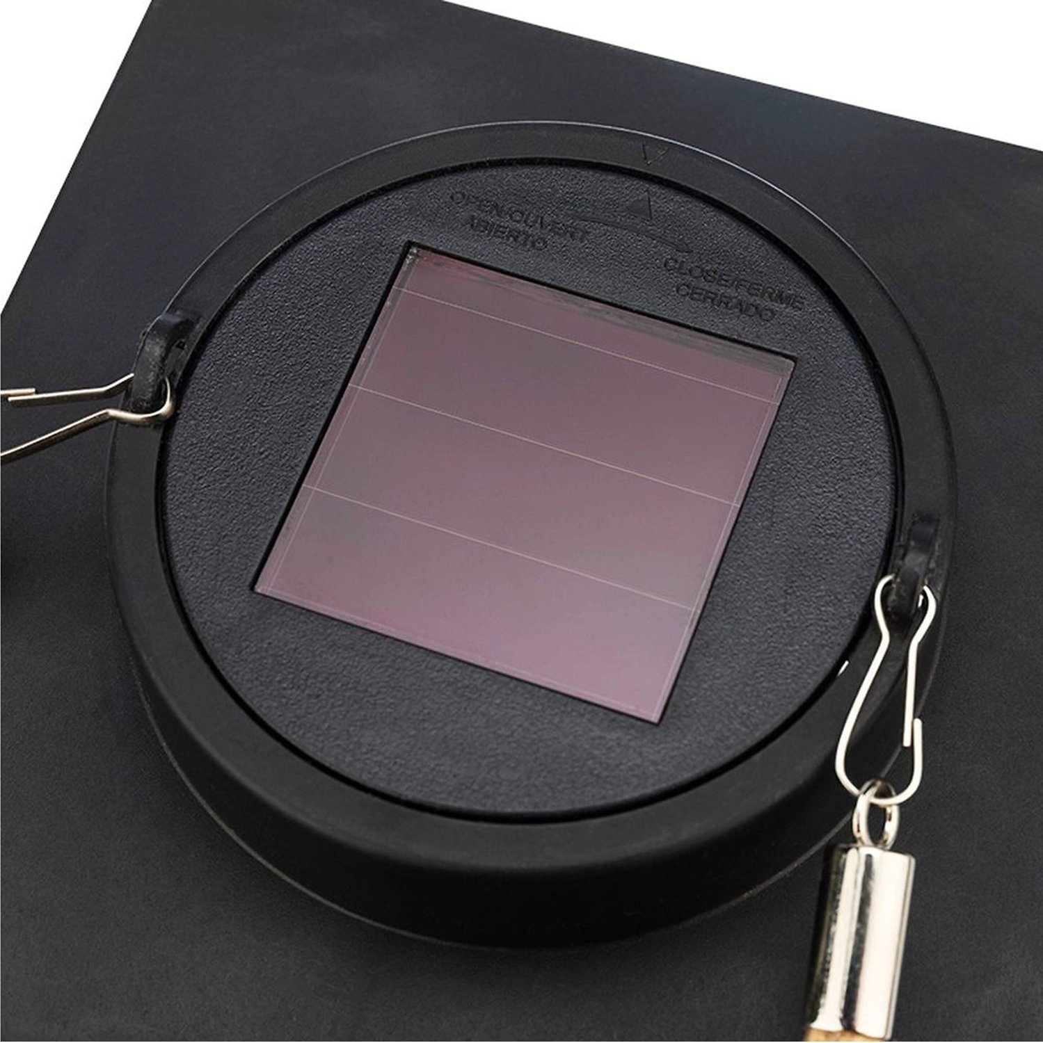 Декоративный фонарь на солнечной батарее в резном корпусе черного цвета излучает приятный белый свет теплого оттенка, комфортный для зрения.