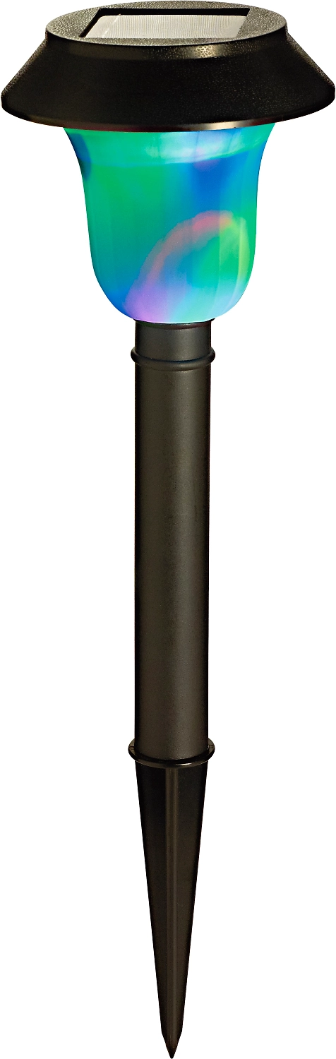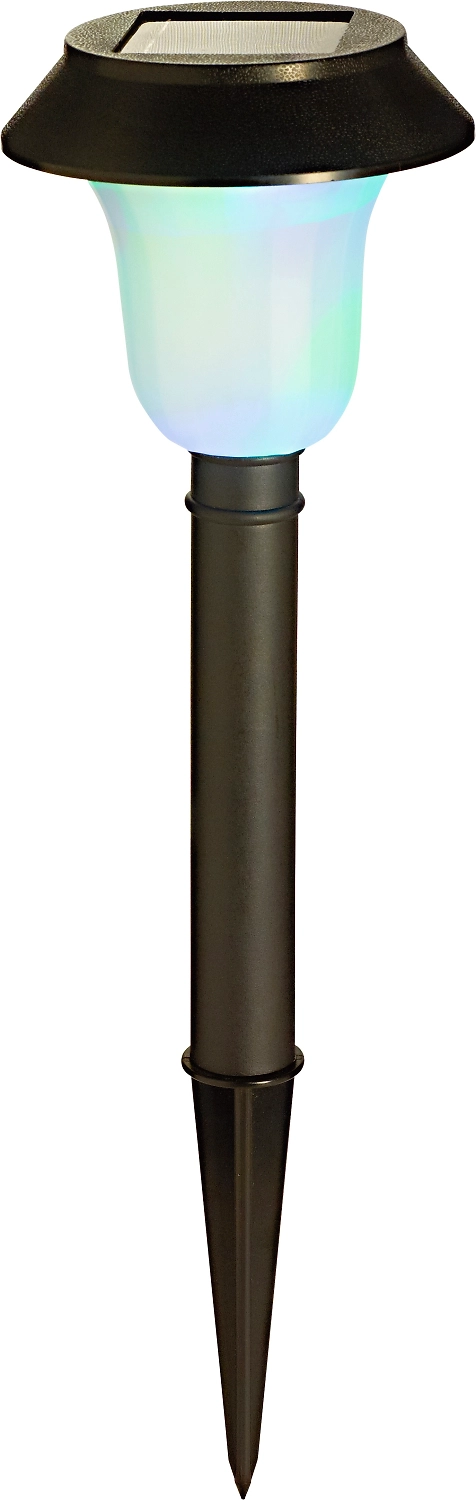 Садовый светильник на солнечной батарее RGB LED - современный светодиодный прибор, работающий в цветовой схеме RGB. Лампа с черным корпусом небольшого размера не бросается в глаза днем, но вечером создает на приусадебном участке уютную атмосферу.