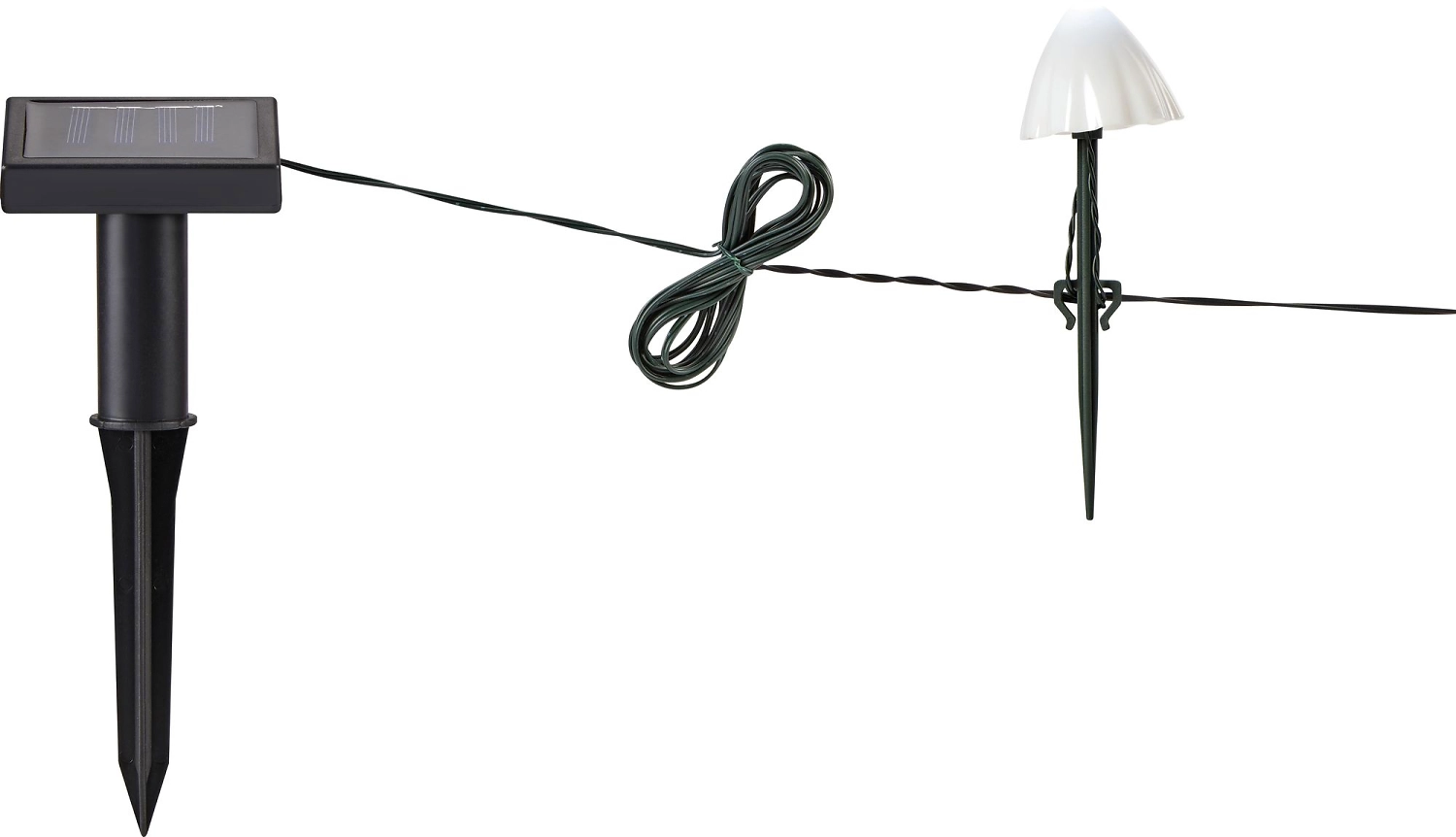 Цепочка из пяти светильников с белыми светодиодами имеет длину четыре метра. Работает от солнечной батареи.