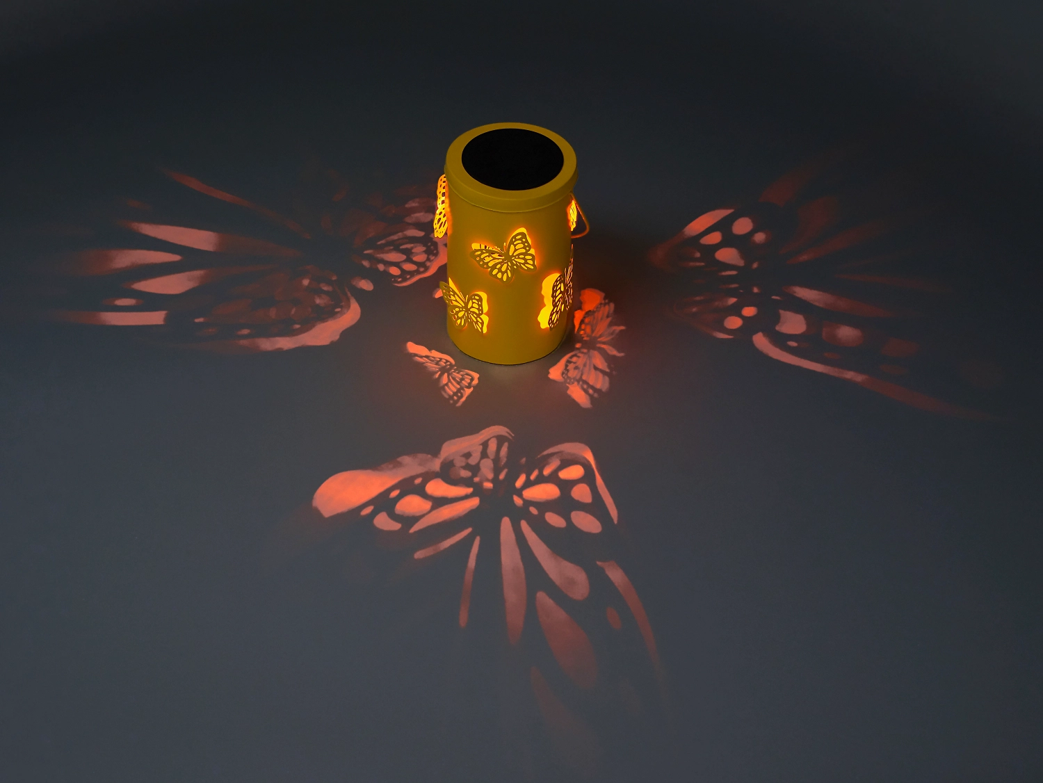 Декоративное оформление металлического плафона в виде летящих бабочек придаст окружению очарования. Включенный светильник отбрасывает вокруг себя световые изображения бабочек, за счет чего создается праздничное настроение и приятный уют. Для удобной переноски у лампы есть удобная металлическая ручка.