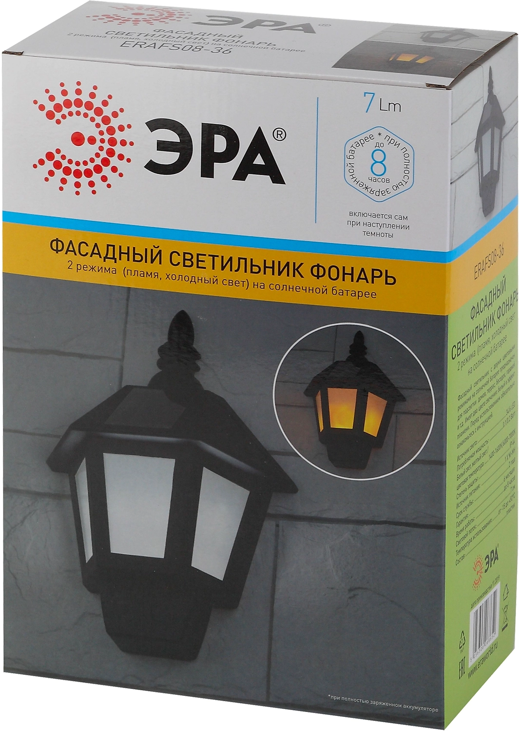 Фасадный светильник с двумя цветовыми режимами на солнечной батарее предназначен для подсветки домов, террас, беседок, гаражей и т.д. Имеет два цвета свечения: белый и эффект пламени.