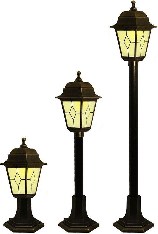 Садово-парковый светильник столб- один из трех светильников серии эконом-класса Riga, выполненный в цвете черное золото. Светильники этой серии выделяются среди других строгим классическим стилем и гармоничными пропорциями. Отличительная особенность серии Riga это то, что Вы всегда сможете подобрать для себя оптимальный размер светильника, так как линейка представлена в трех размерах: 39см, 65 см и 96см. Корпус светильника изготовлен из ударопрочного пластика. Материал рассеивателя: матовый ударопрочный пластик с рисунком. В светильнике имеется монтажный разъем для быстрого соединения.