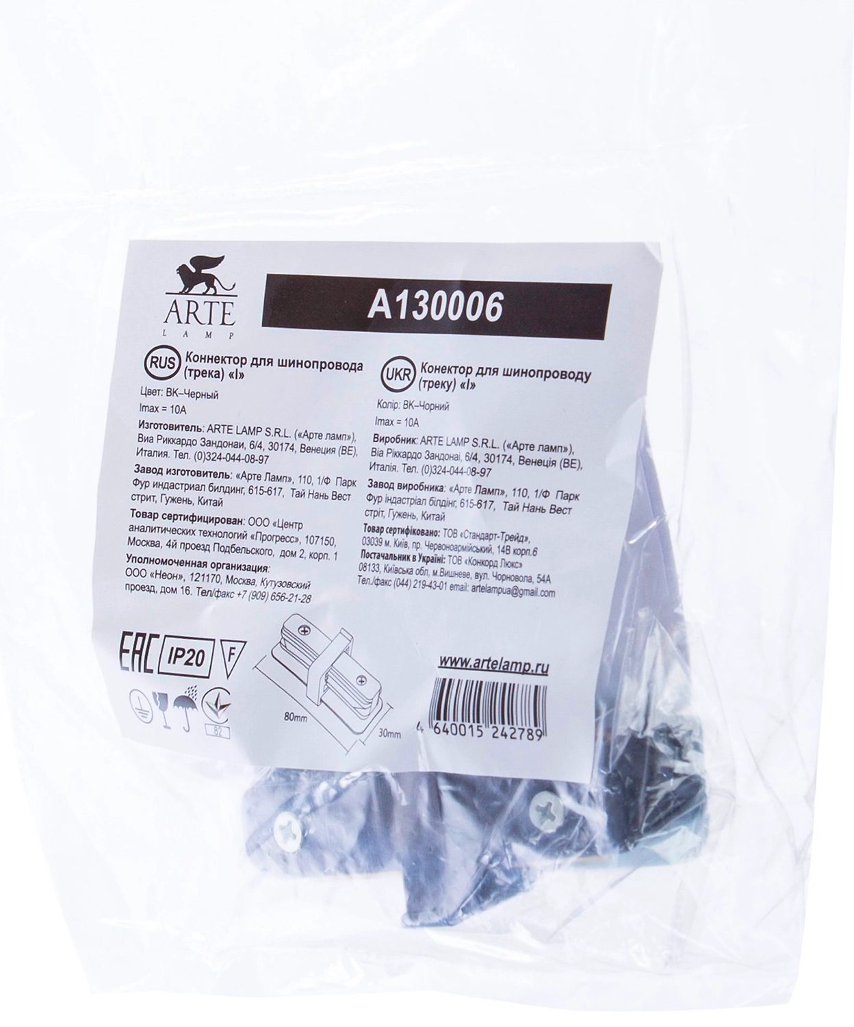 Коннектор для шинопровода ARTE Lamp A130006 8 см черный