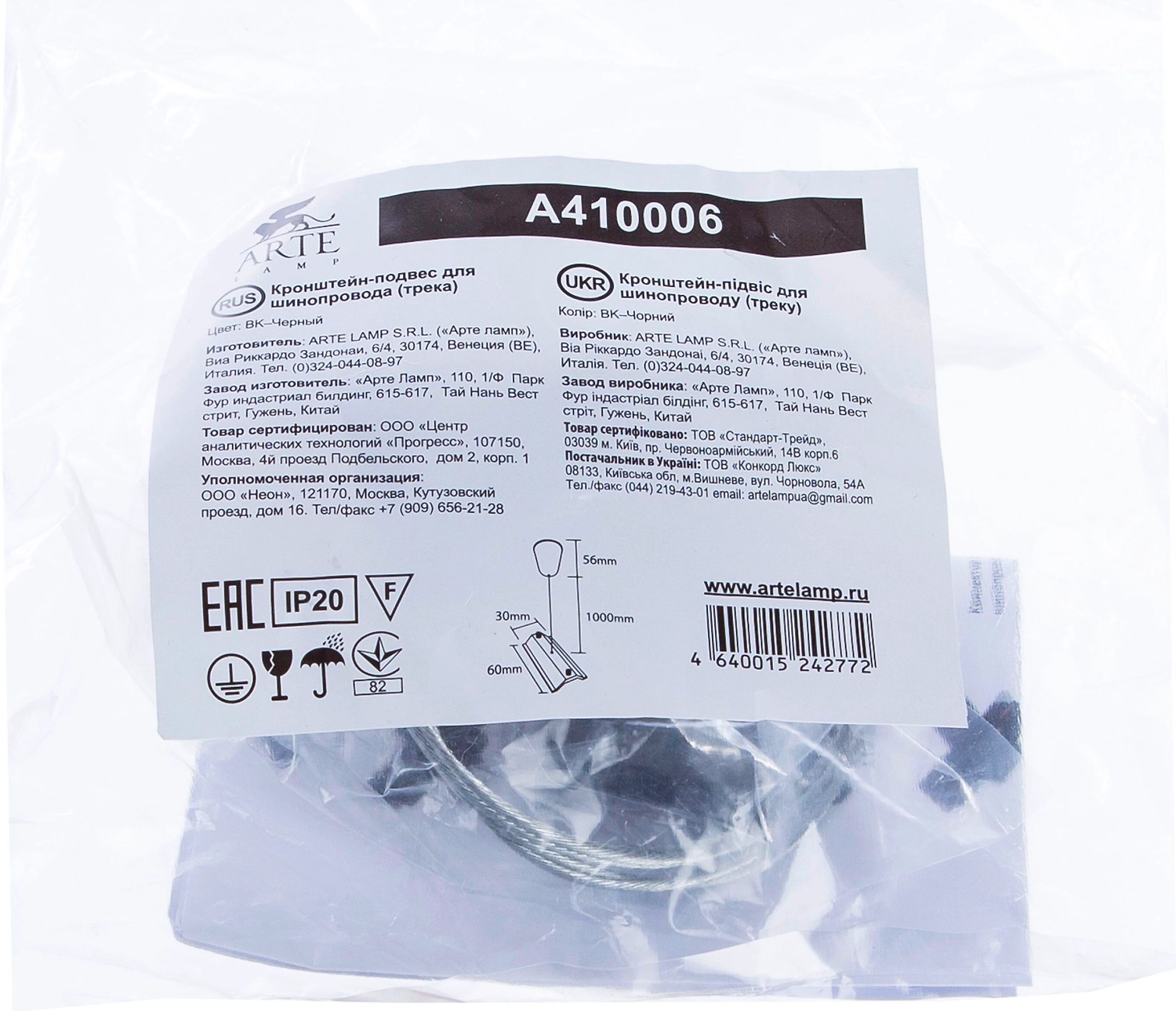 Подвес для шинопровода ARTE Lamp A410006 6x3 см черный