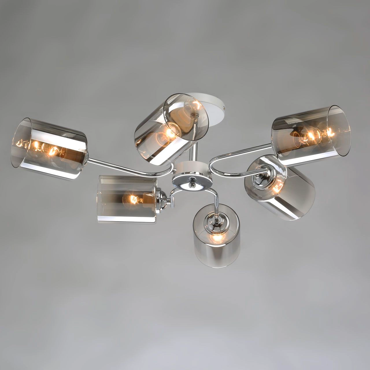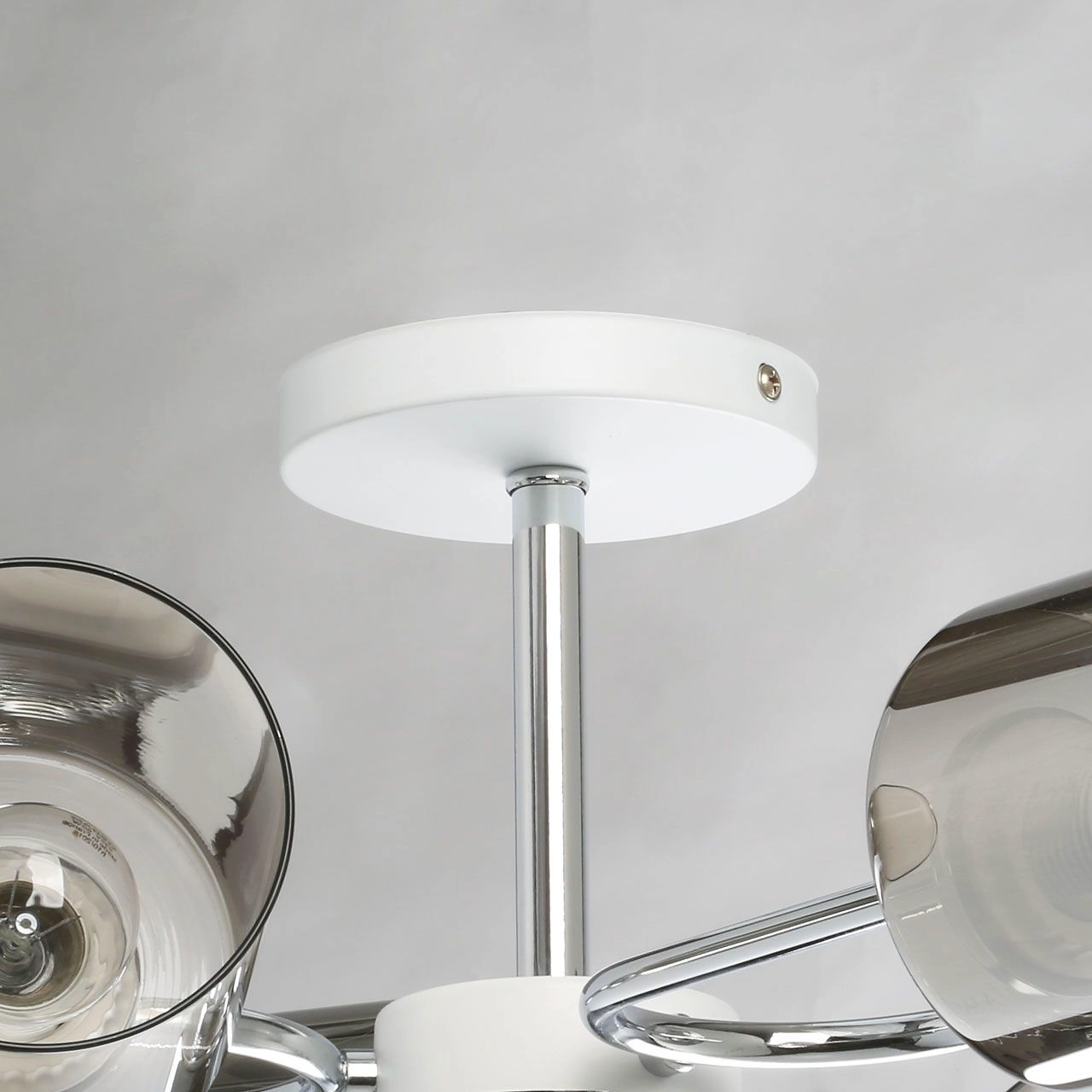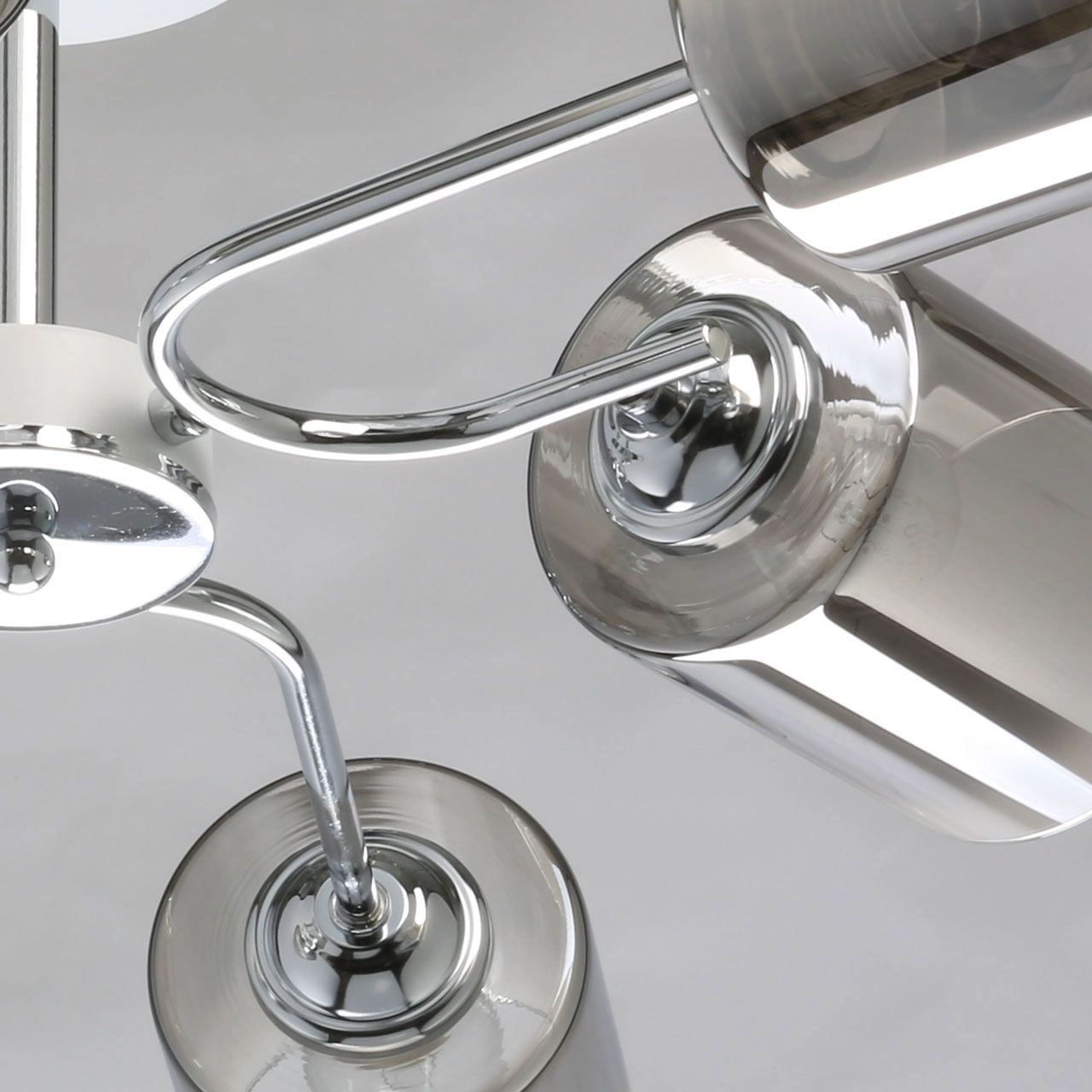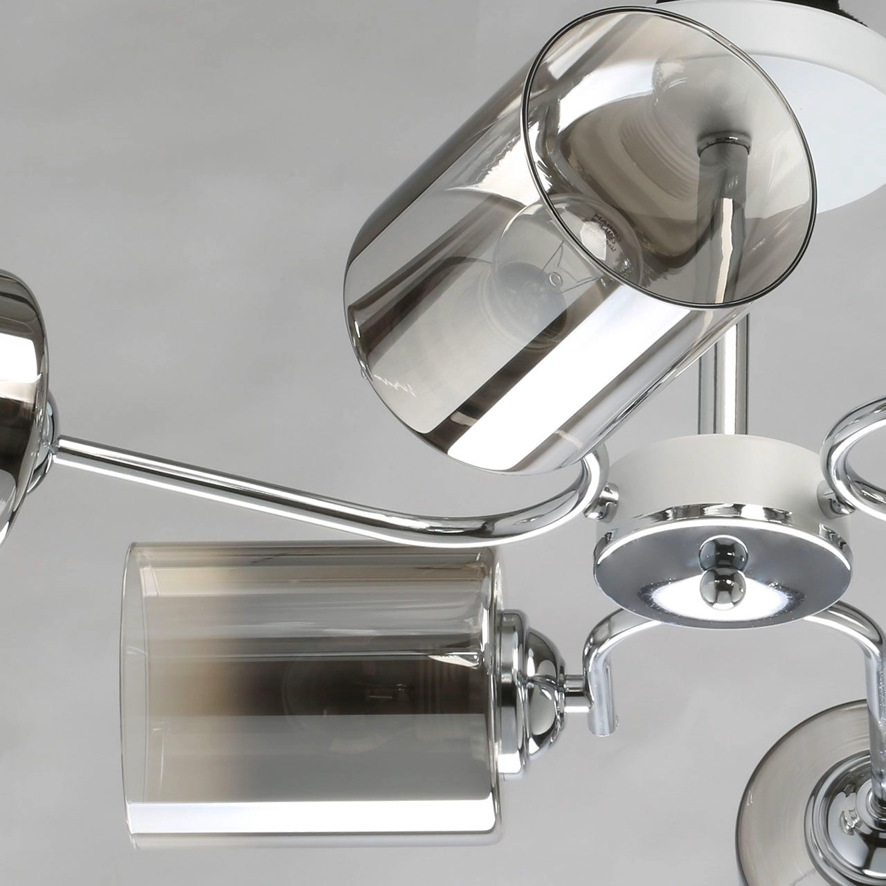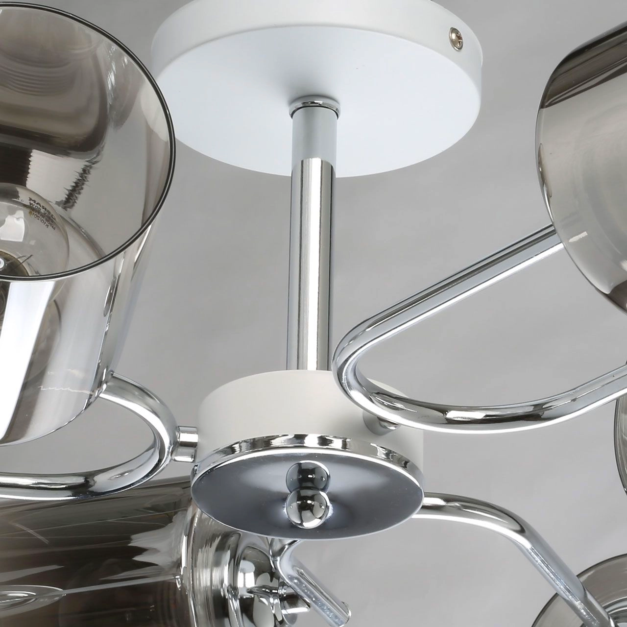 Металлическое основание потолочного светильника гальванизировано в цвет хрома. Отдельные элементы окрашены в белый цвет. Стеклянные плафоны градиентно гальванизированы в дымчатый цвет, насыщенность цвета уменьшается от места крепления плафона.