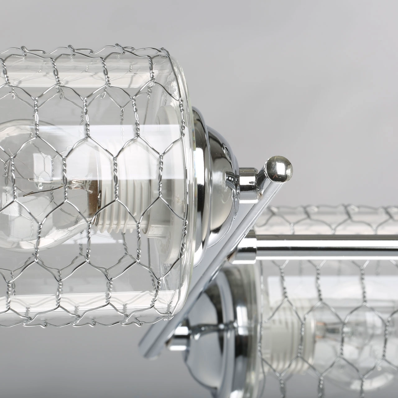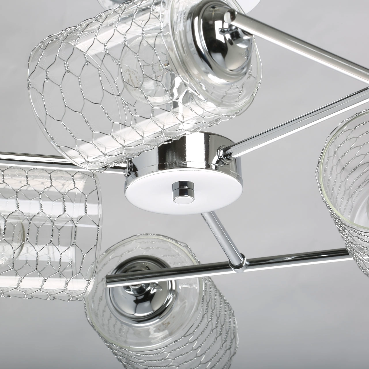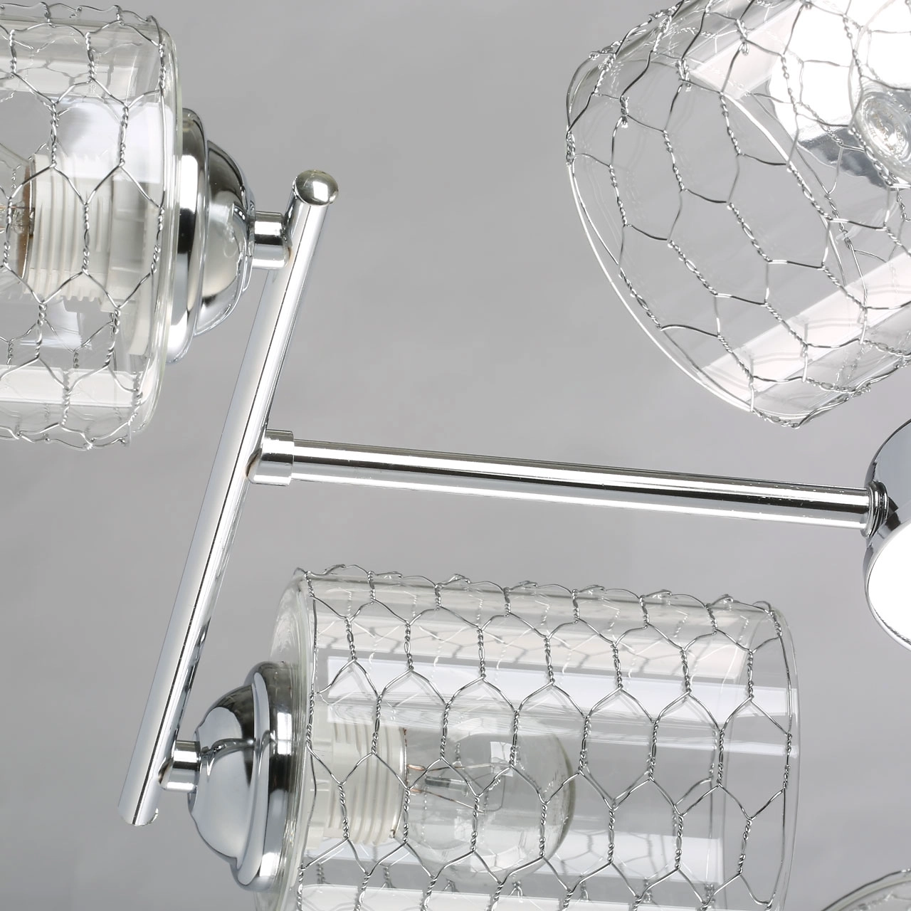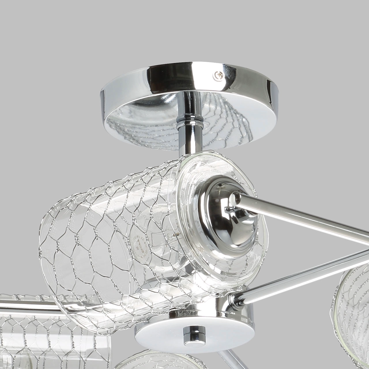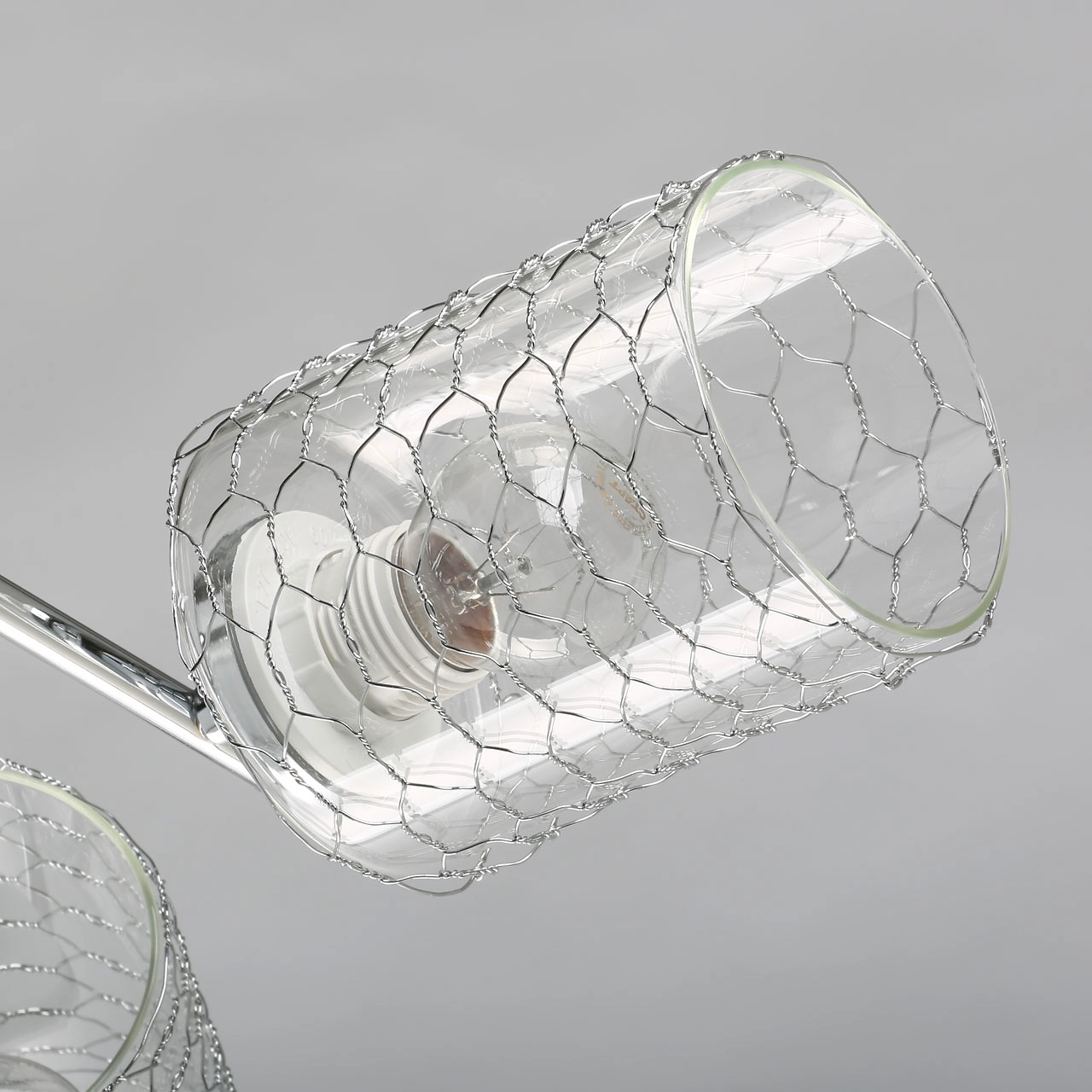 Металлическое основание потолочного светильника гальванизировано в цвет хрома. Прозрачные стеклянные плафоны оплетены сеткой в виде сот.
