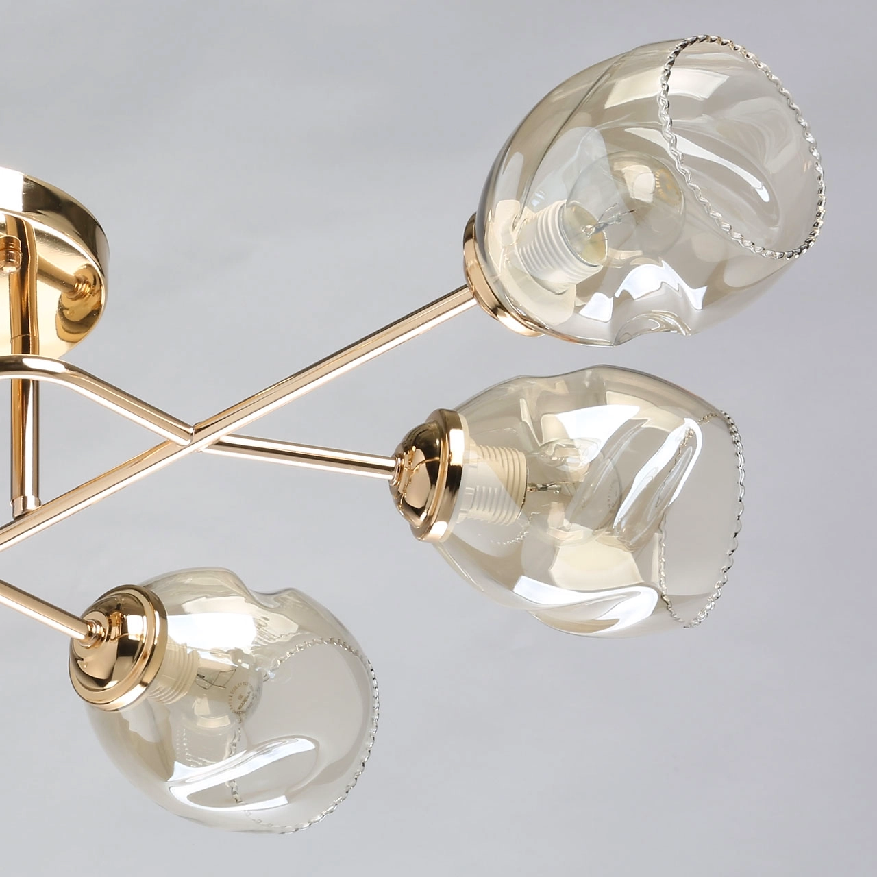 Металлическое основание потолочного светильника гальванизировано в цвет золота. Стеклянные плафоны отлиты в сложную форму и гальванизированы в цвет шампань.