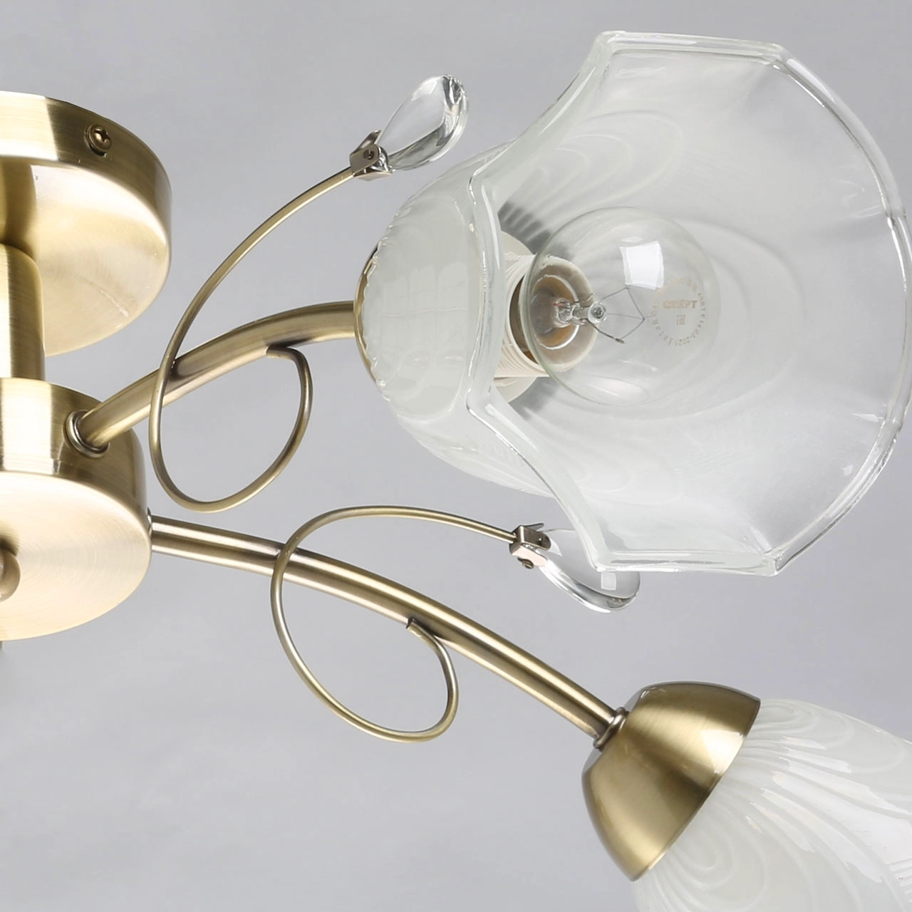 Металлическое основание потолочного светильника гальванизировано в цвет античной бронзы. Стеклянные плафоны отлиты в сложную форму и матированы.