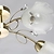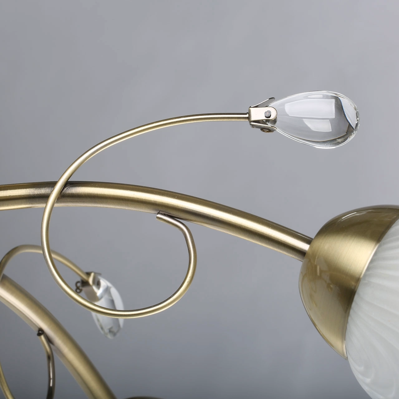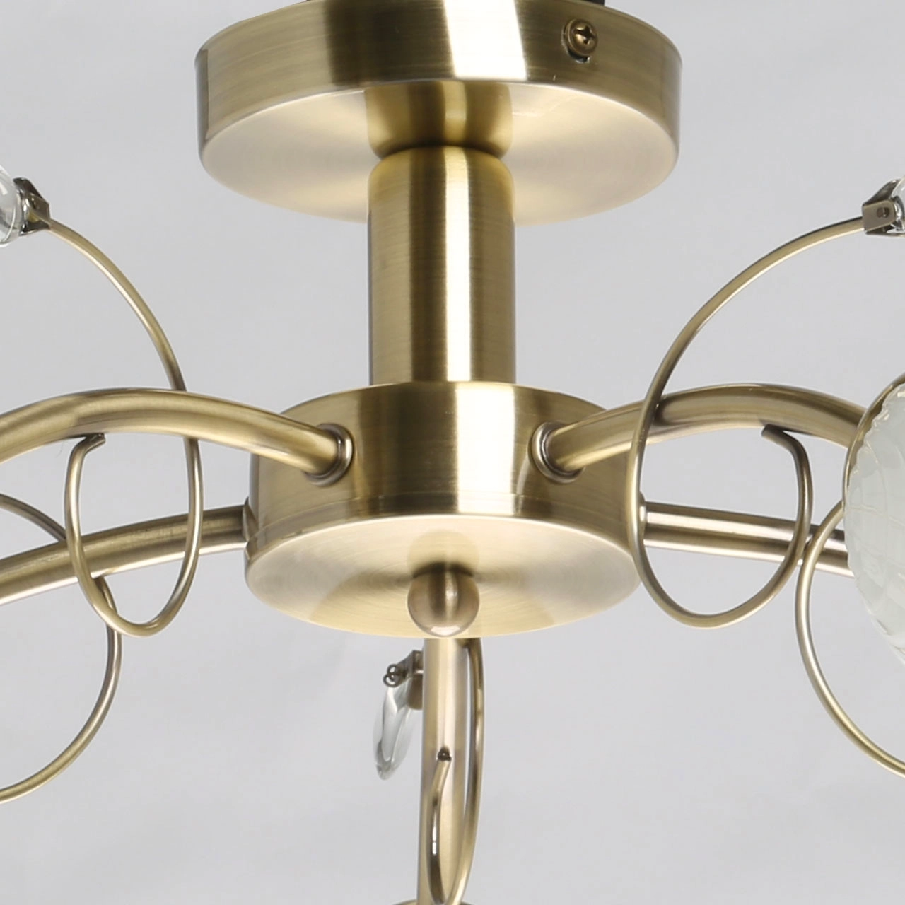 Металлическое основание потолочного светильника гальванизировано в цвет античной бронзы. Стеклянные плафоны отлиты в сложную форму и матированы. Светильник декорирован хрустальным стеклом миндальной формы.