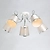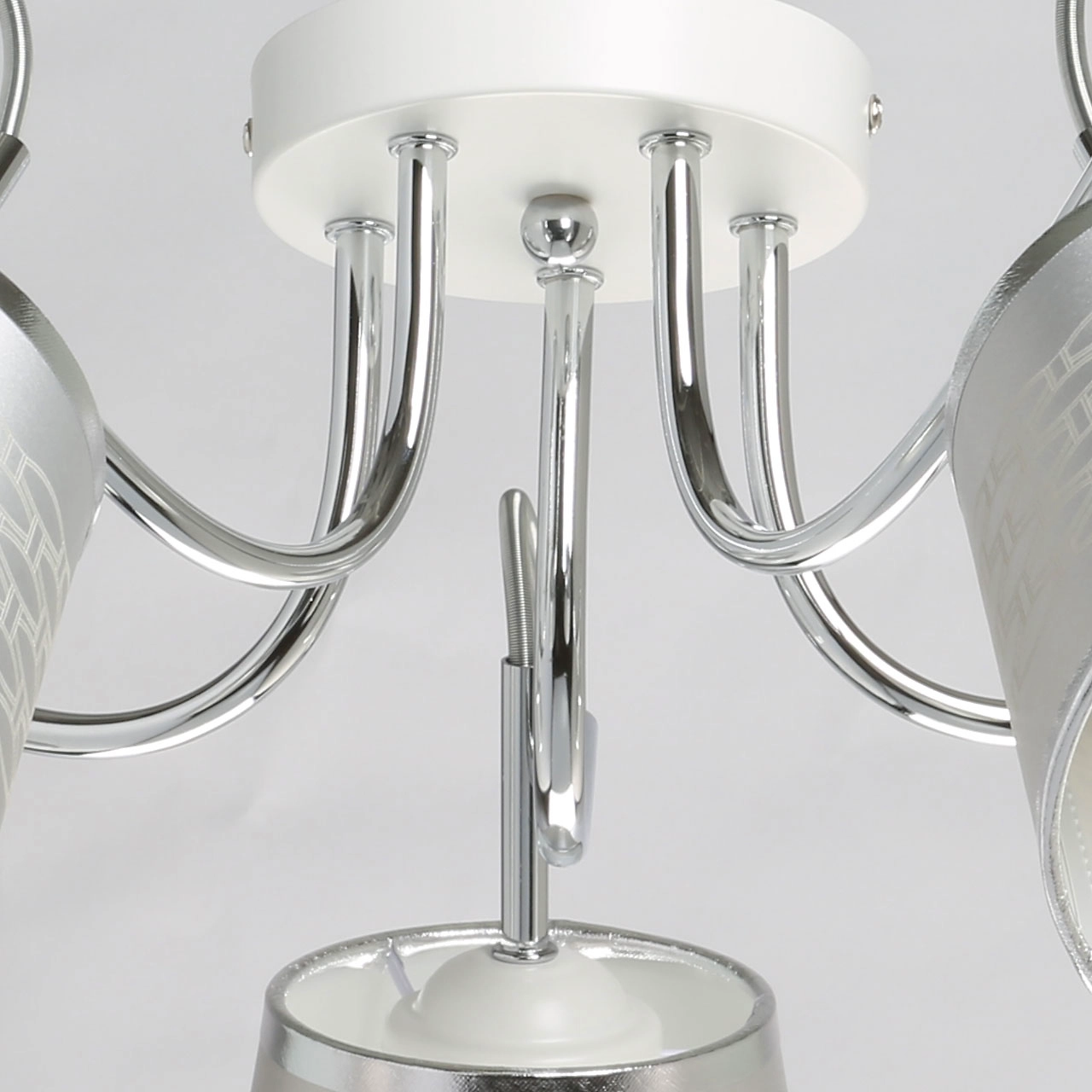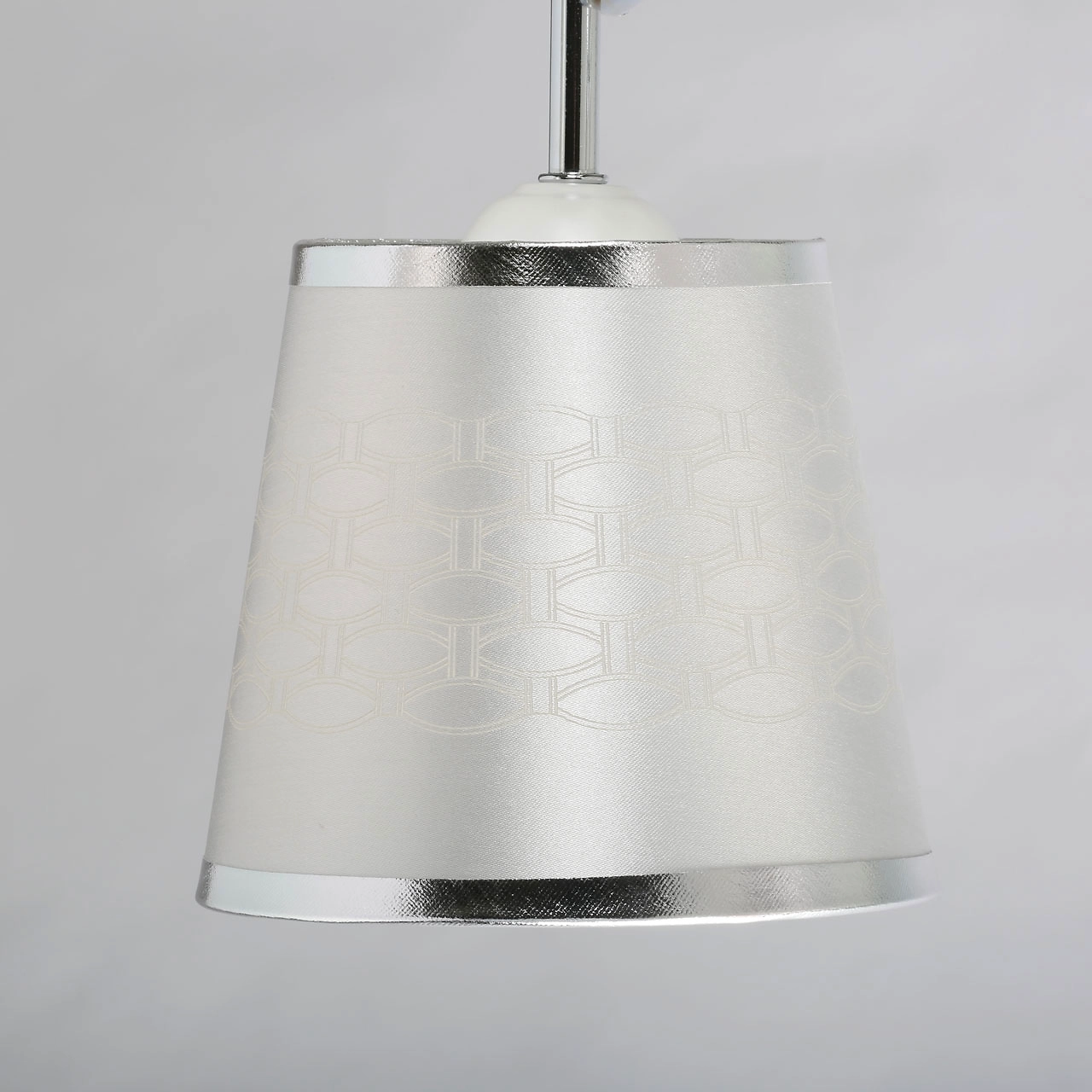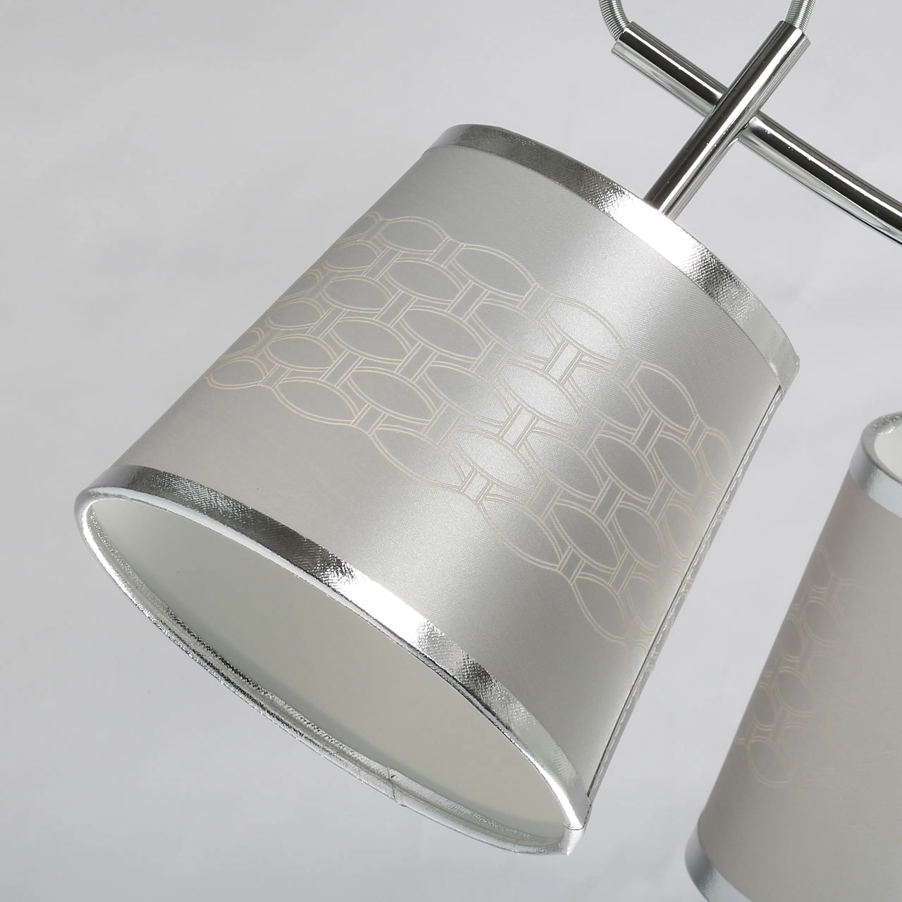 Металлическое основание потолочного светильника гальванизировано в цвет хрома. Отдельные элементы окрашены в белый цвет. Двухслойные текстильные абажуры выполнены из белого текстиля с геометрическим рисунком и термостойкого прозрачного акрила с внутренней стороны.