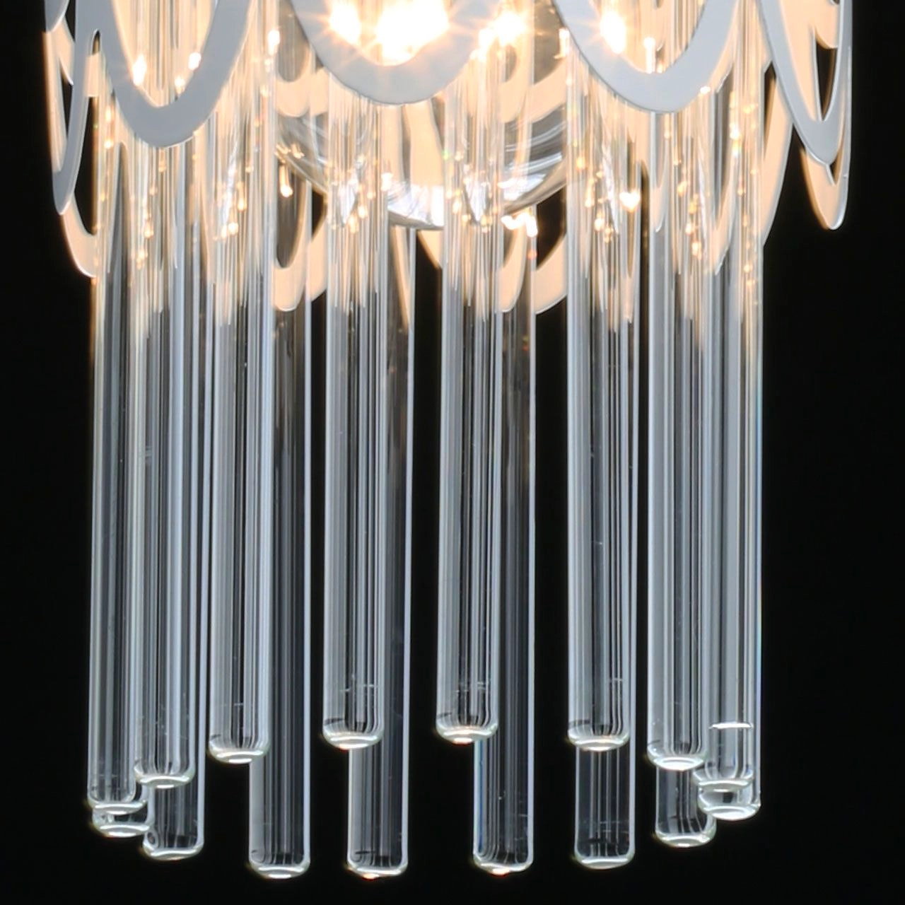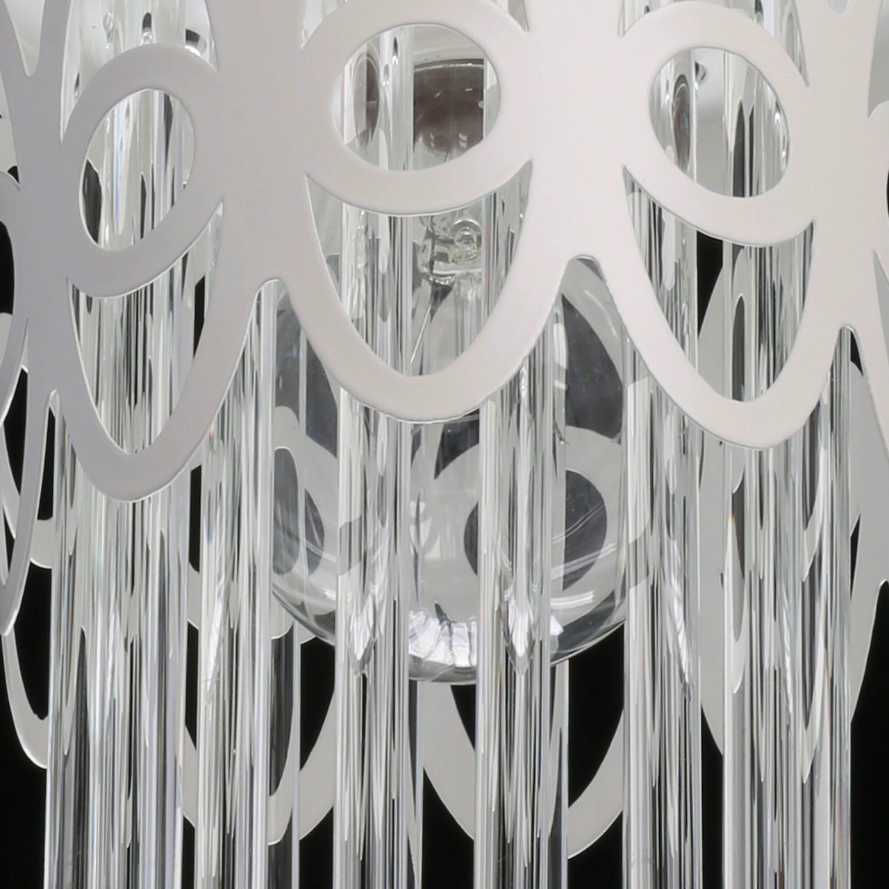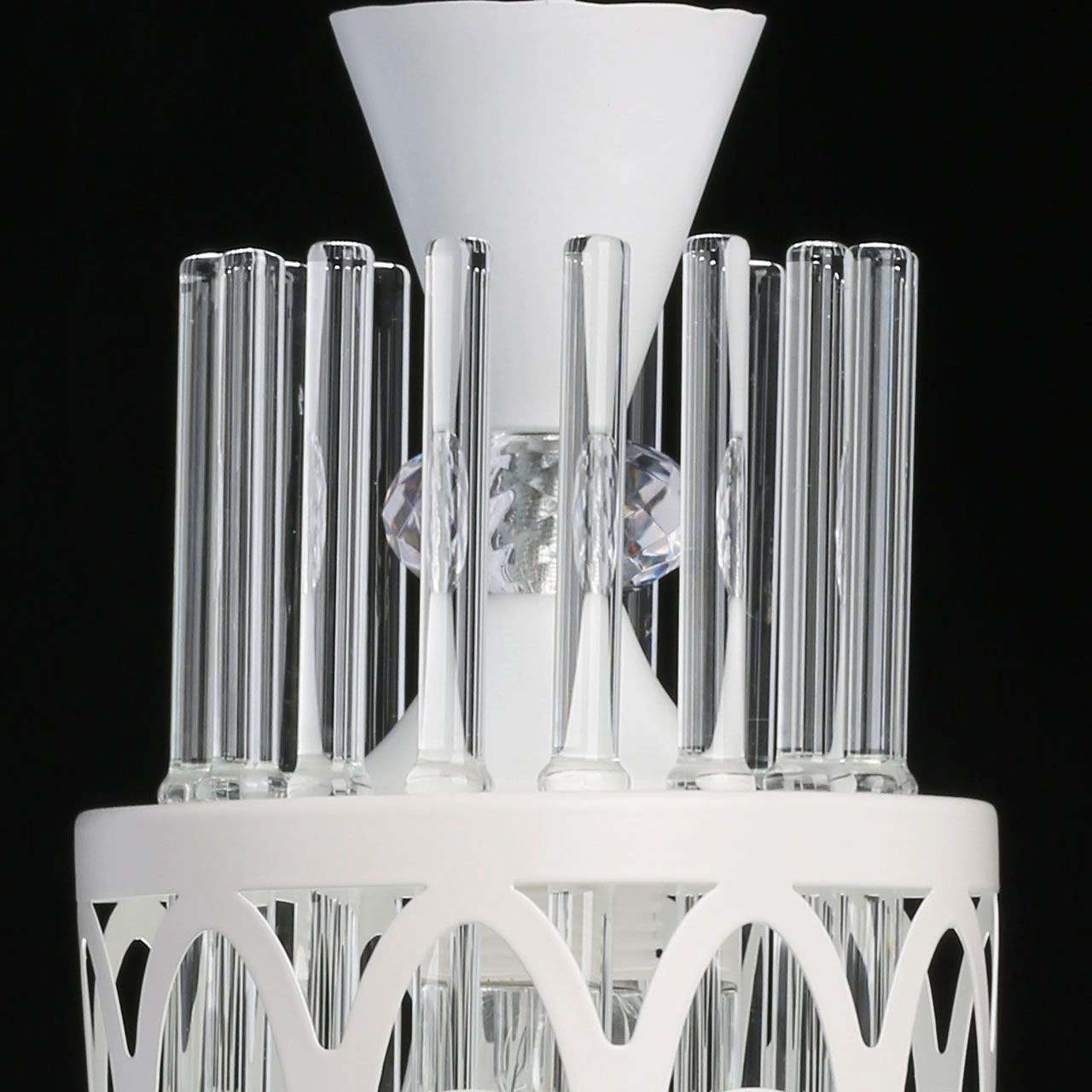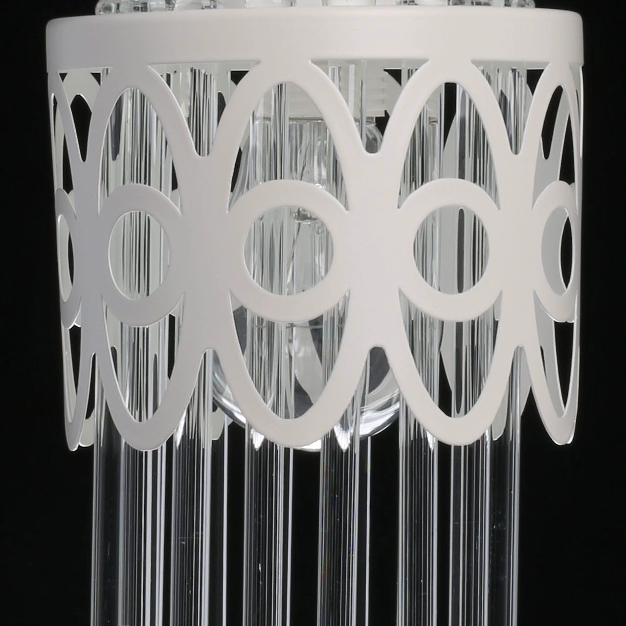 Металлическое основание и плафон подвесного светильника окрашены в белый цвет. Декор выполнен из прозрачного стекла.