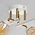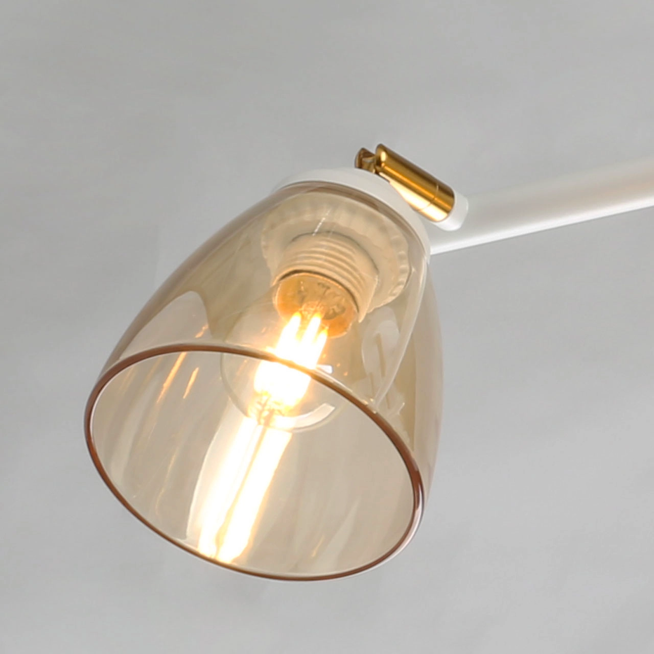 Металлическое основание потолочного светильника окрашено в белый цвет. Отдельные элементы гальванизированы в цвет матовой бронзы. Стеклянные плафоны гальванизированы в цвет шампань.