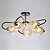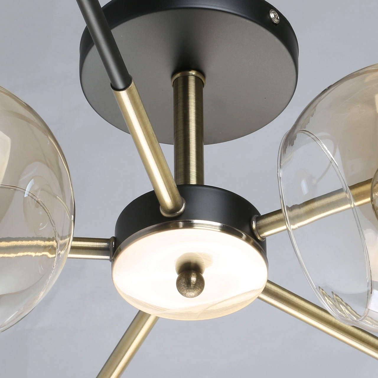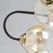 Металлическое основание потолочного светильника окрашено в черный цвет. Отдельные элементы гальванизированы в цвет бронзы. Стеклянные плафоны выдувные в форму гальванизированы в цвет шампань.