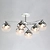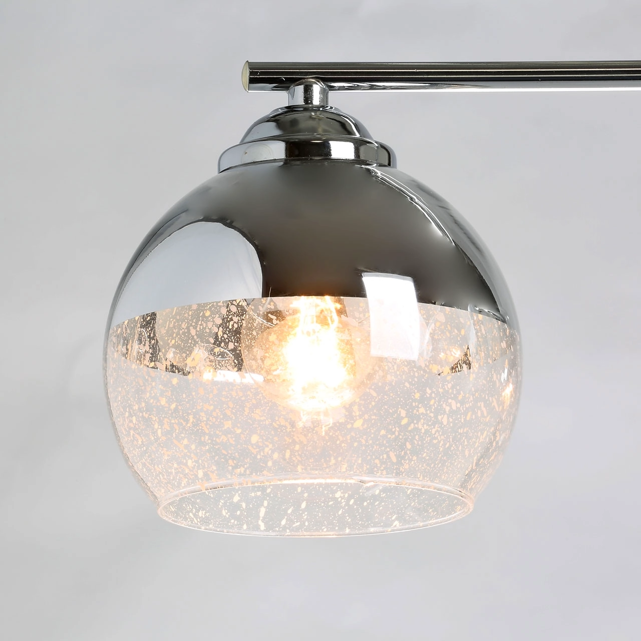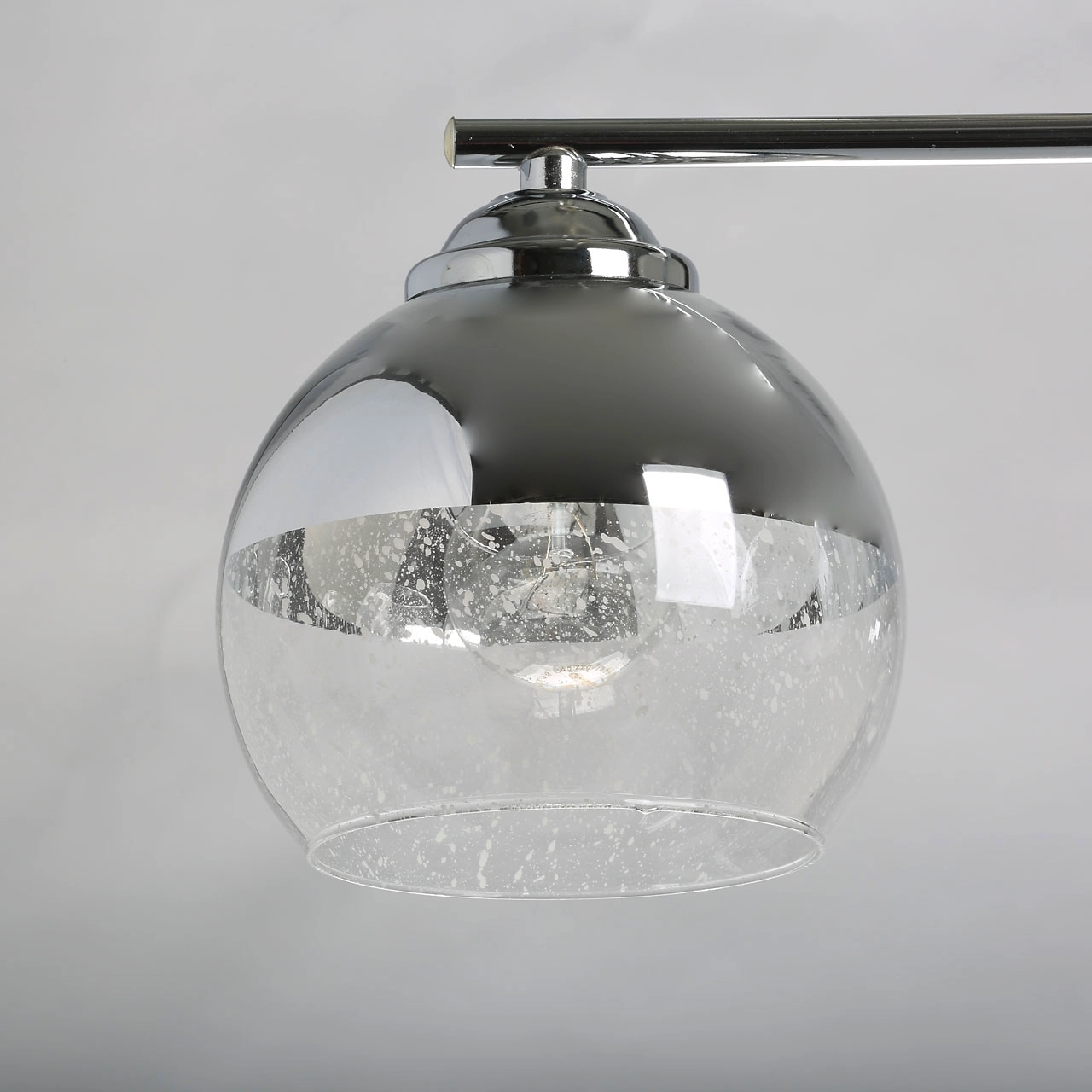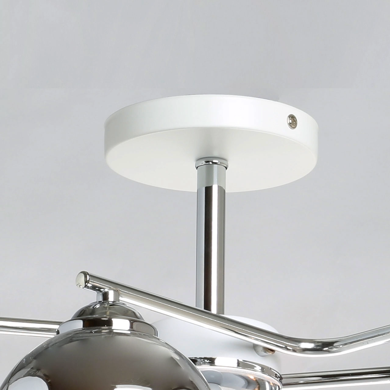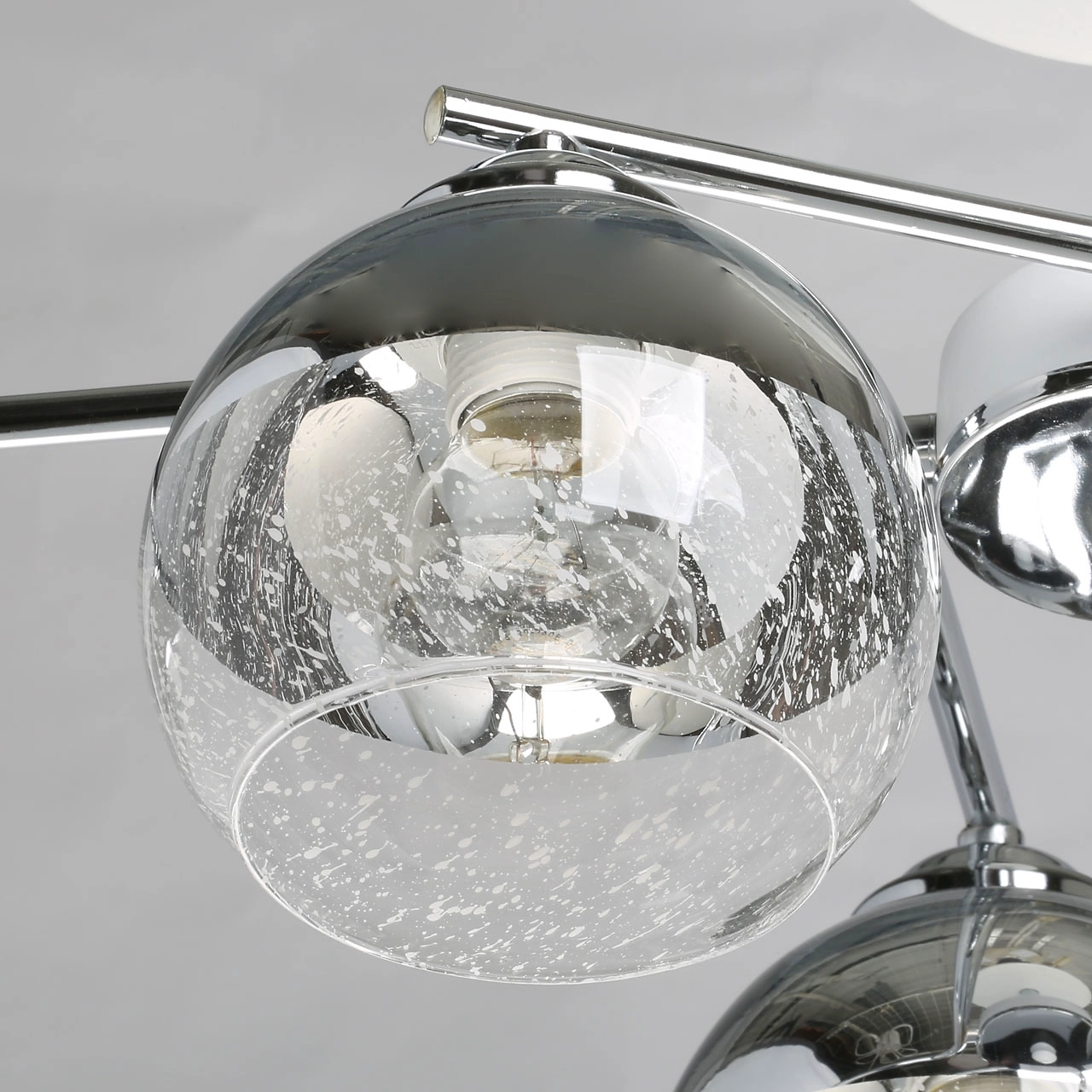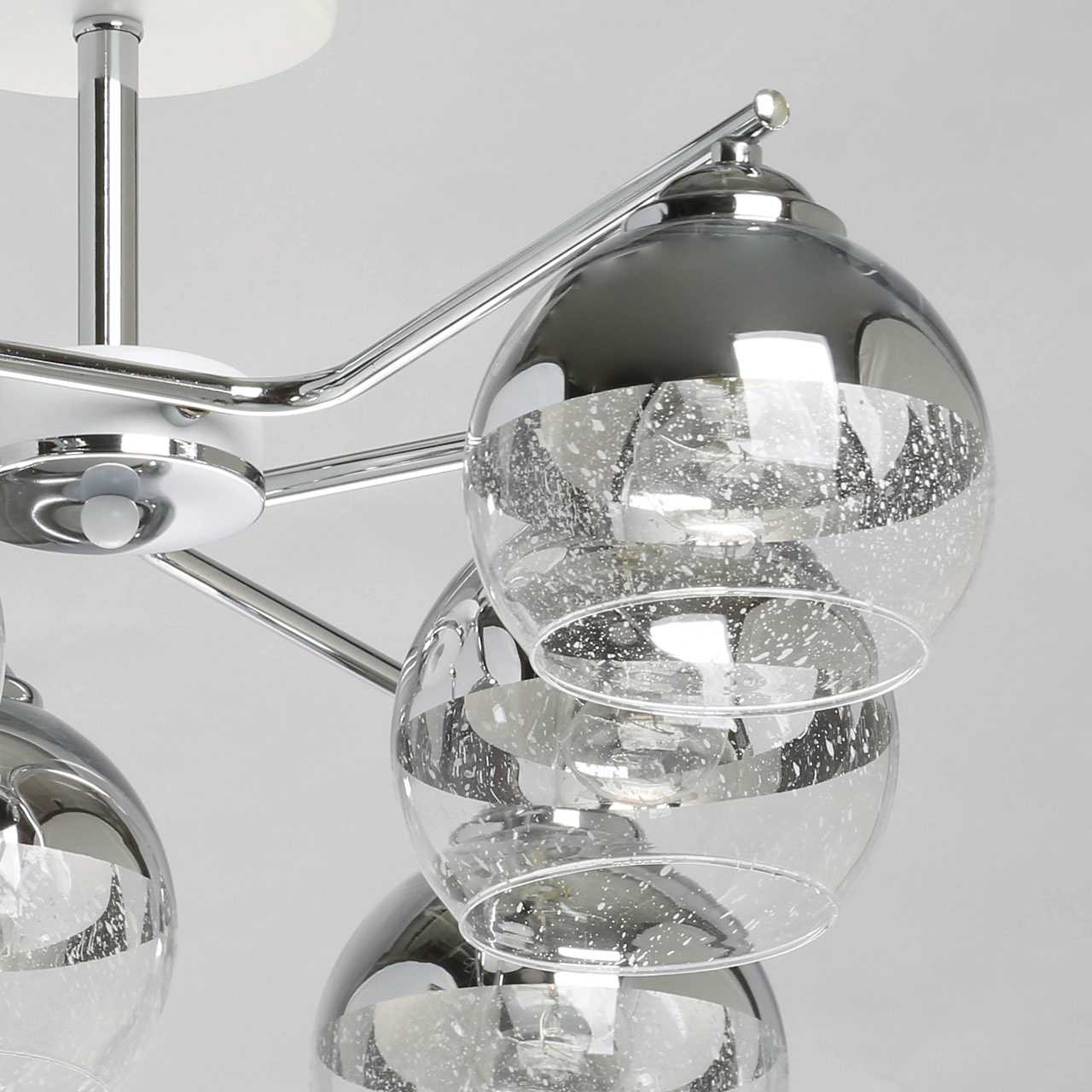 Металлическое основание потолочного светильника гальванизировано в цвет хрома. Потолочная чаша окрашена в белый цвет. Светильник декорирован прозрачными стеклянными плафонами, гальванизированными в цвет хрома у основания.