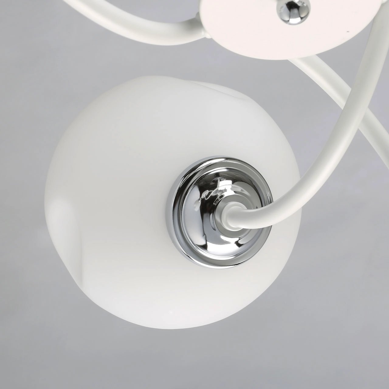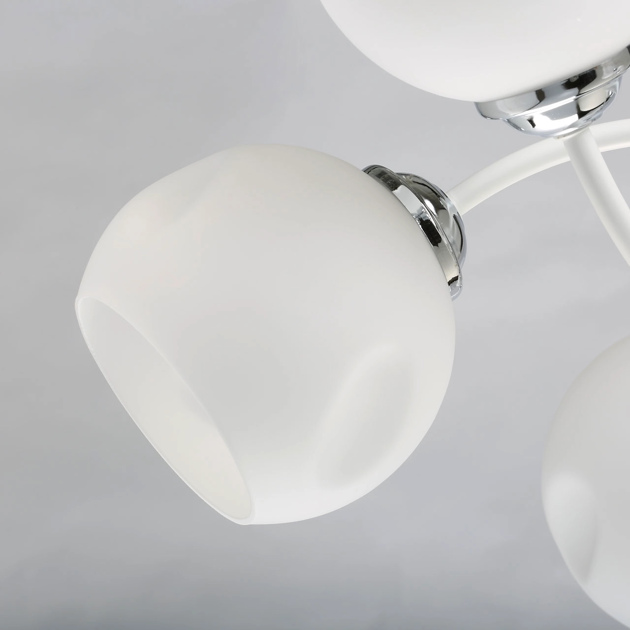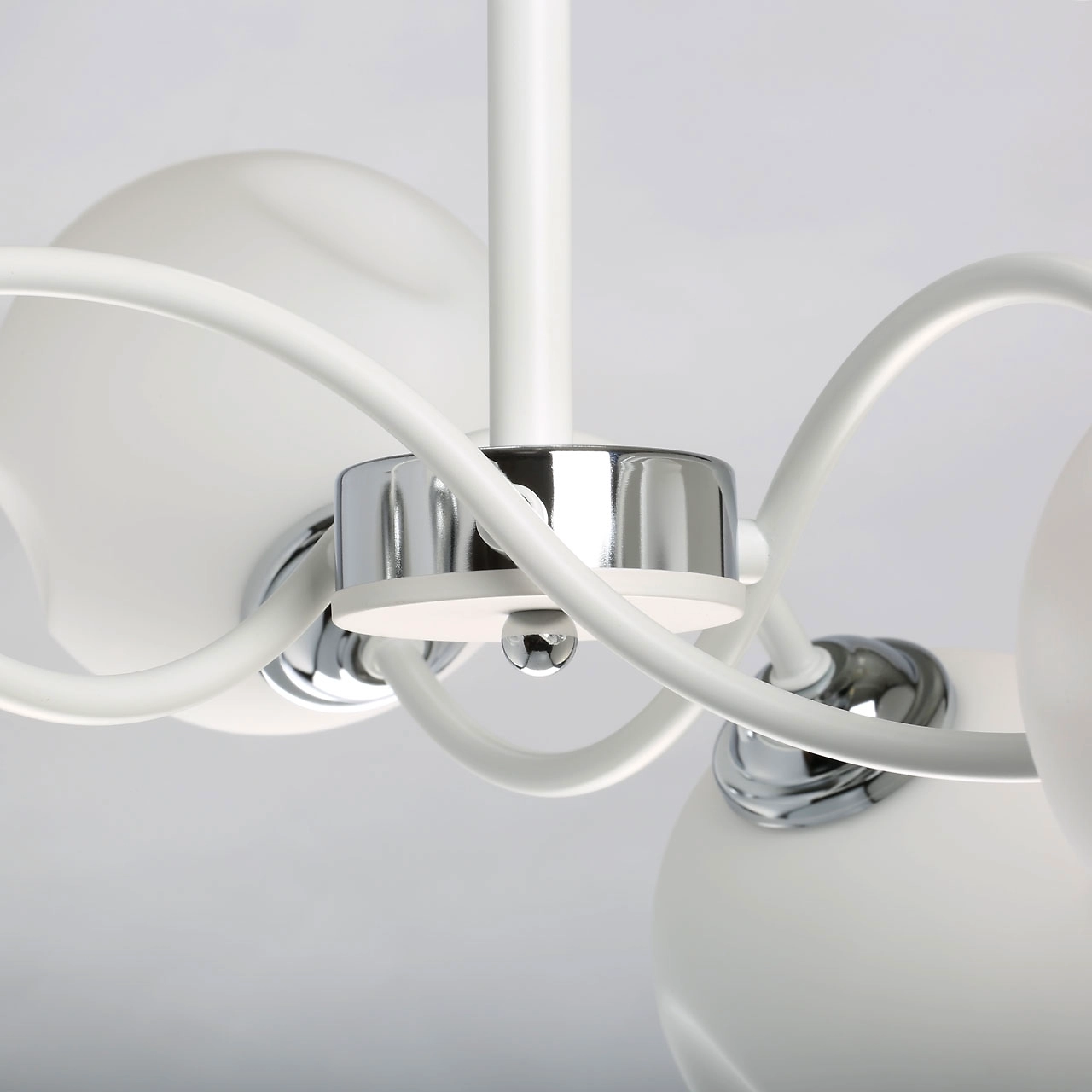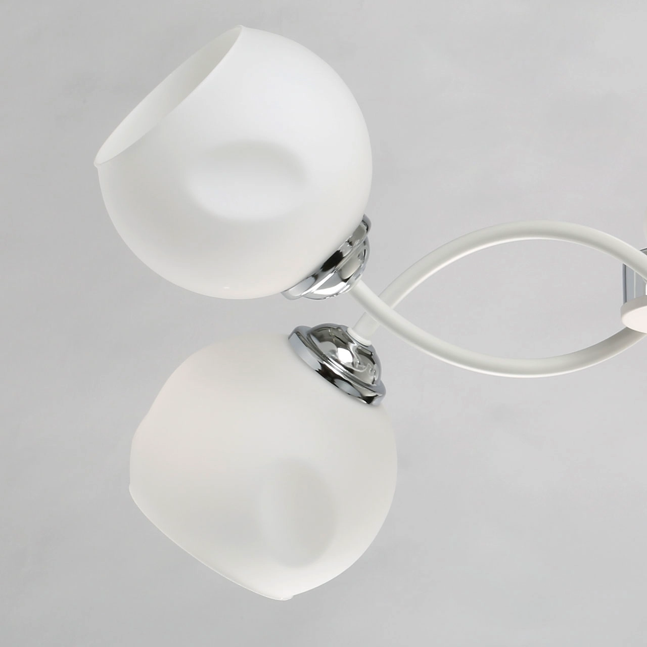 Металлическое основание потолочного светильника окрашено в белый цвет. Отдельные элементы гальванизированы в цвет хрома. Стеклянные плафоны выдуваются в сложную форму и матируются.