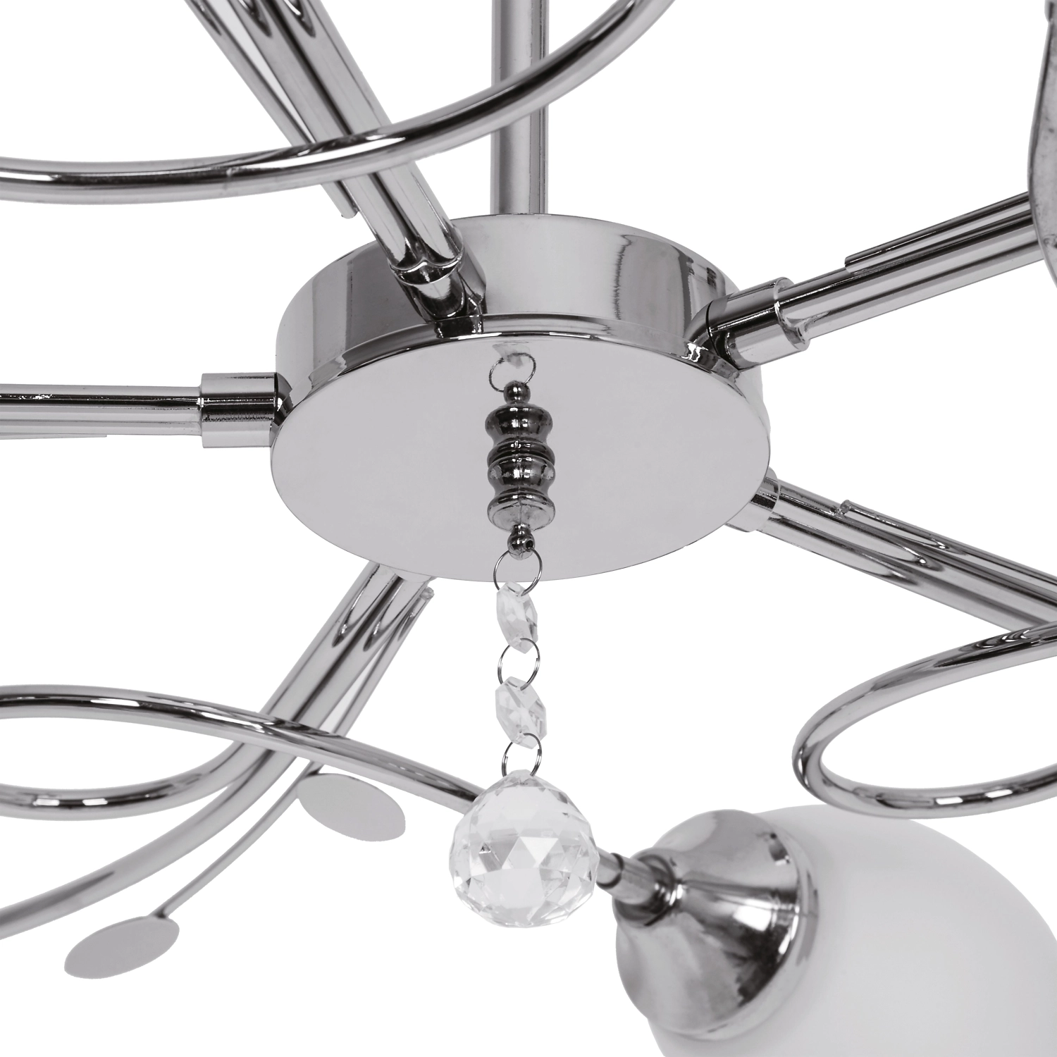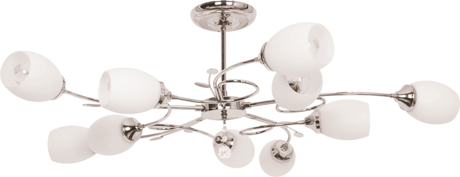 Потолочная люстра имеет изящно изогнутый каркас с декором, напоминающим растительные мотивы. Флористическую тему поддерживают 10 аккуратных стеклянных плафонов, стилизованных под бутоны цветов. Хрустальная подвеска преломляет свет, украшает помещение игрой бликов.