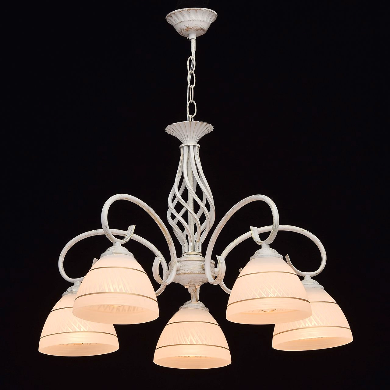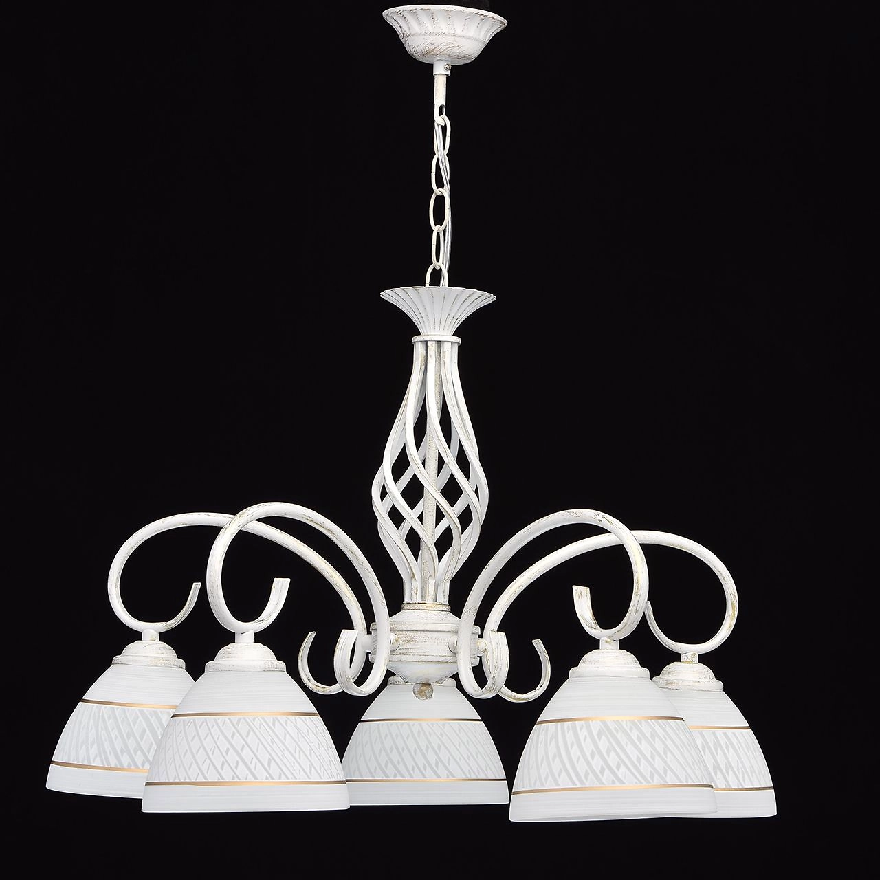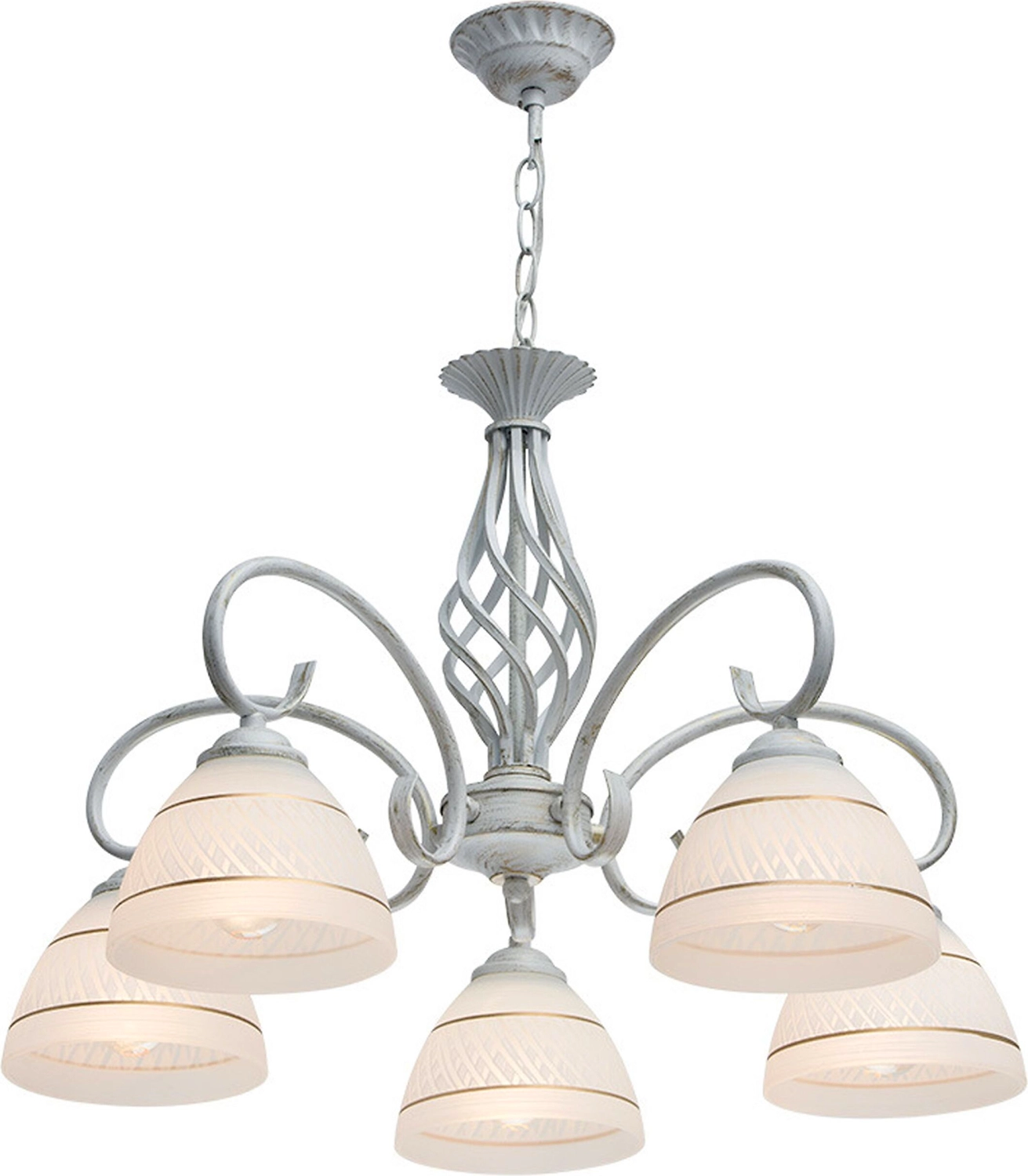 Элегантная люстра из коллекции "Ариадна" наполнит обстановку комнаты нежной красотой и уютом. Белое матовое основание из металла дополнено эффектом золотой патины. Завитки рожков идеально сочетаются со стеклянными плафонами матового белого цвета, украшенными строгим рисунком золотого тона, придающим дизайну светильника особую изюминку. Люстра имеет высокие параметры освещенности.