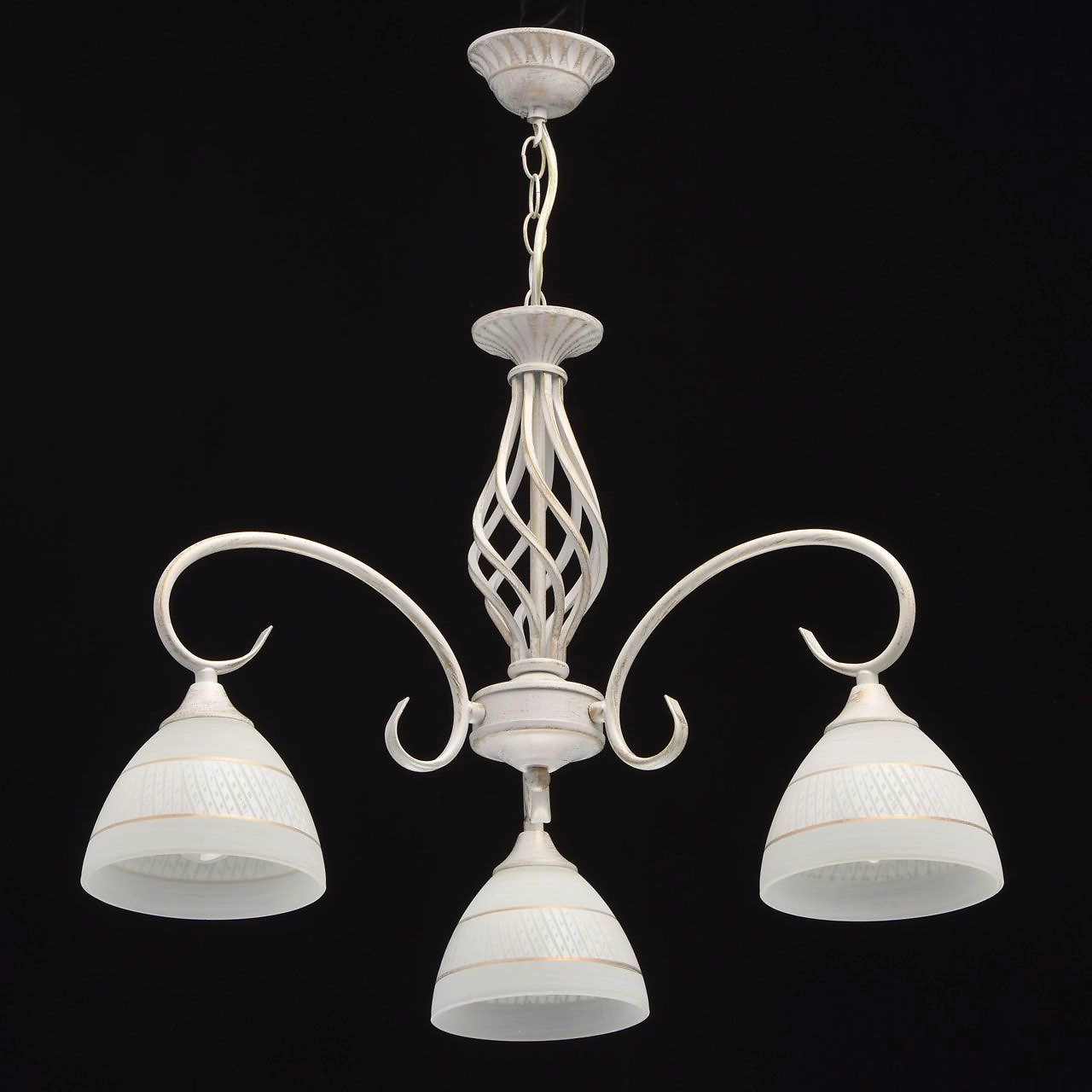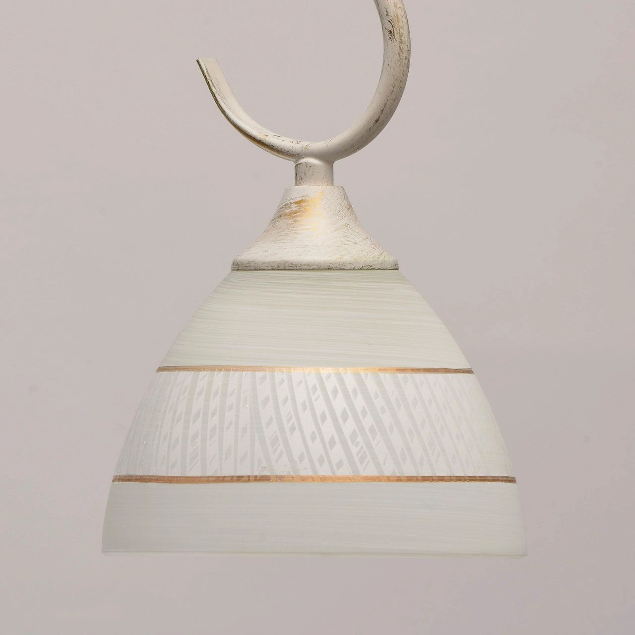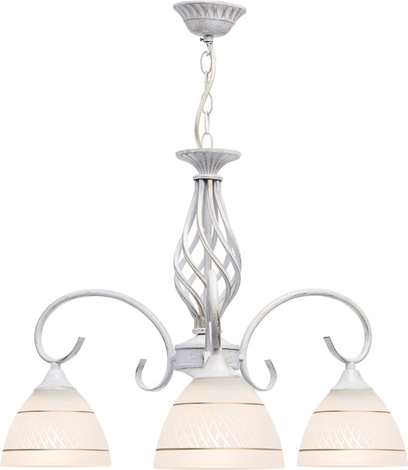 Изящная люстра из коллекции "Ариадна" станет отличным дополнением классических интерьеров. Металлическое основание нежного белого оттенка подчеркнуто эффектом патинирования в цвет золота. В золотом тоне выполнены и полоски на белых стеклянных плафонах. Особый шарм светильнику придает витой декор в центральной части.