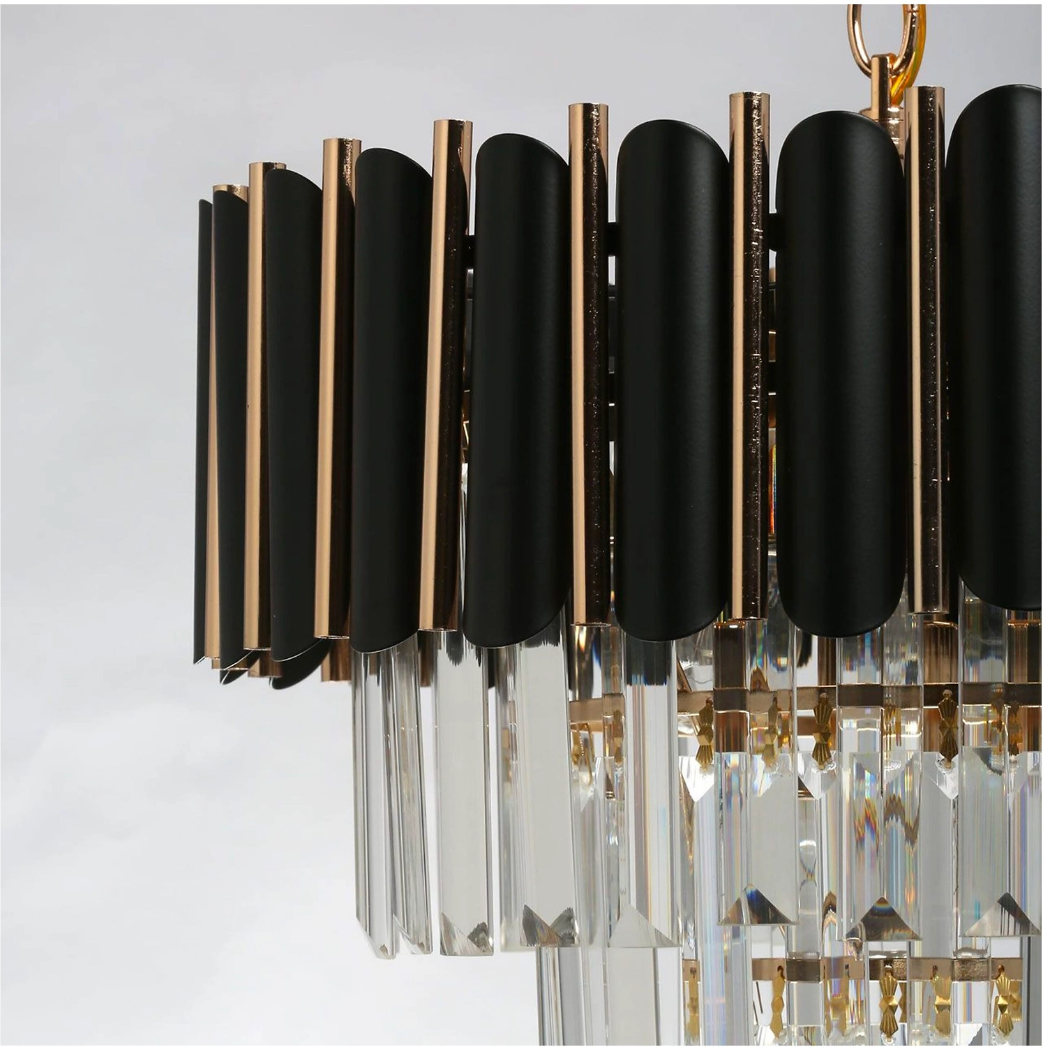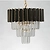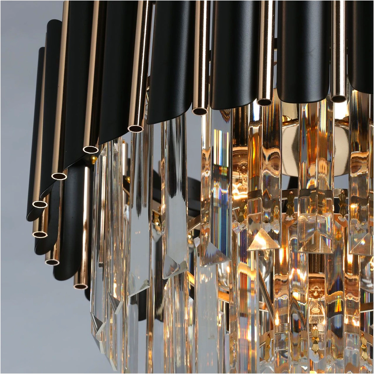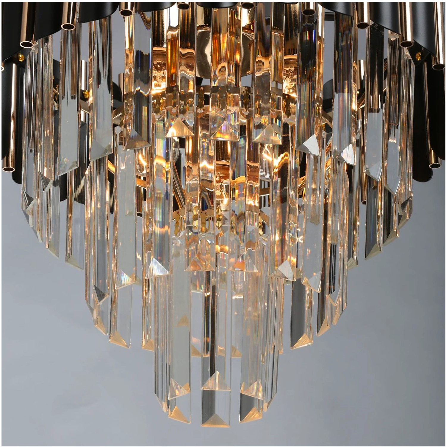 Верхний ярус люстры представляет собой совокупность металлических элементов черного и золотого цвета. Последующие ярусы состоят из хрустальных подвесок интересной трехгранной формы, которые красиво преломляют свет.