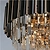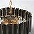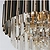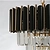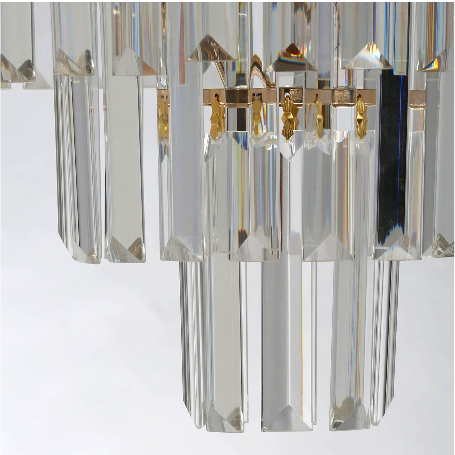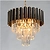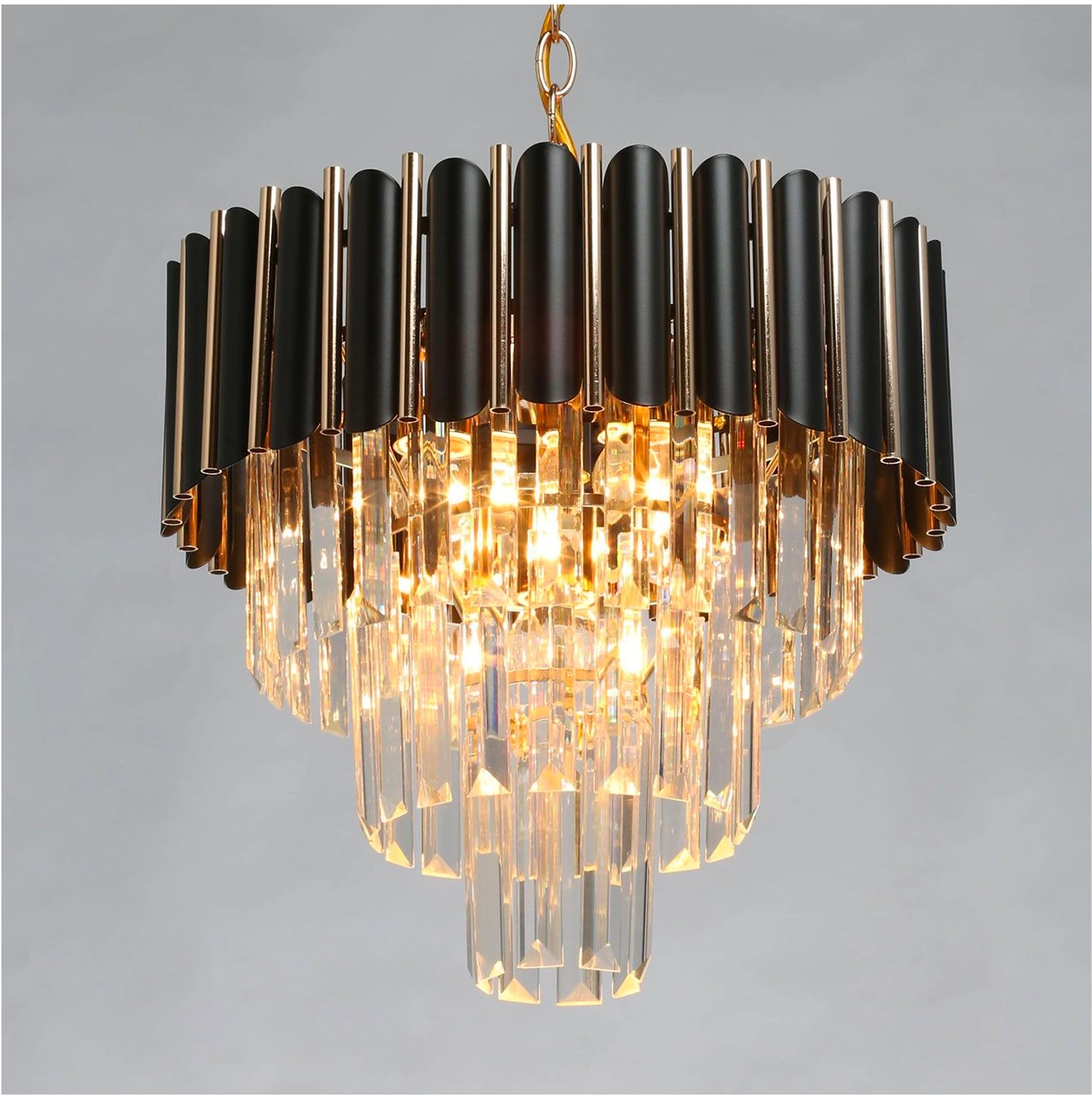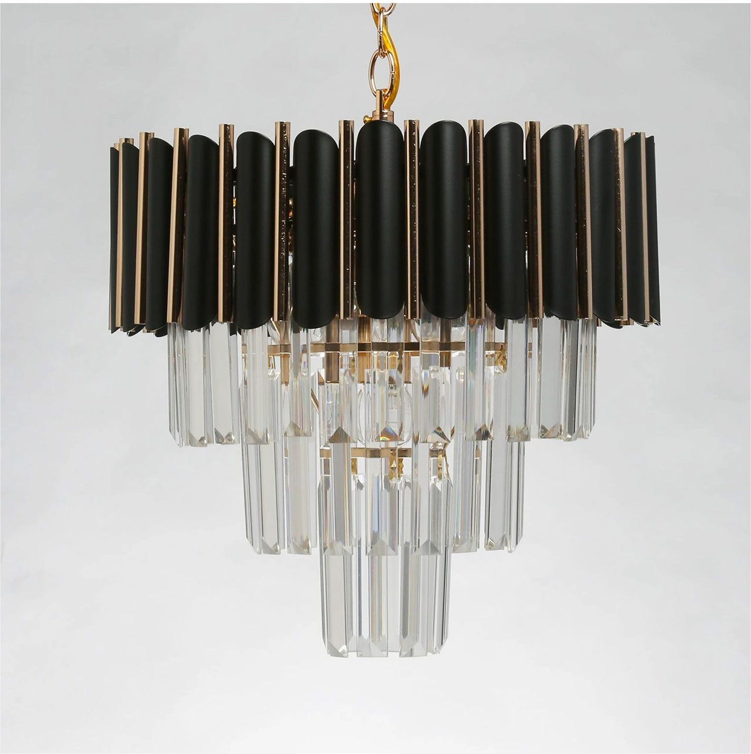 Верхний ярус люстры представляет собой совокупность металлических элементов черного и золотого цвета. Последующие ярусы состоят из хрустальных подвесок интересной трехгранной формы, которые красиво преломляют свет.