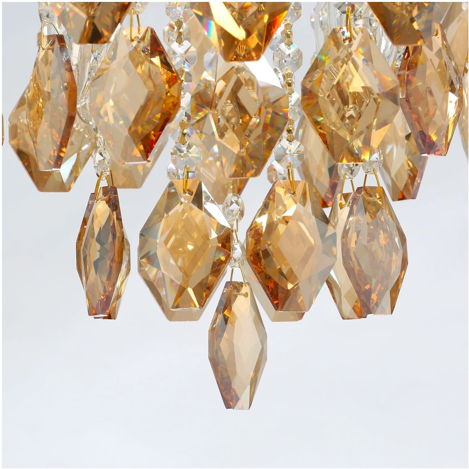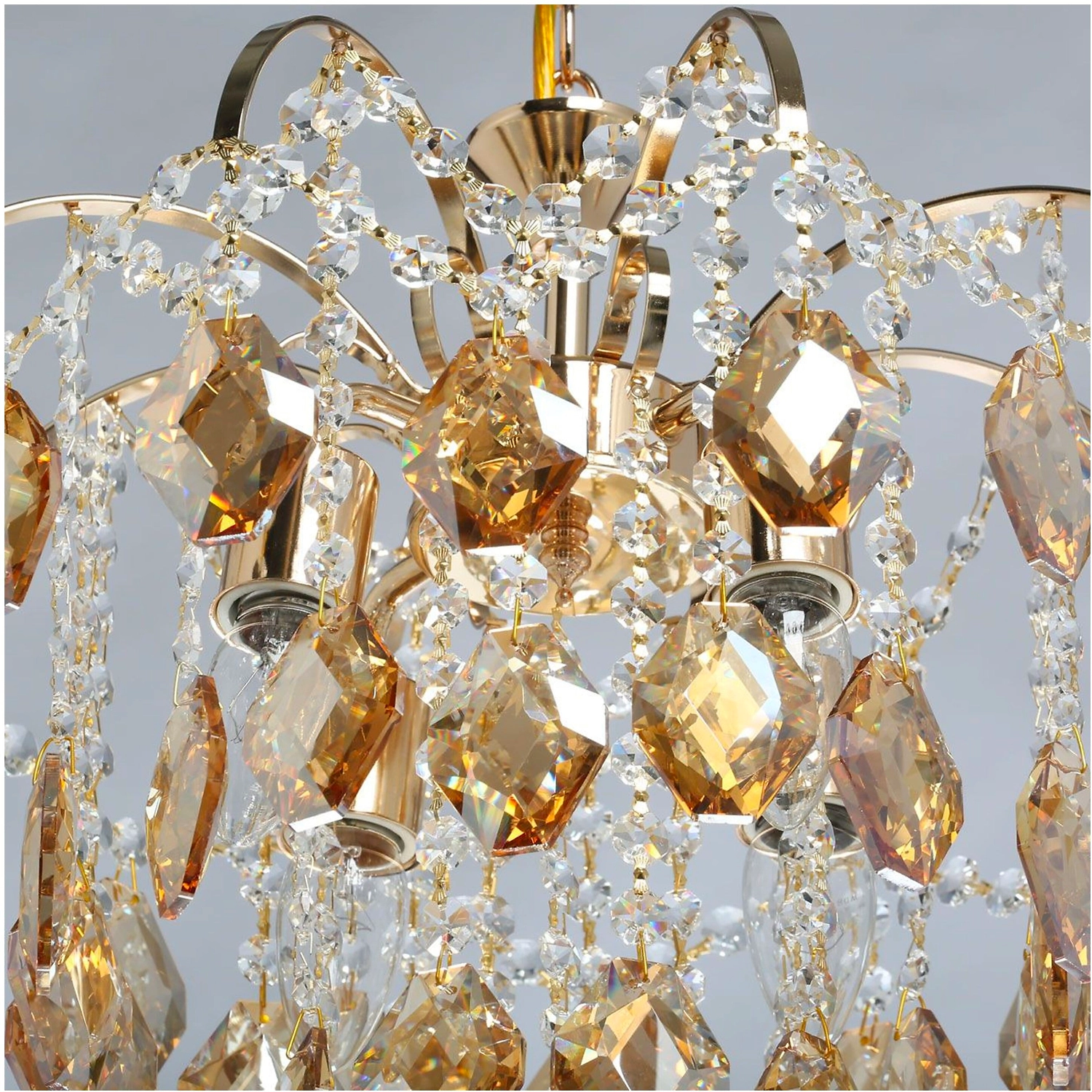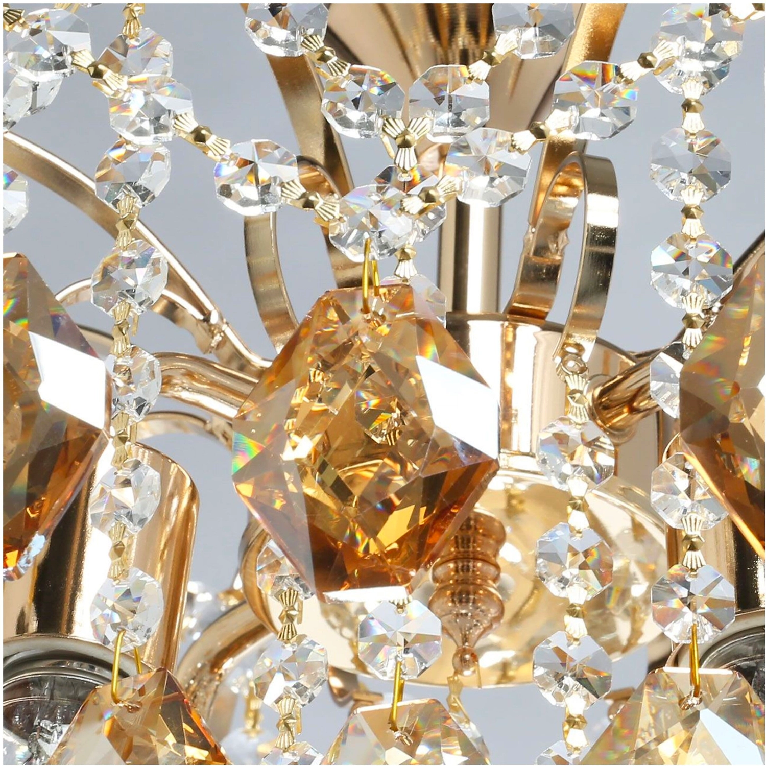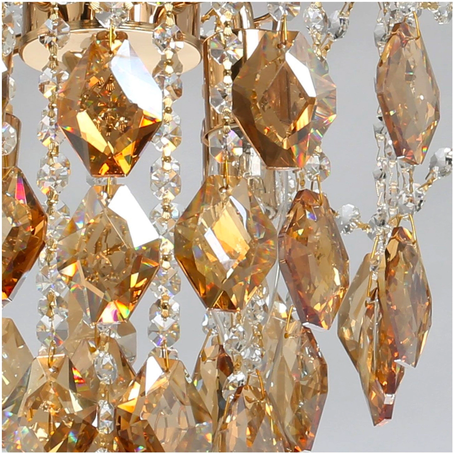 Хрустальный массивный декор янтарного цвета. Подвески из хрусталя и цепочки из прозрачных октагонов создают красивую игру света. Классический золотой цвет основания всегда в тренде.