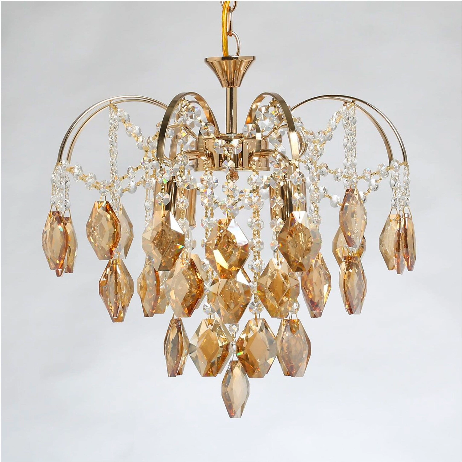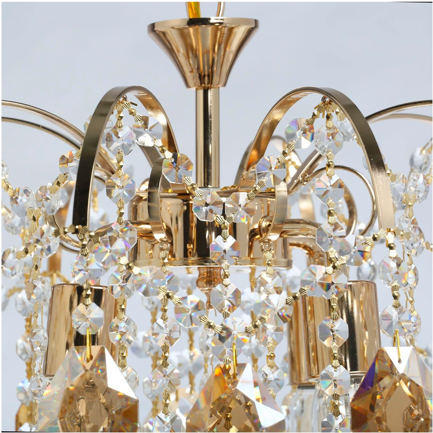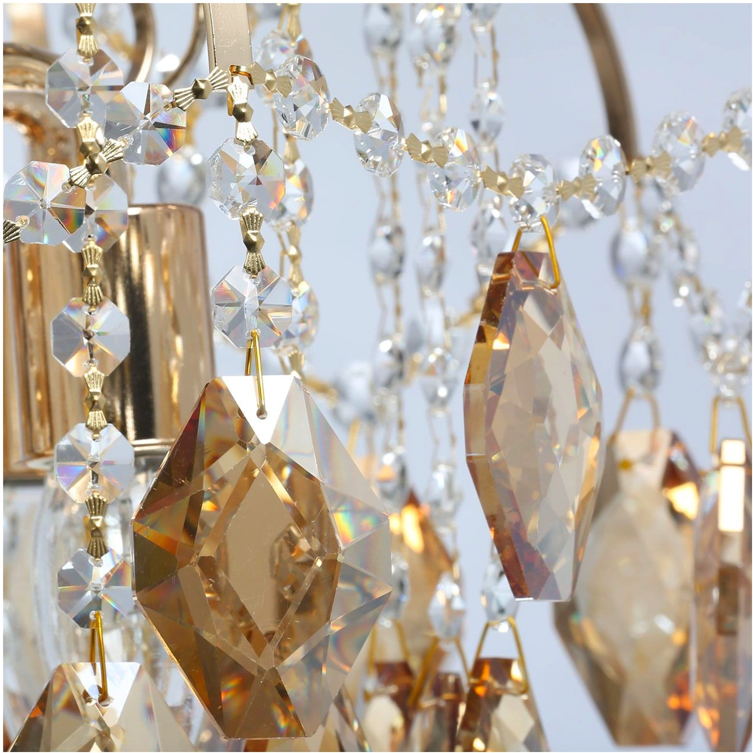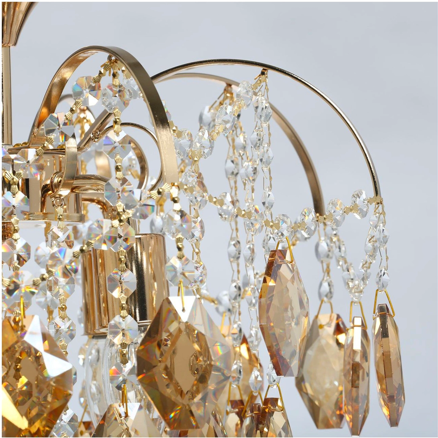 Хрустальный массивный декор янтарного цвета. Подвески из хрусталя и цепочки из прозрачных октагонов создают красивую игру света. Классический золотой цвет основания всегда в тренде.