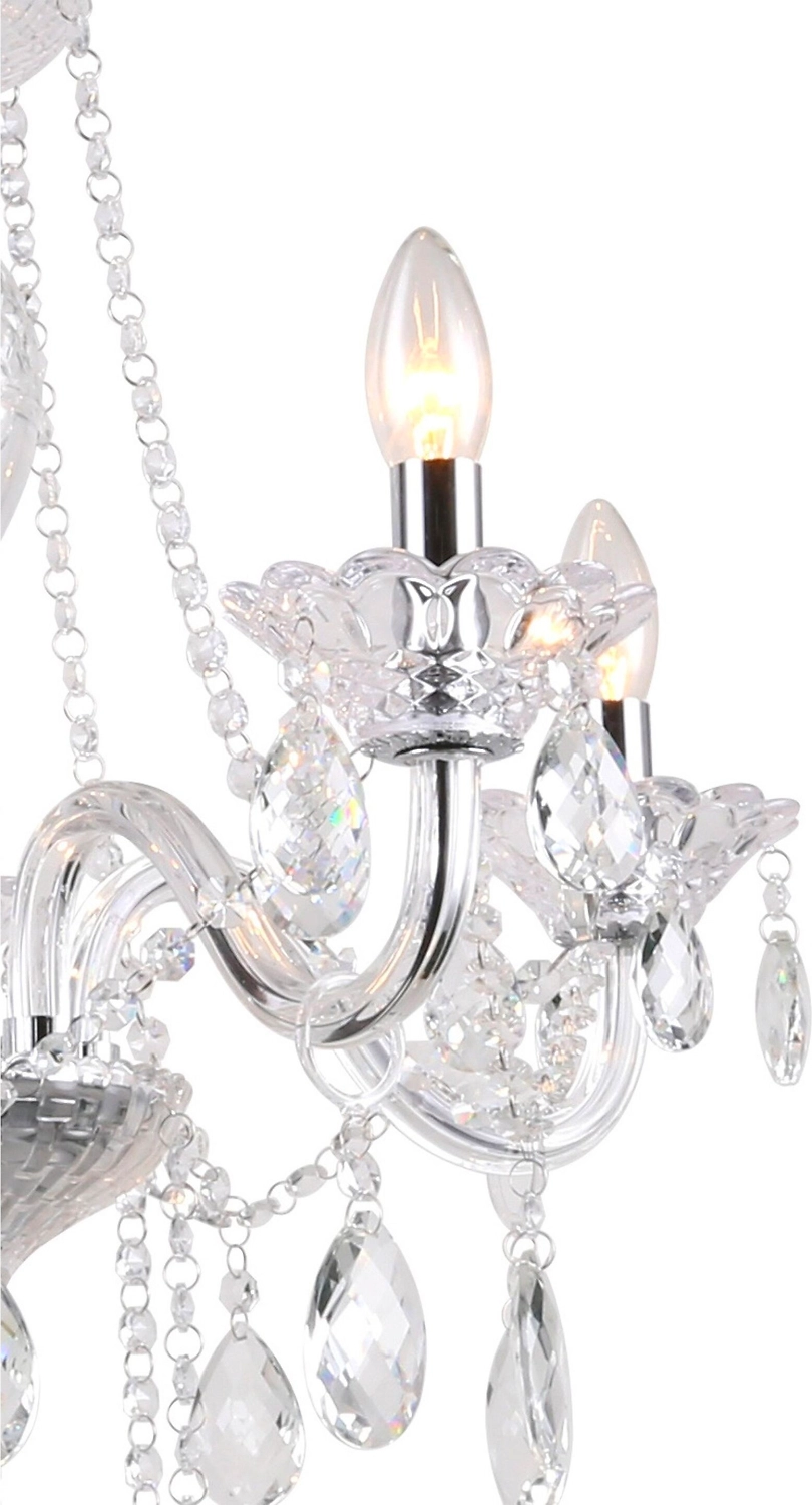 Эта модель выглядит очень изящно, а все за счет изогнутого хромированного каркаса со стеклянными элементами, множества декоративных подвесок и светильников в форме подсвечников. Особую элегантность люстре придает металлический подвес, который скрыт за текстильным чехлом. Для поддержания общей стилистики в люстре лучше использовать энергосберегающие или лампы накаливания в форме свечи.