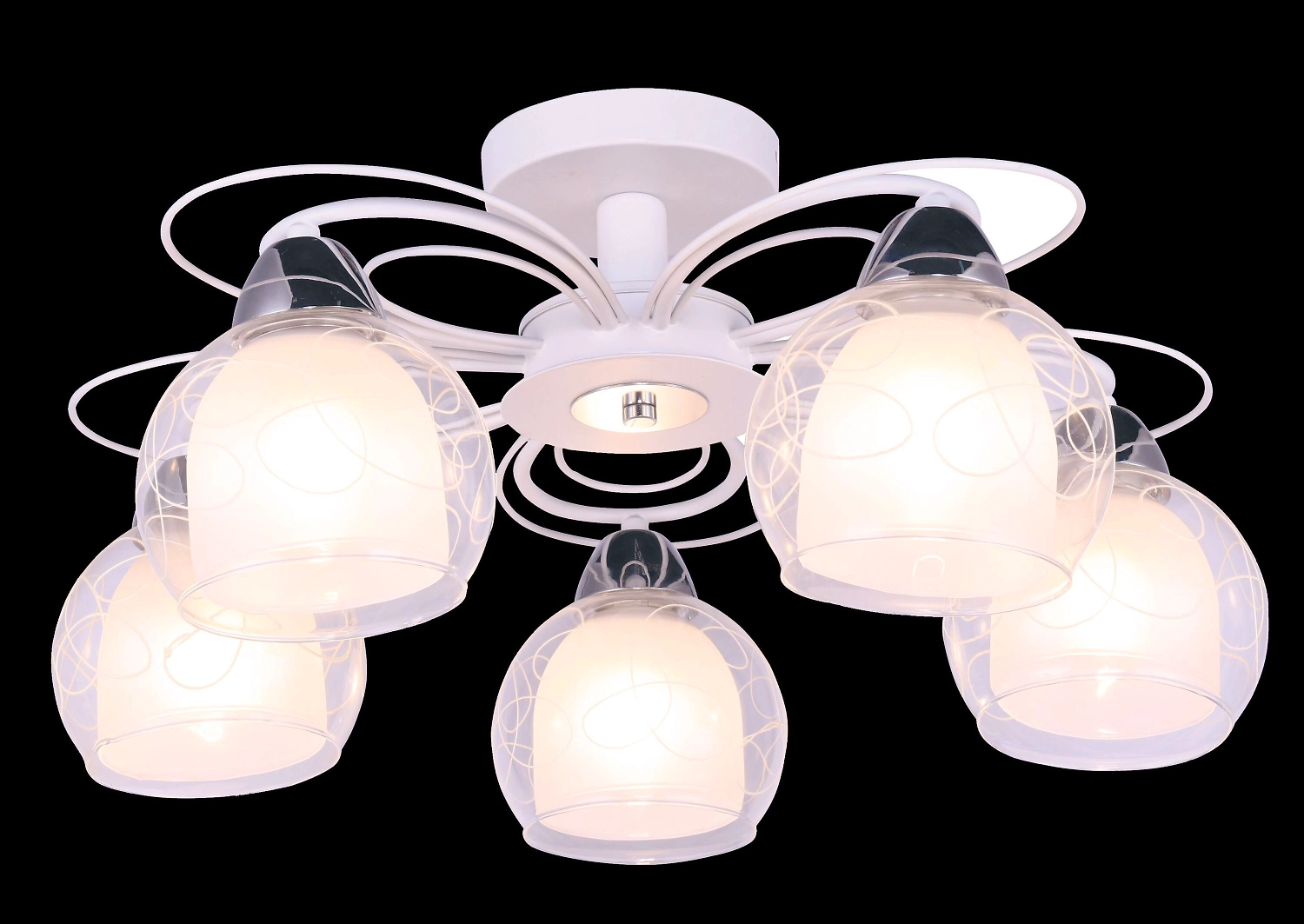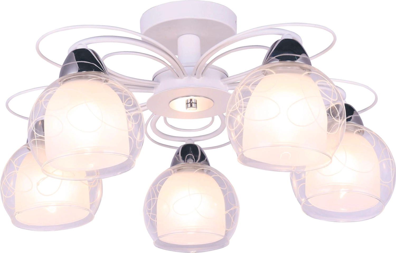 Легкая и оригинальная потолочная люстра с 5 плафонами отличается надежностью и удобством фиксации. Плафоны выполнены из прозрачного материала, поверхность которого имеет необычный узор в виде изогнутых линий. Каркас и арматура окрашены в белый цвет.