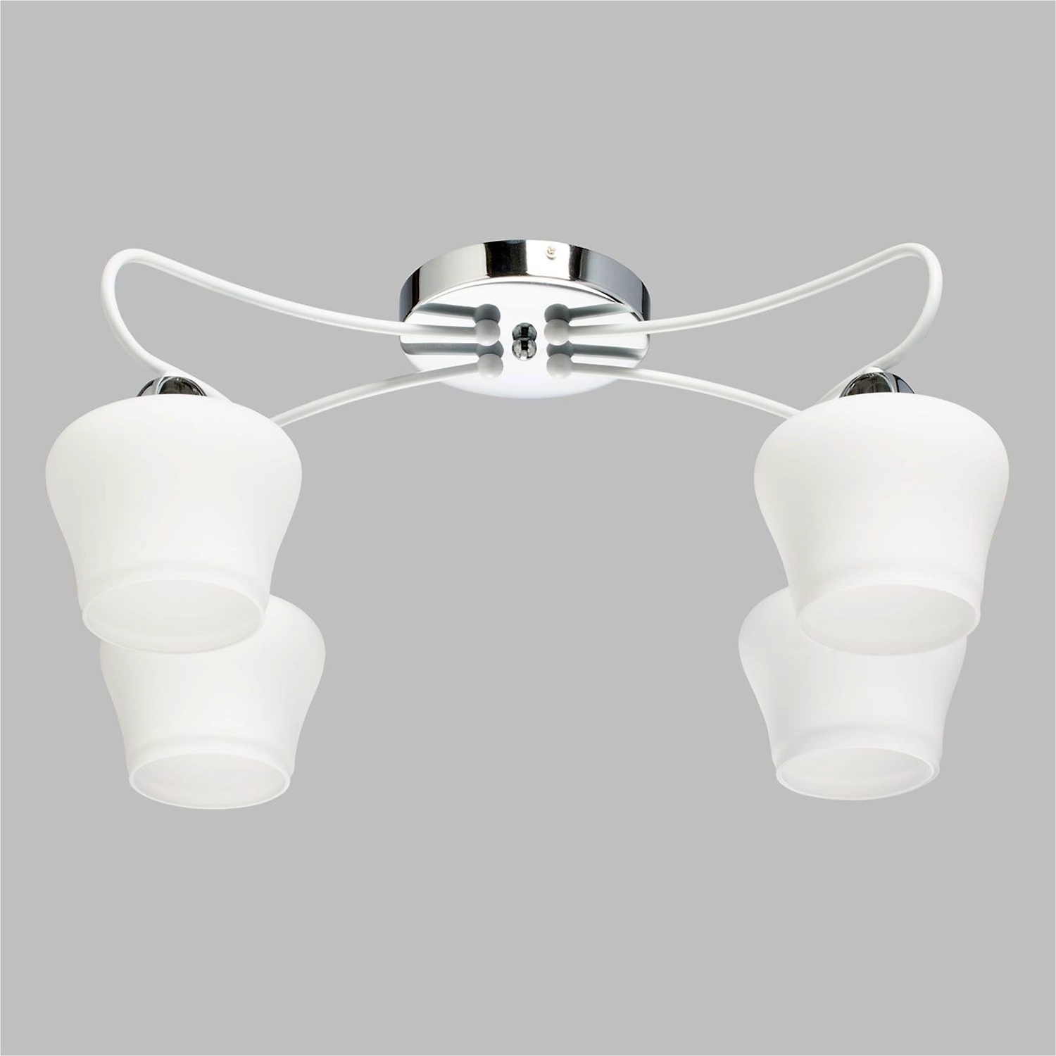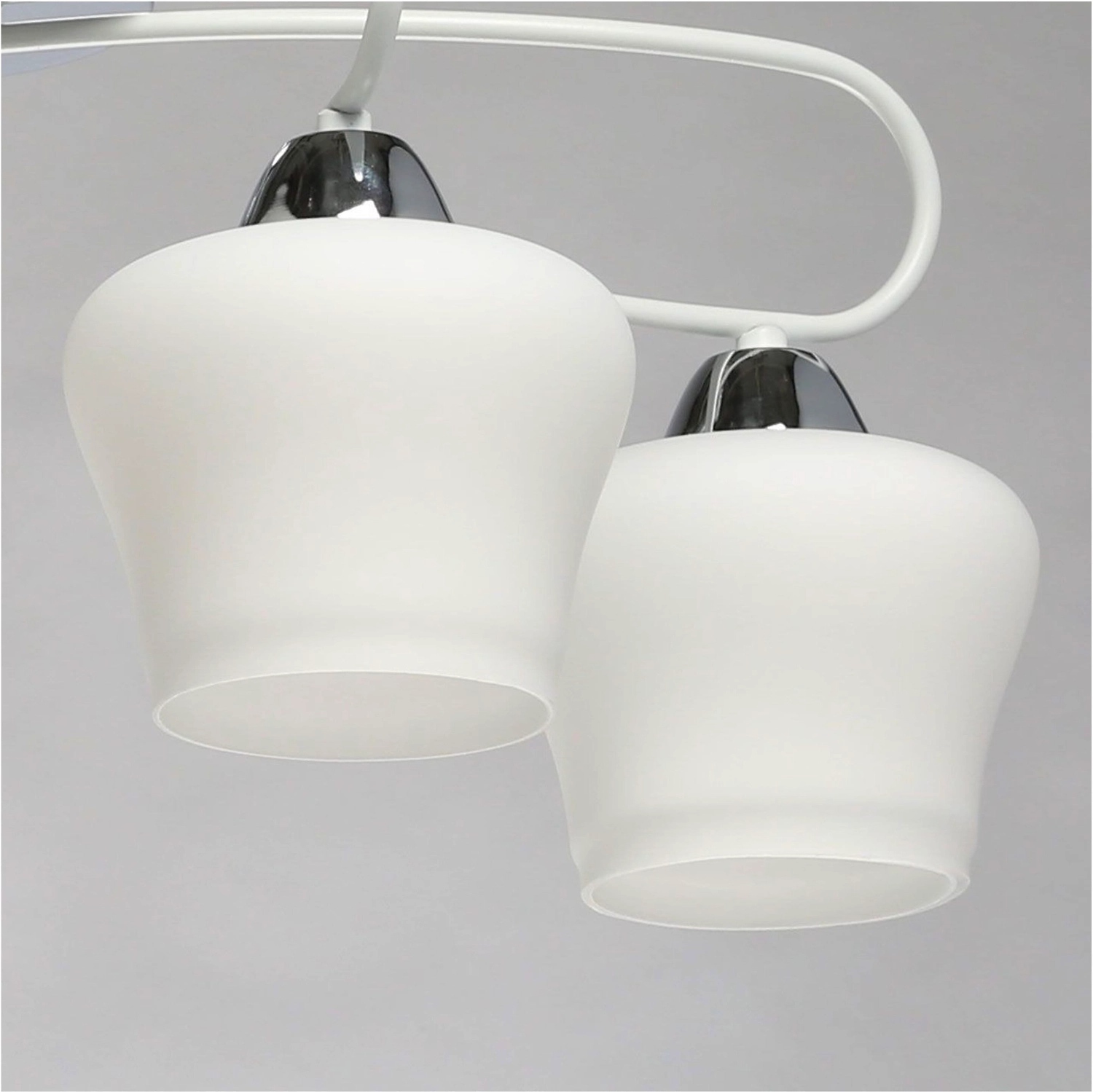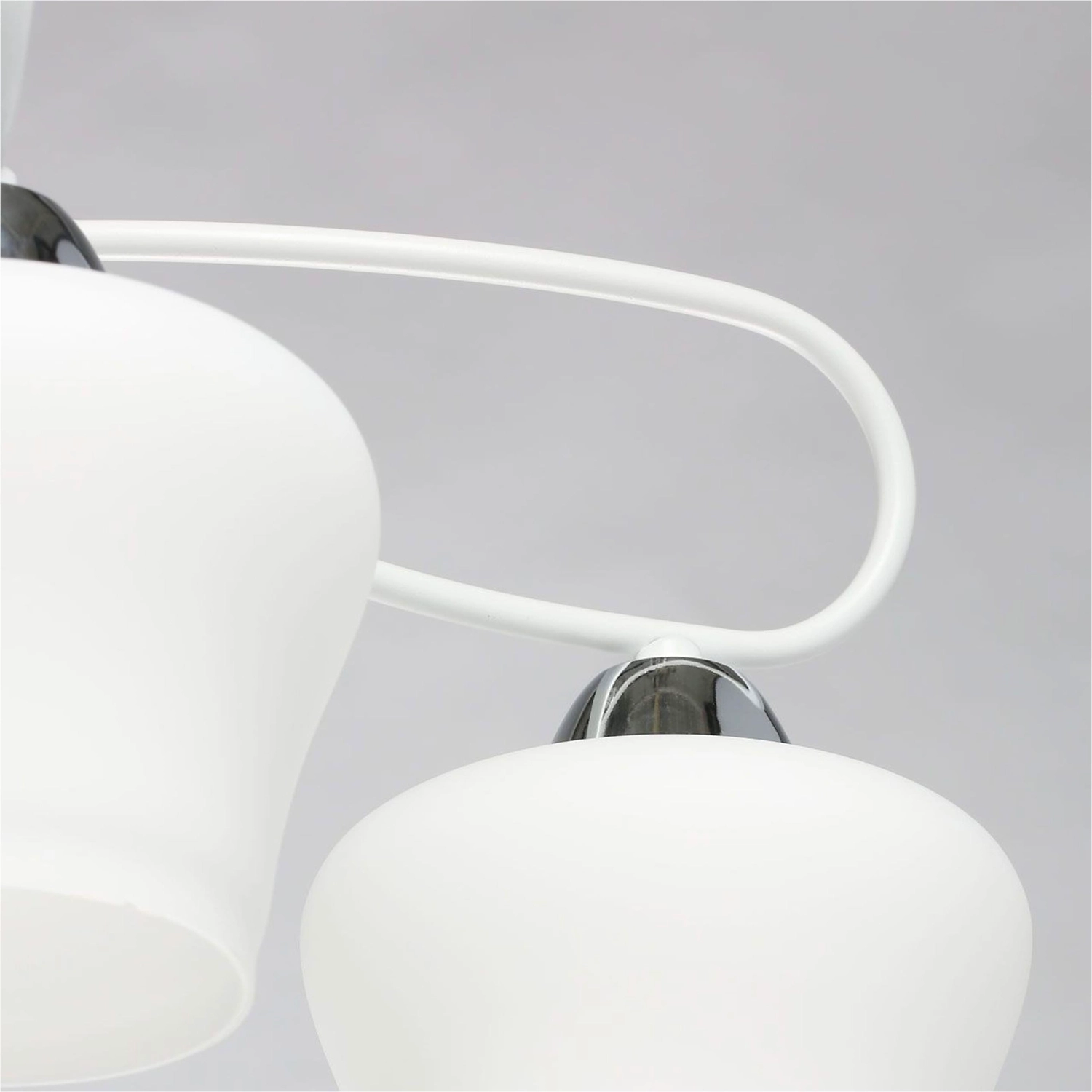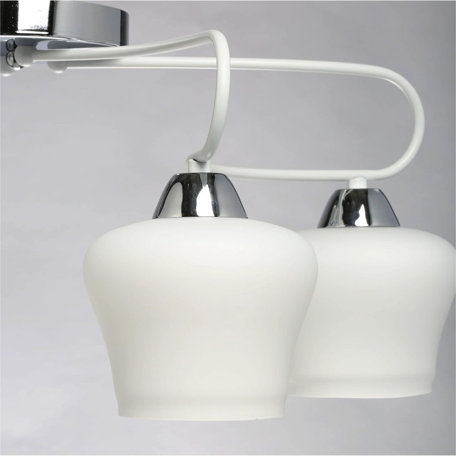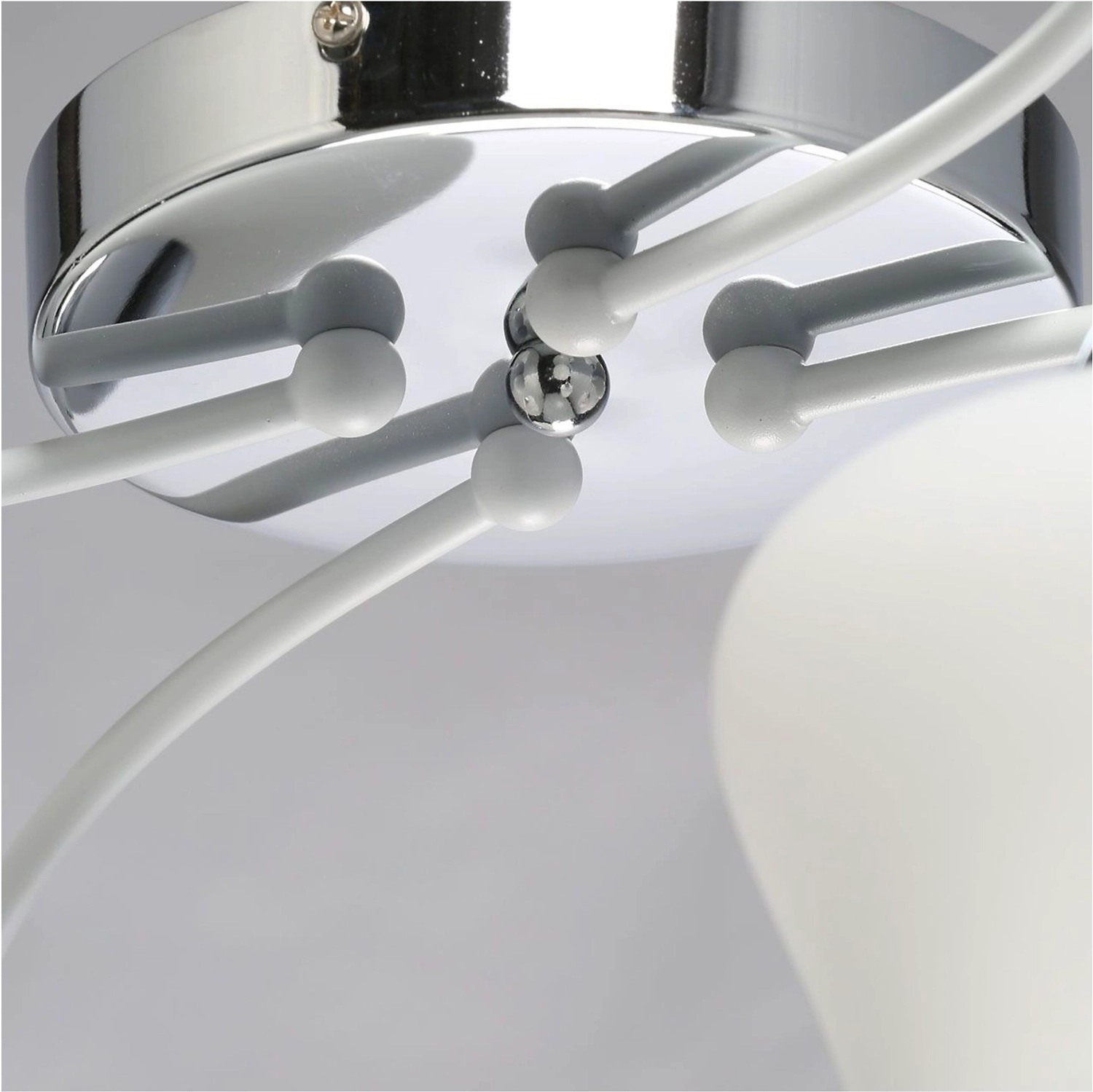 Необычная воздушная конструкция светильника как элемент дизайна. Актуальная комбинация металлов основания белого цвета и хрома. Стеклянные матовые плафоны оригинальной формы.