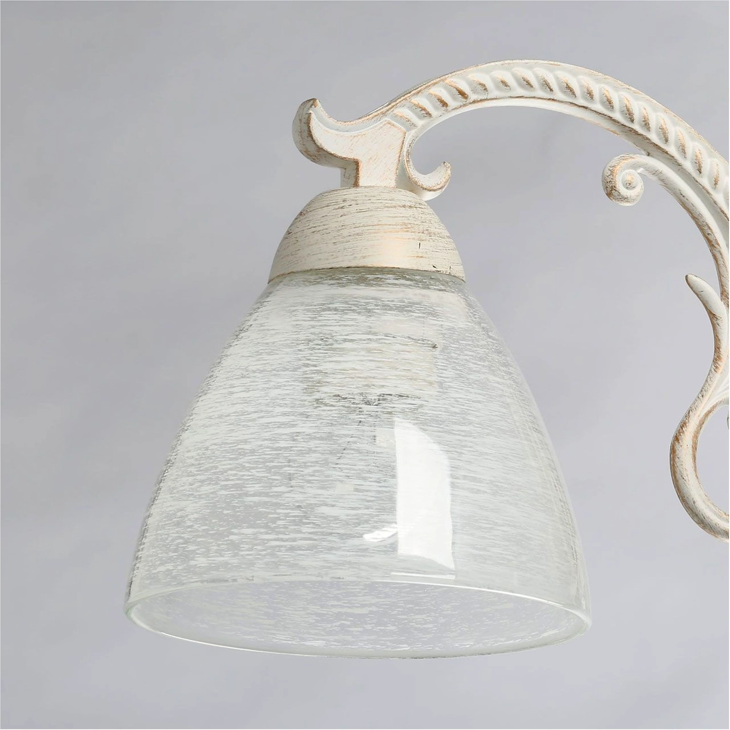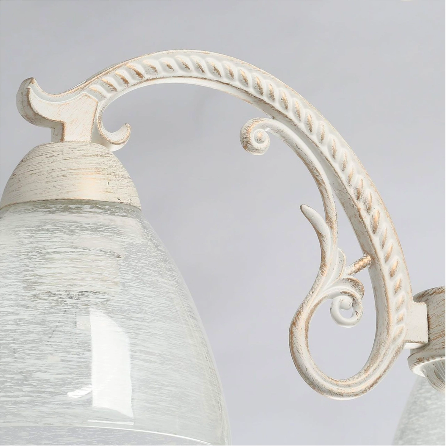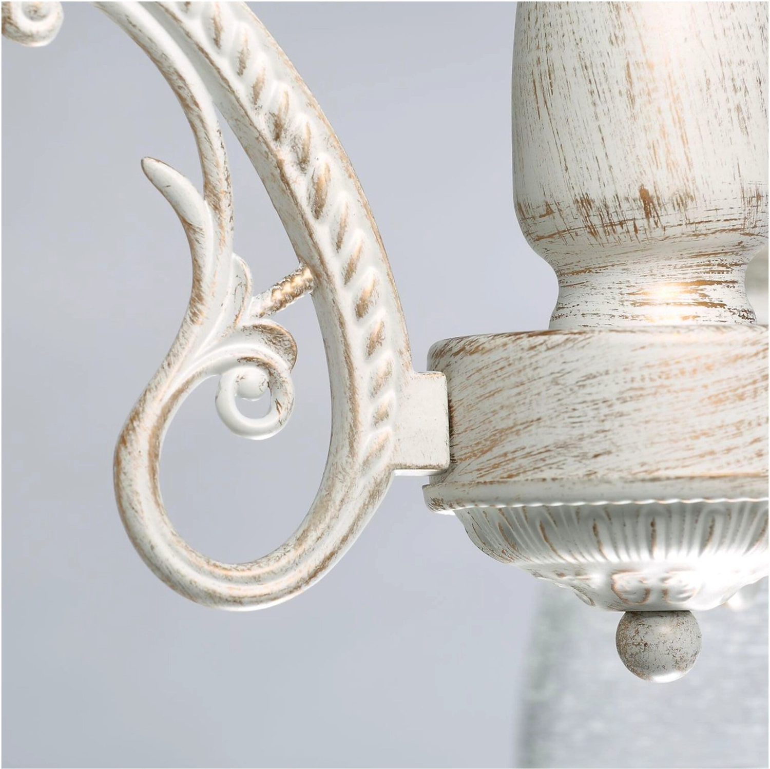 Универсальная модель для интерьеров различной тематики. Стеклянные плафоны с рисунком обеспечивают высокую степень освещенности. Фигурные рожки художественного литья белого цвета, вручную патинированы золотистой краской. Компактные размеры высоты светильника подойдут для стандартных потолков. Заменяемые источники света удобны в эксплуатации.