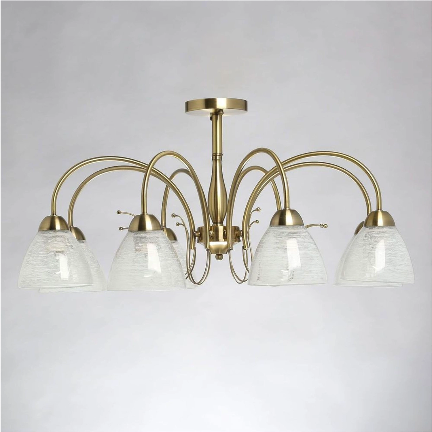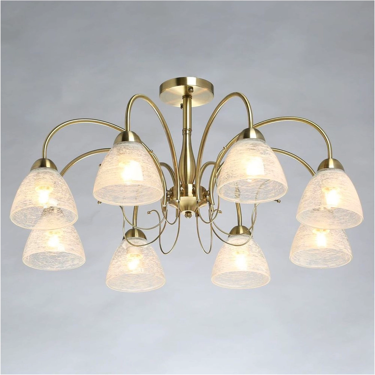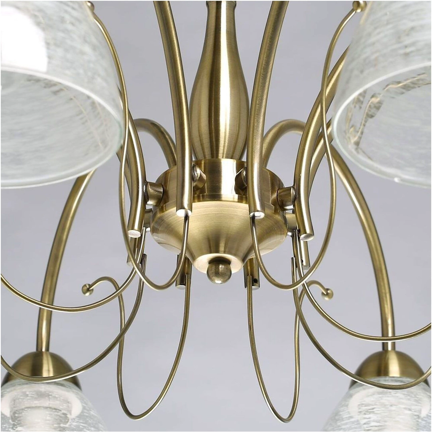 Дизайн для ценителей классических традиций. Металлический декор основания цвета античной бронзы добавляет легкости модели. Стеклянные полупрозрачные плафоны с рисунком отлично пропускают свет.