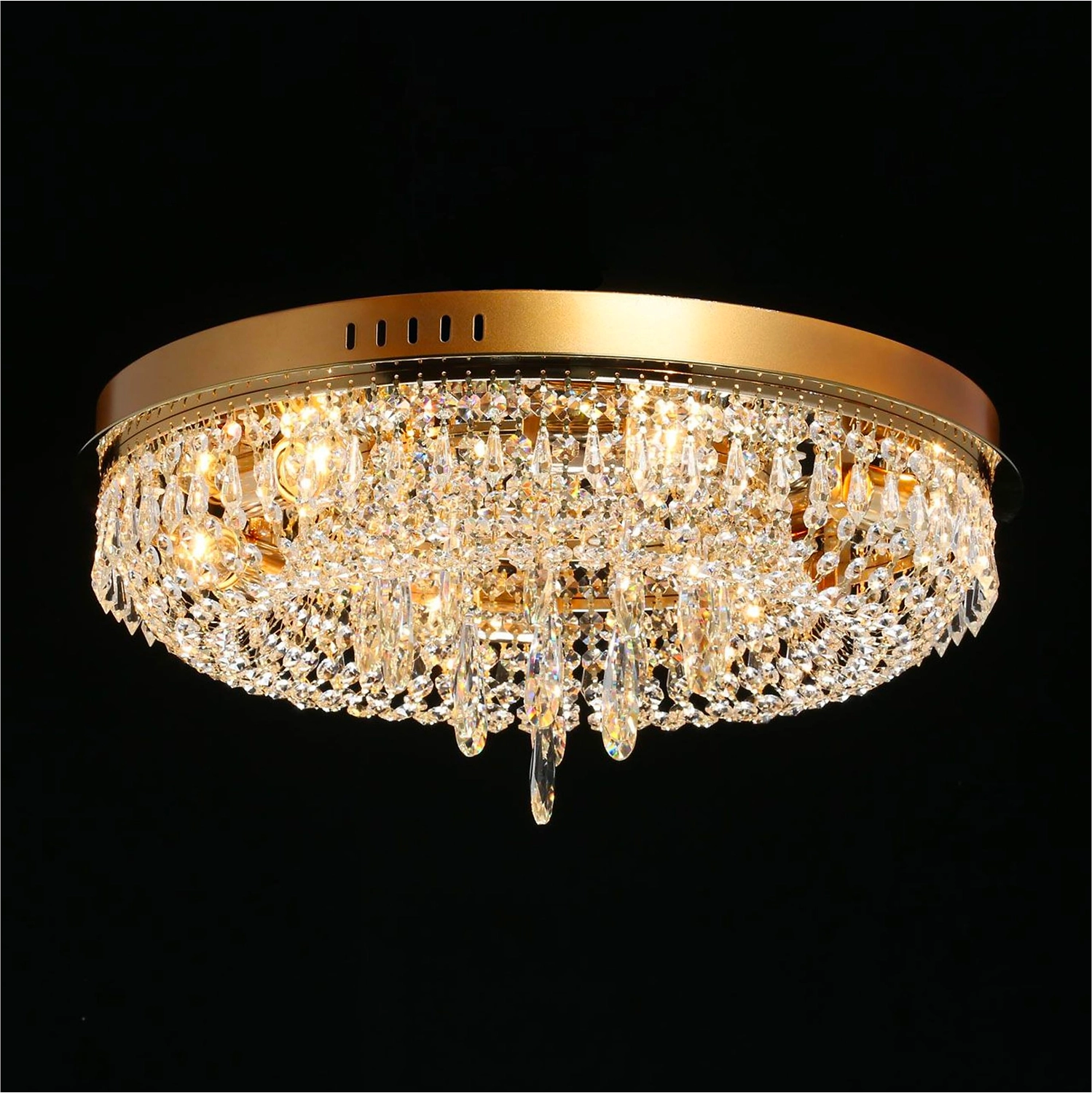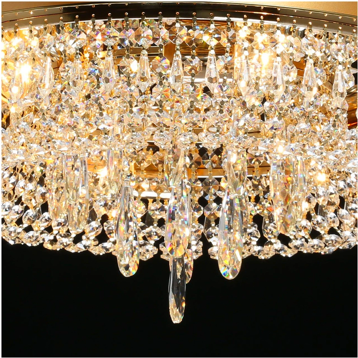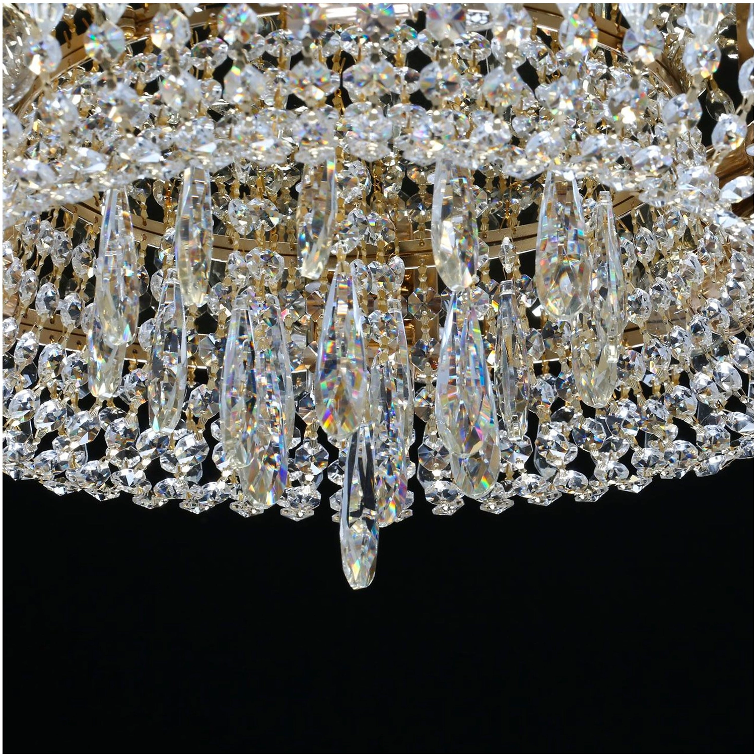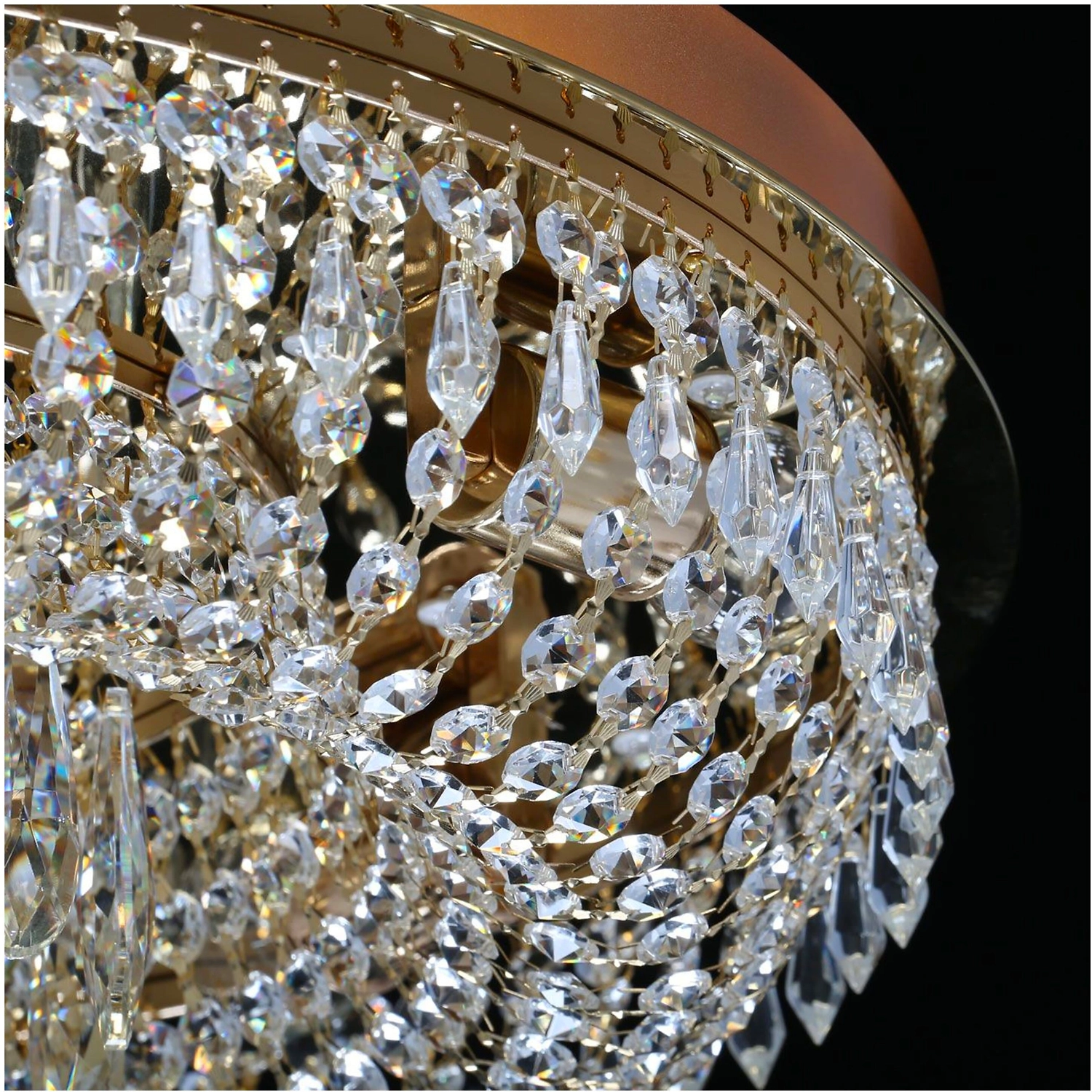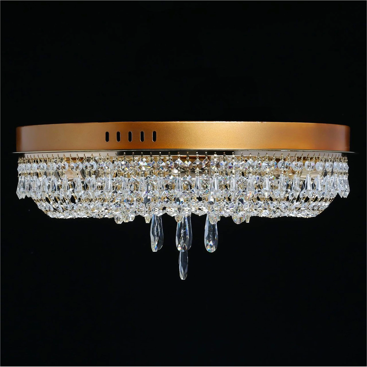 Прозрачный хрусталь разнообразной формы создает красивую игру света. Классический золотой цвет основания всегда в тренде. Крупный хрустальный декор в форме капли в центре композиции добавляет ценности модели. Наличие ПДУ, управляет 3-мя режимами освещения, теплый, холодный, комбинированный свет. Компактная высота светильника идеальна для стандартных потолков.