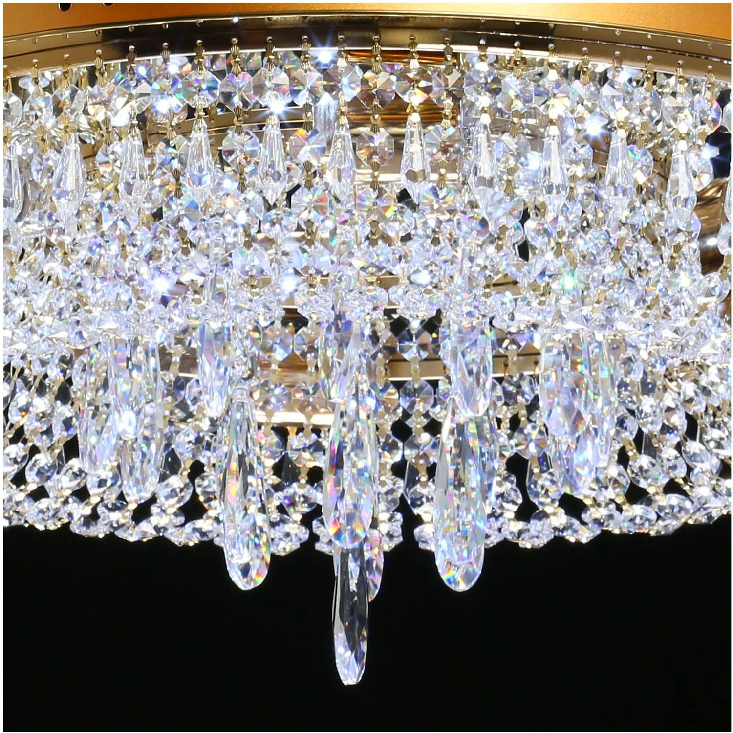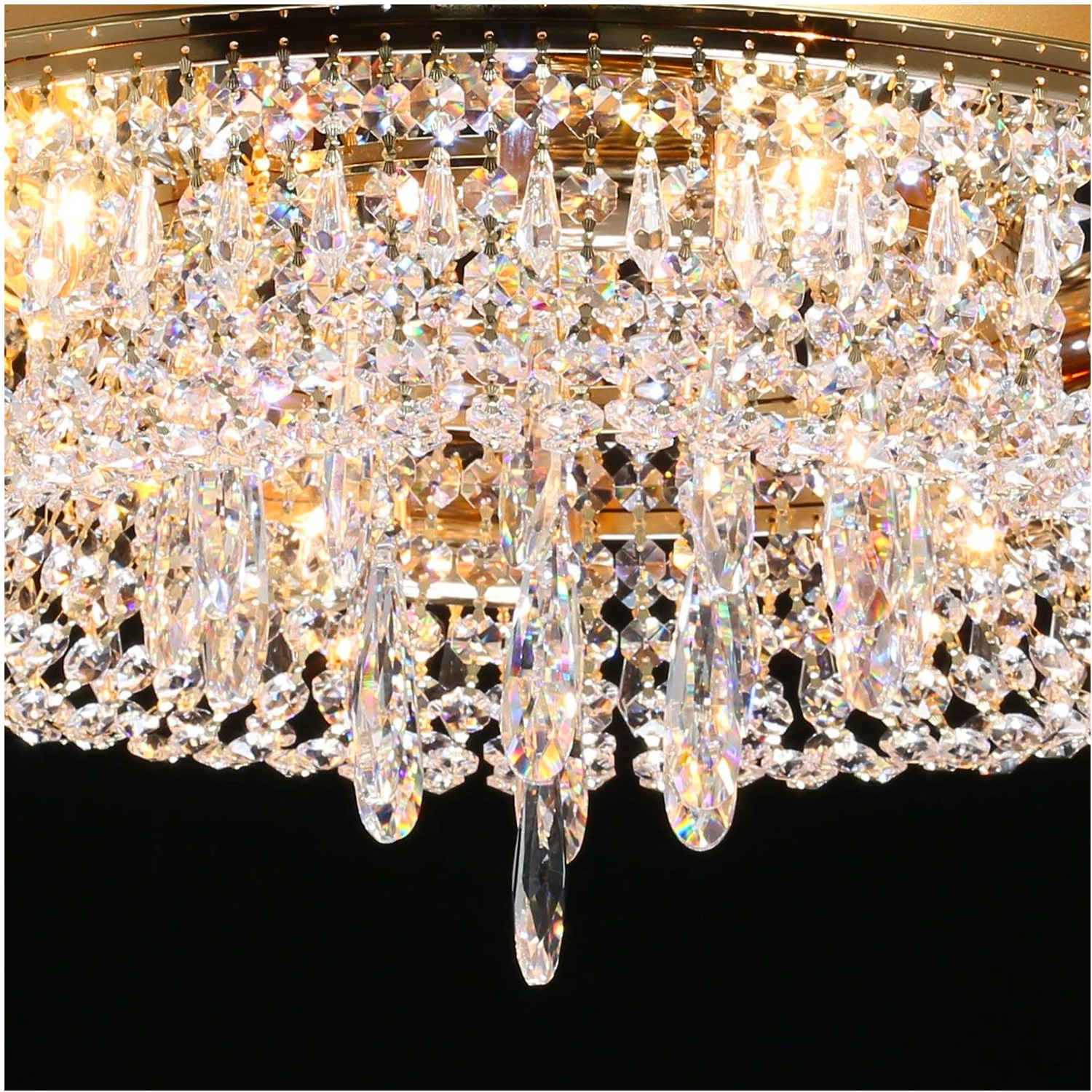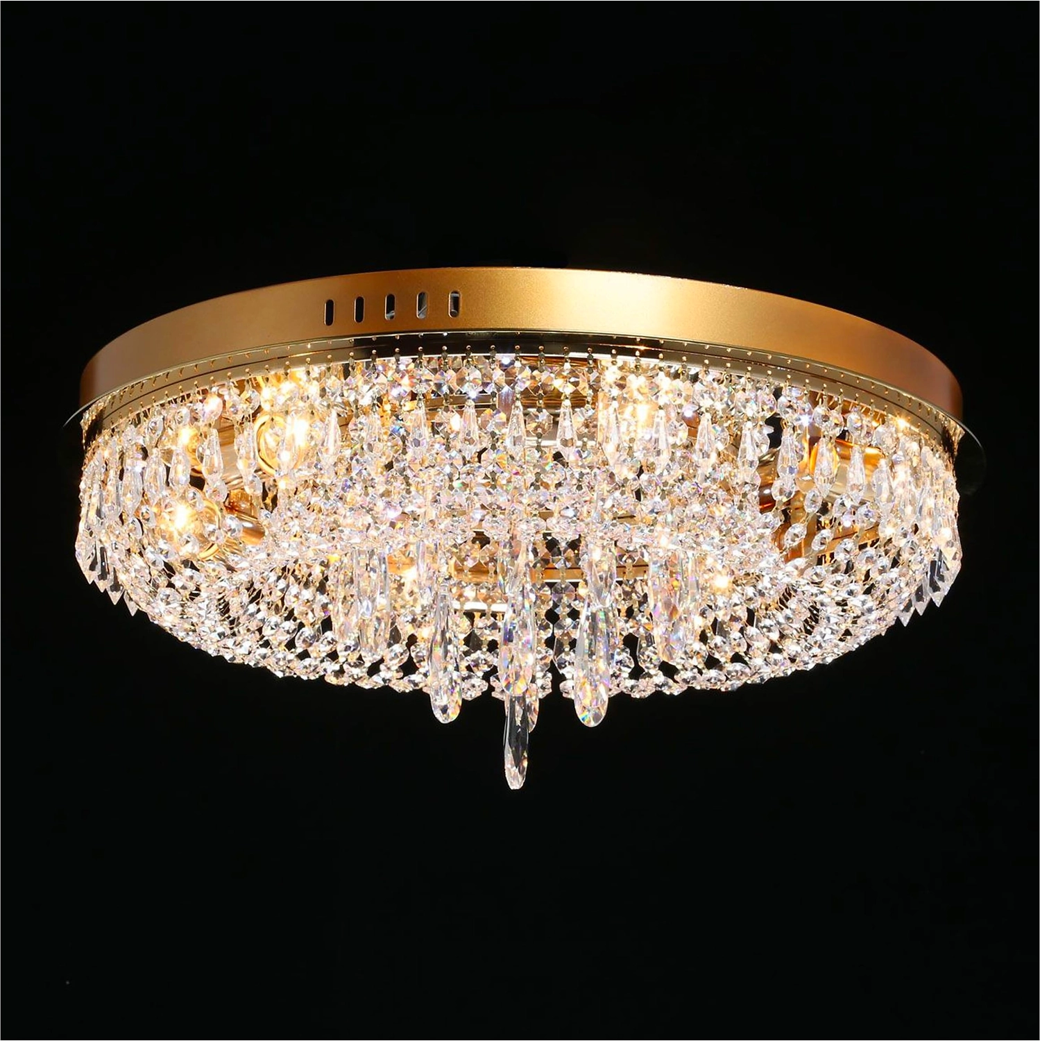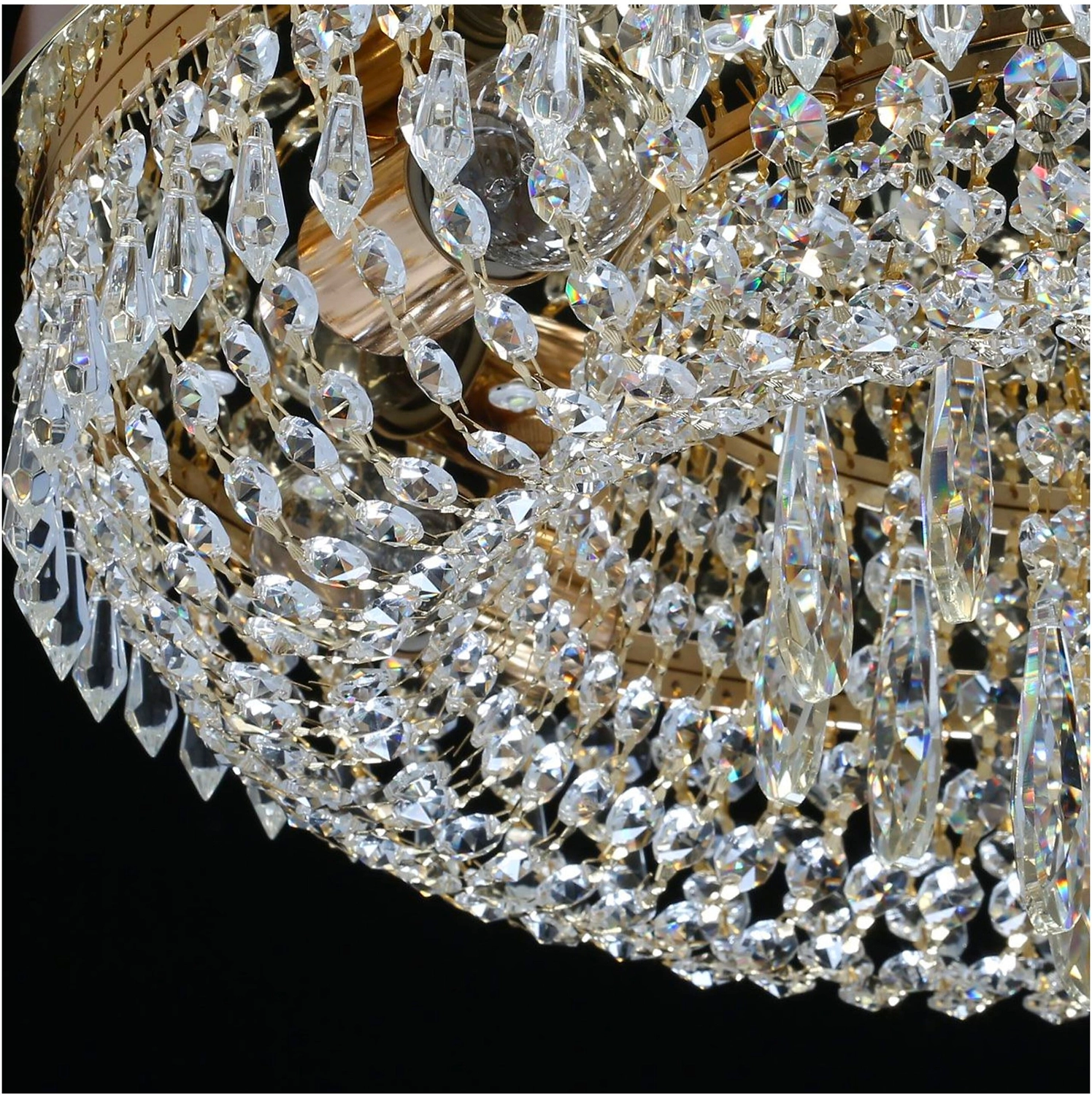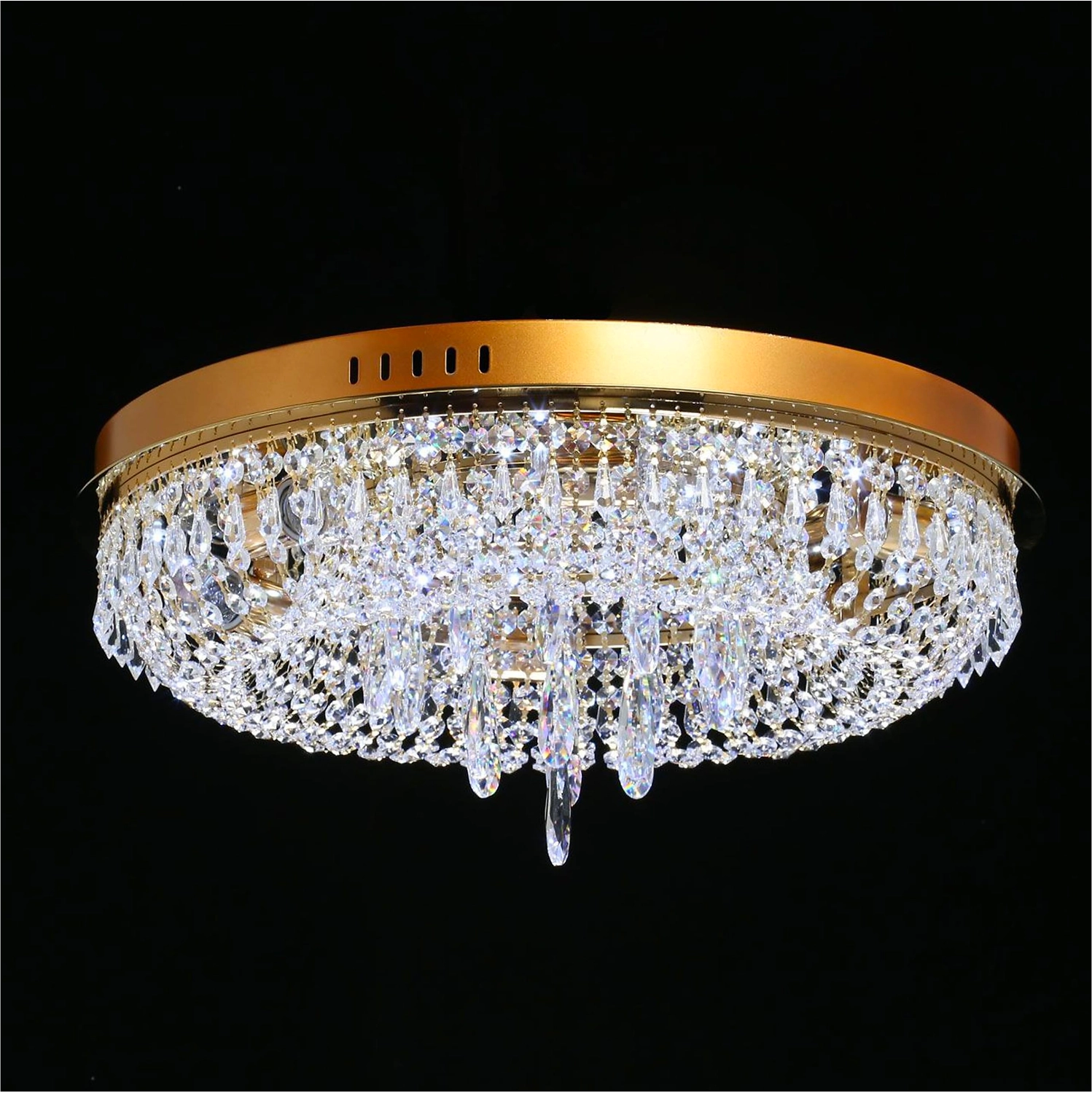 Прозрачный хрусталь разнообразной формы создает красивую игру света. Классический золотой цвет основания всегда в тренде. Крупный хрустальный декор в форме капли в центре композиции добавляет ценности модели. Наличие ПДУ, управляет 3-мя режимами освещения, теплый, холодный, комбинированный свет. Компактная высота светильника идеальна для стандартных потолков.