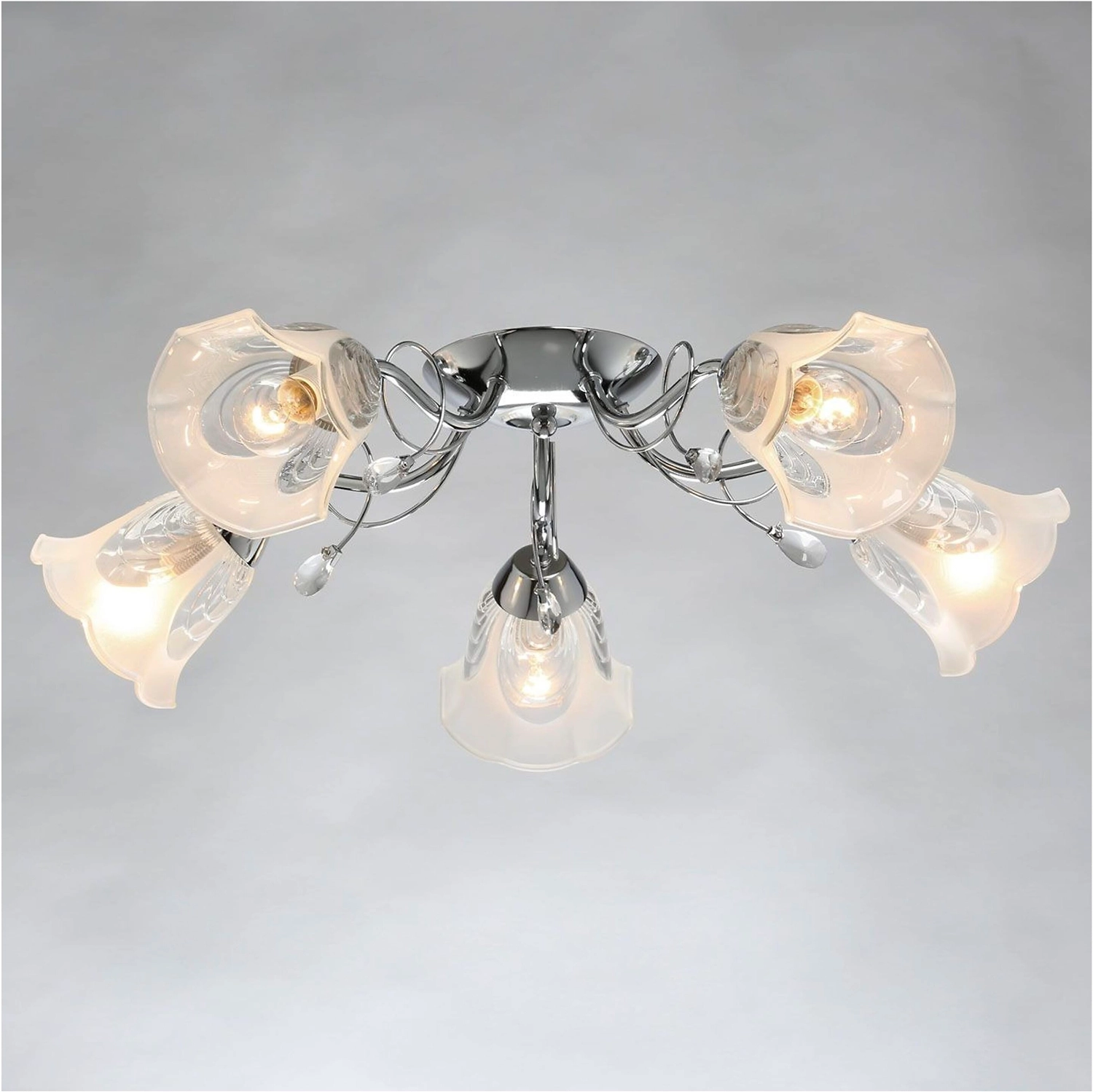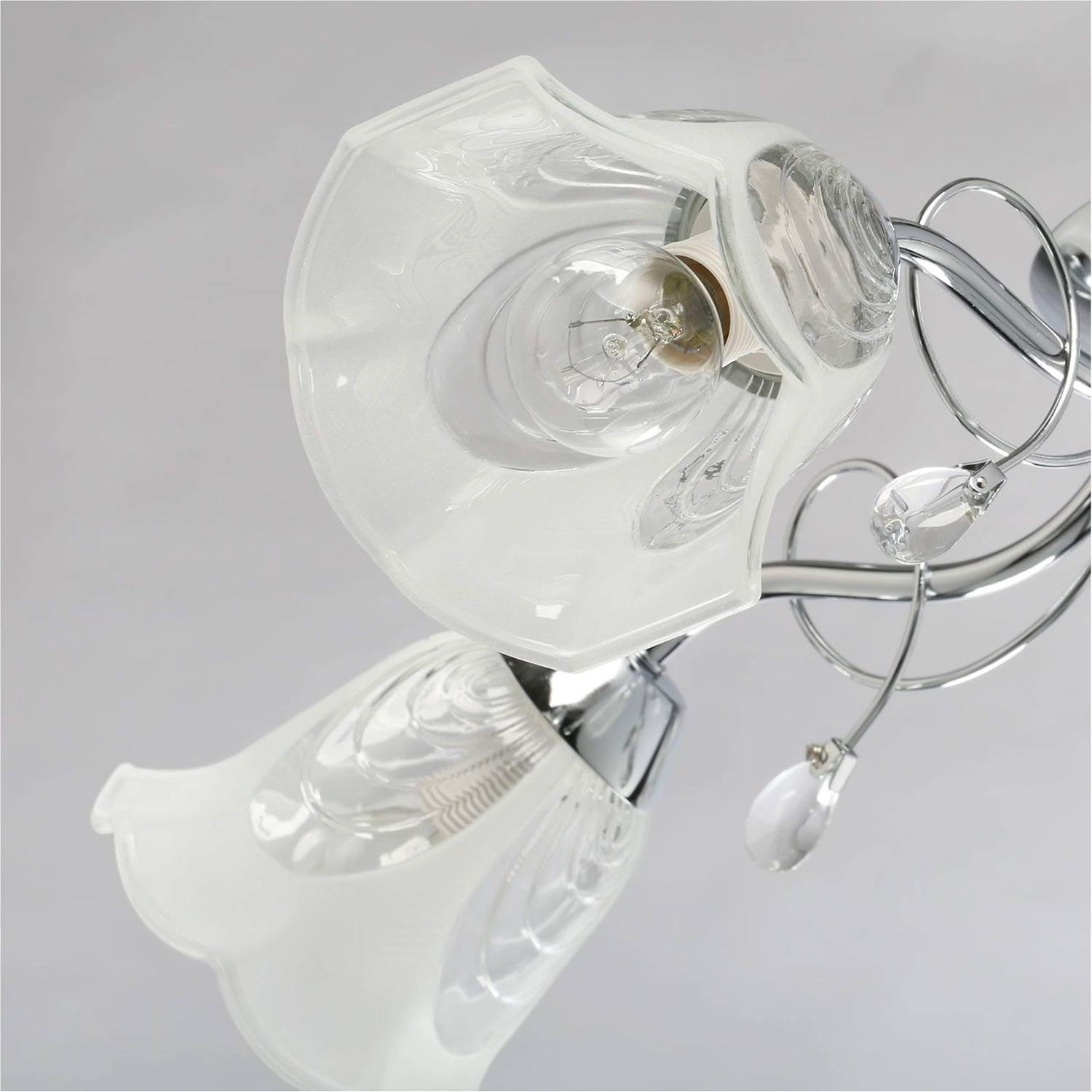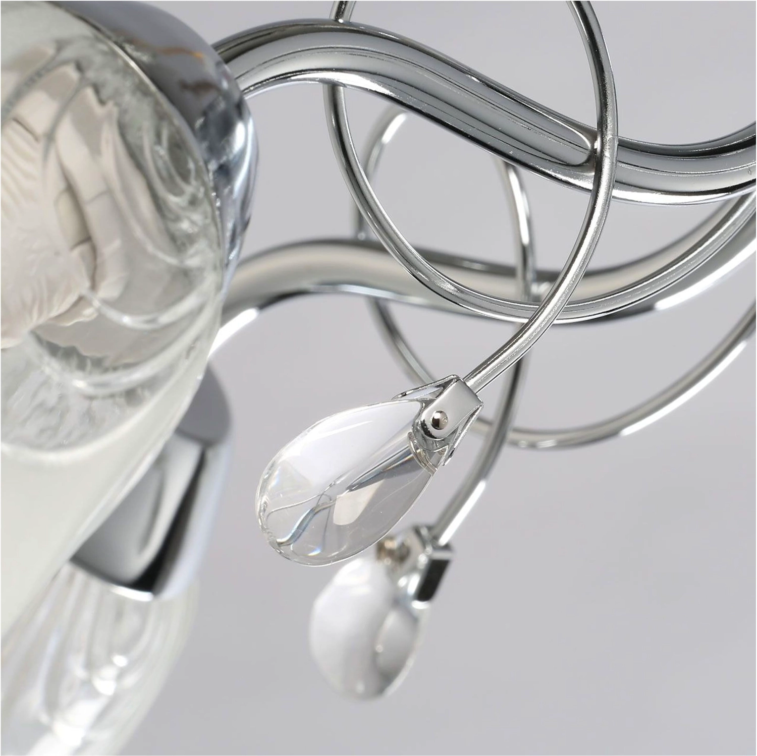 Фантазийный дизайн светильника идеален для современных интерьеров. Оригинальный металлический декор цвета хрома добавляет декоративности. Стеклянные рельефные плафоны флористической формы частично матированы обеспечивают мягкий световой поток. Декоративные элементы из хрустального стекла дополняют романтичный образ.