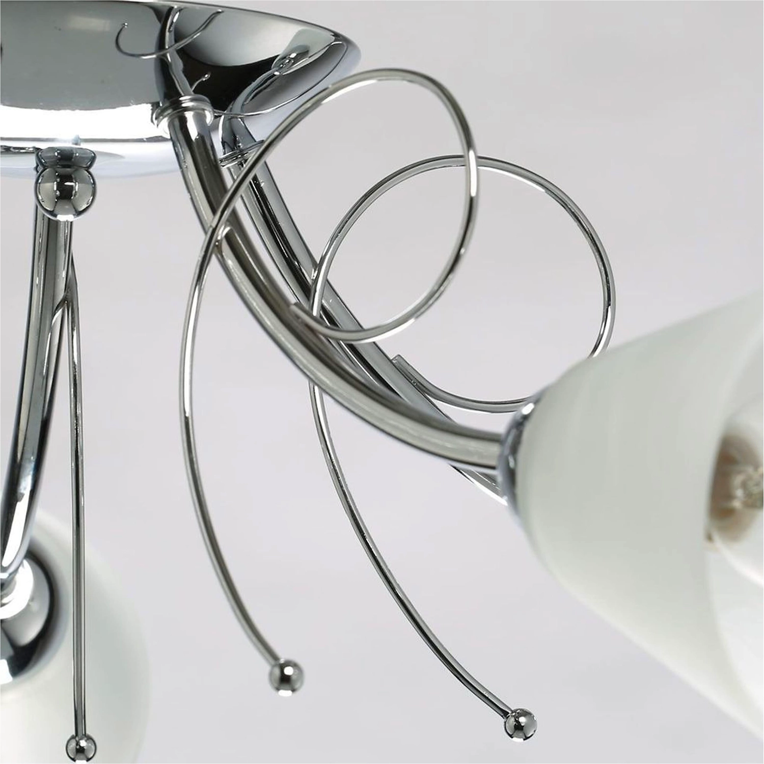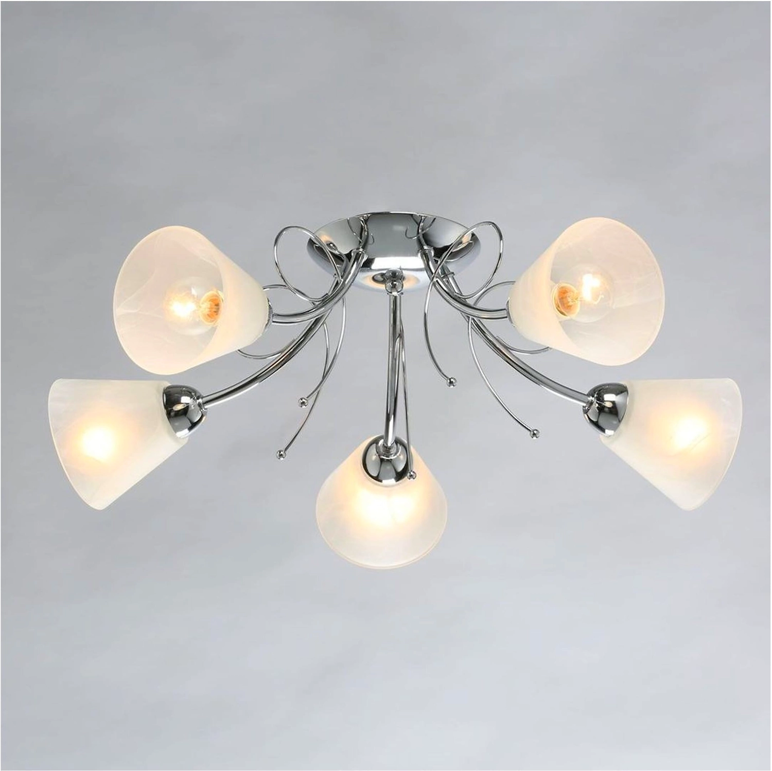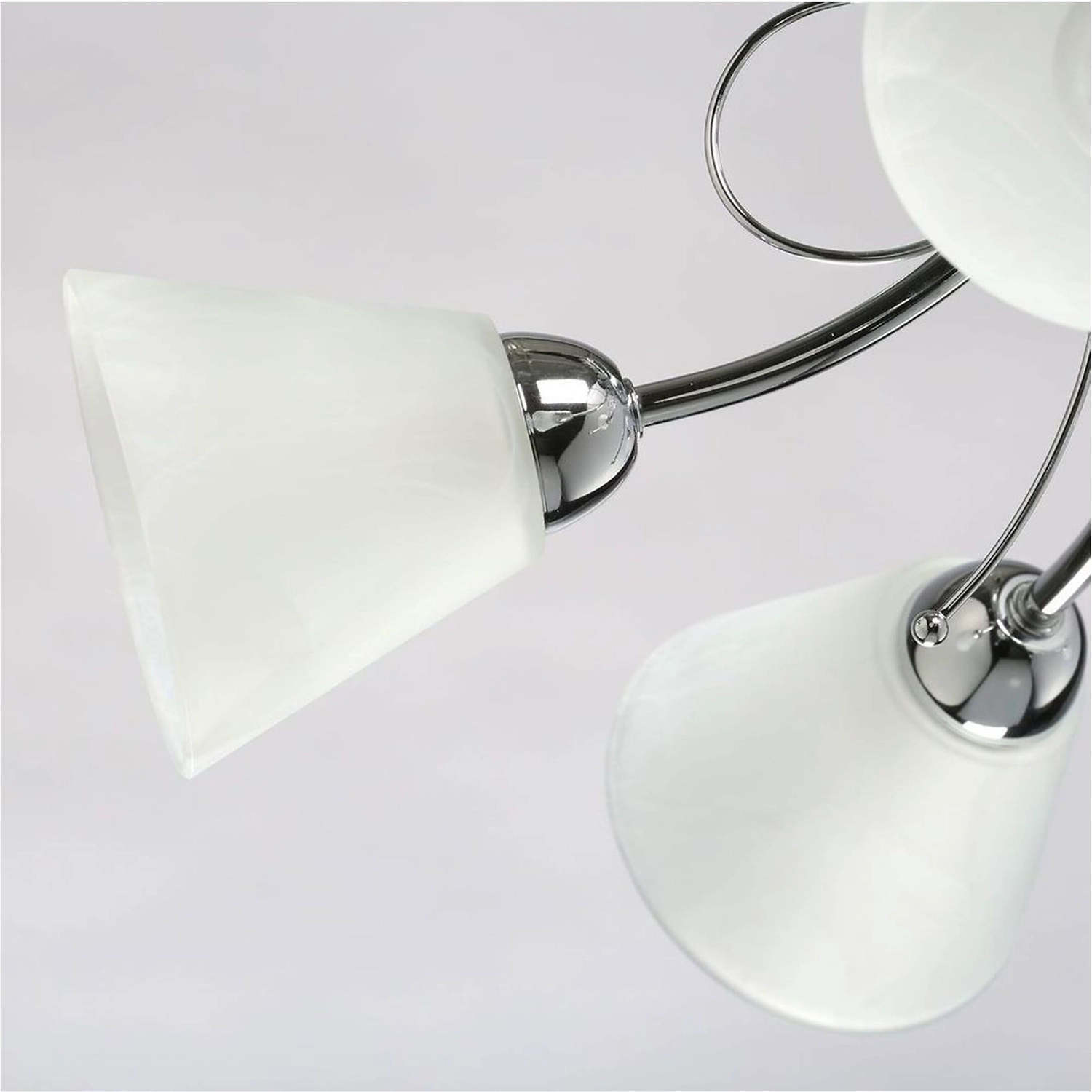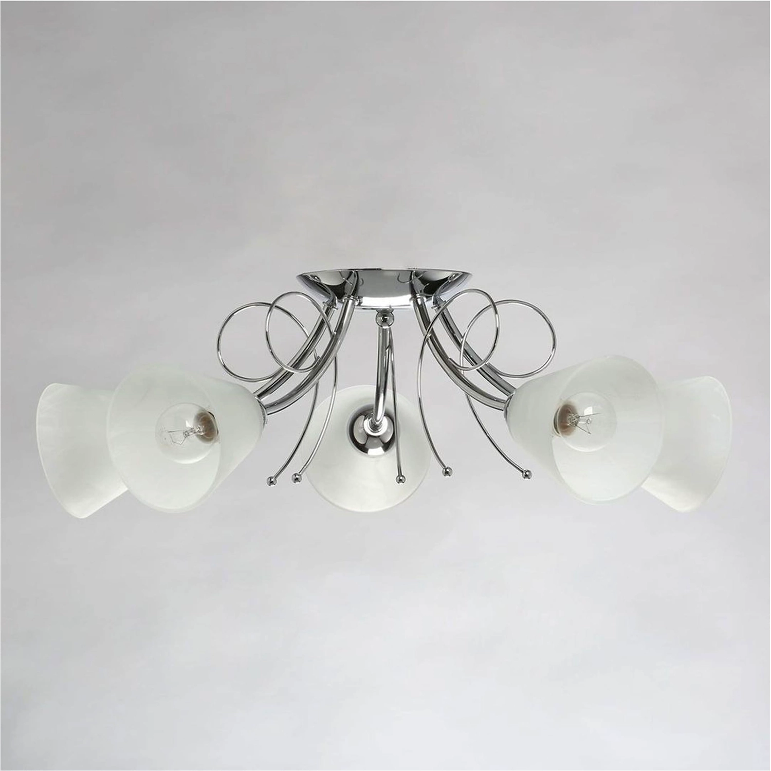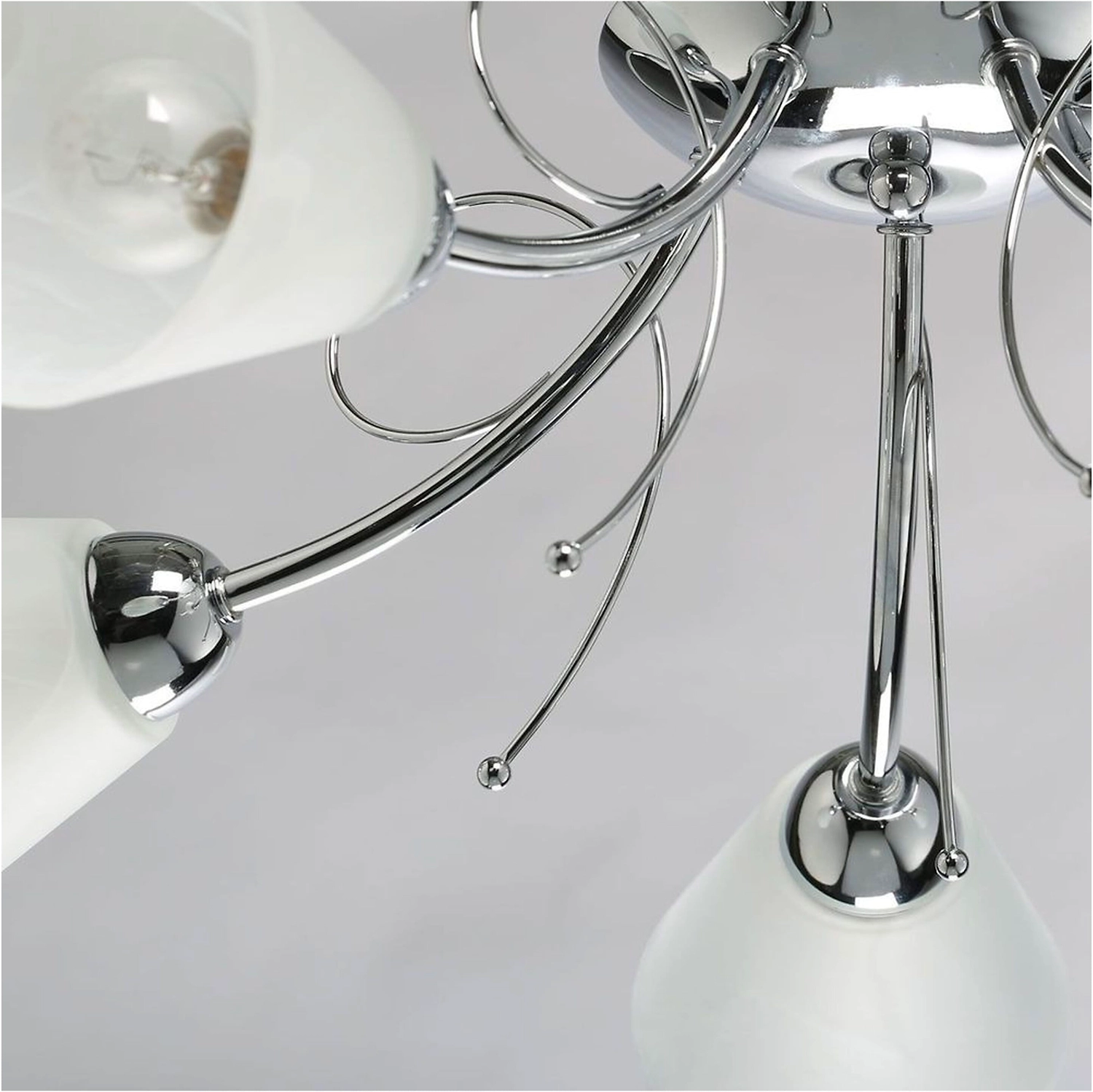 Универсальная модель для интерьеров различной цветовой гаммы. Минималистичный металлический декор цвета хорма отвечает современным трендам. Плафоны из матового стекла обеспечивают яркий световой поток. Компактная высота светильника идеальна для стандартных потолков.