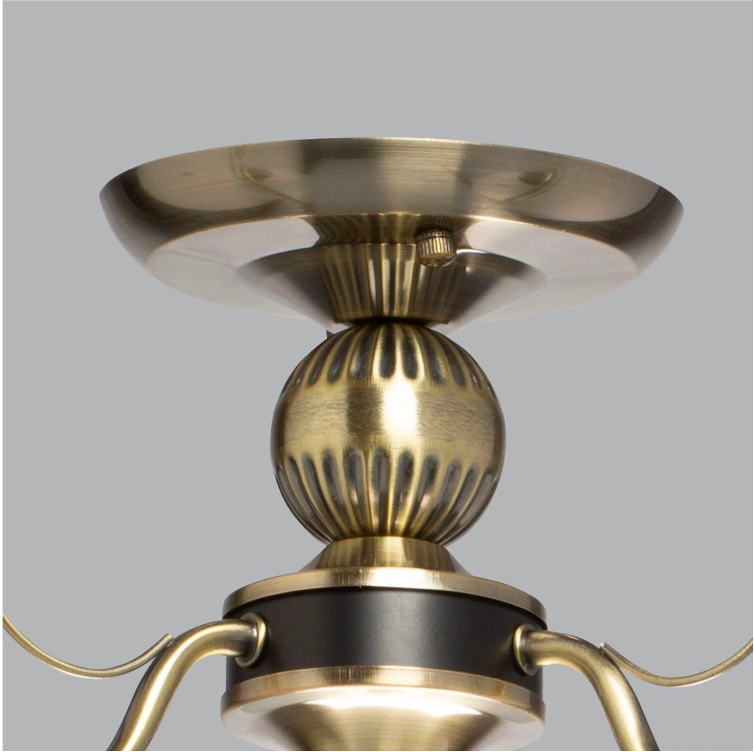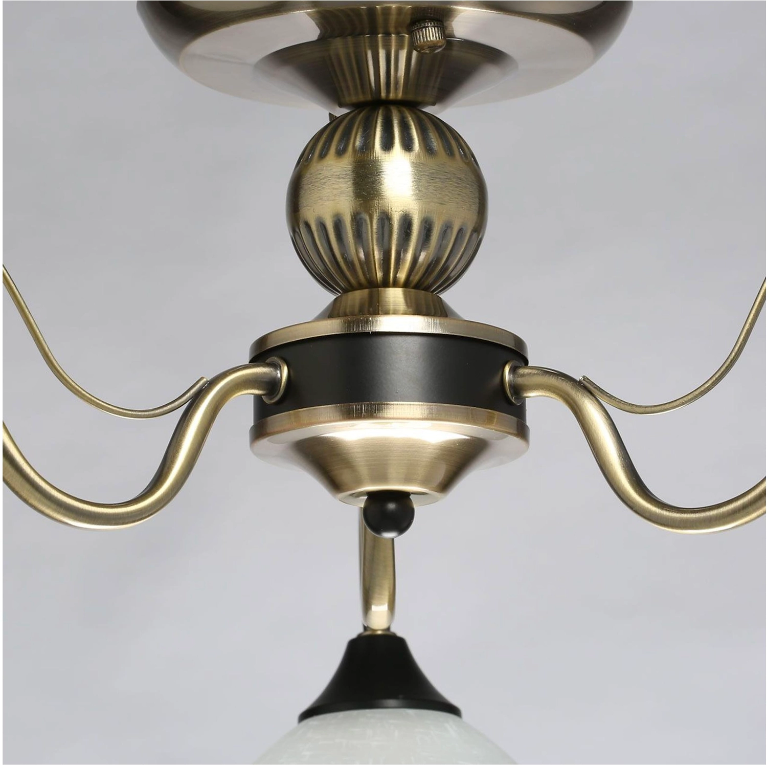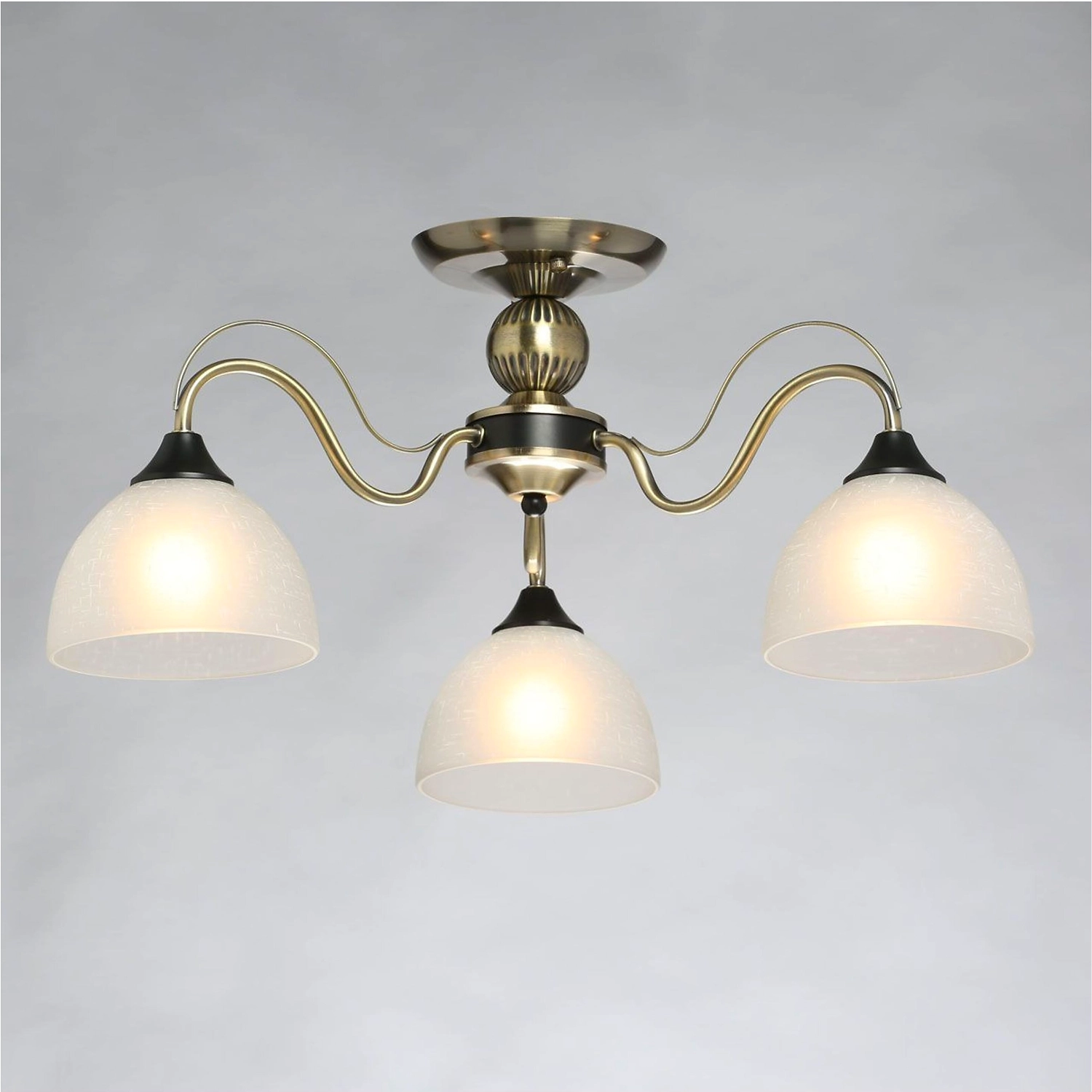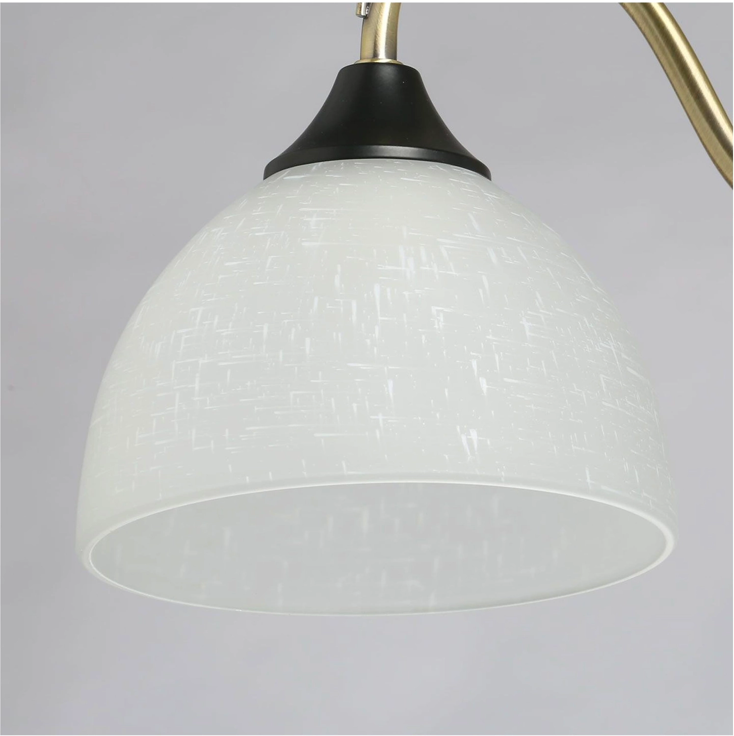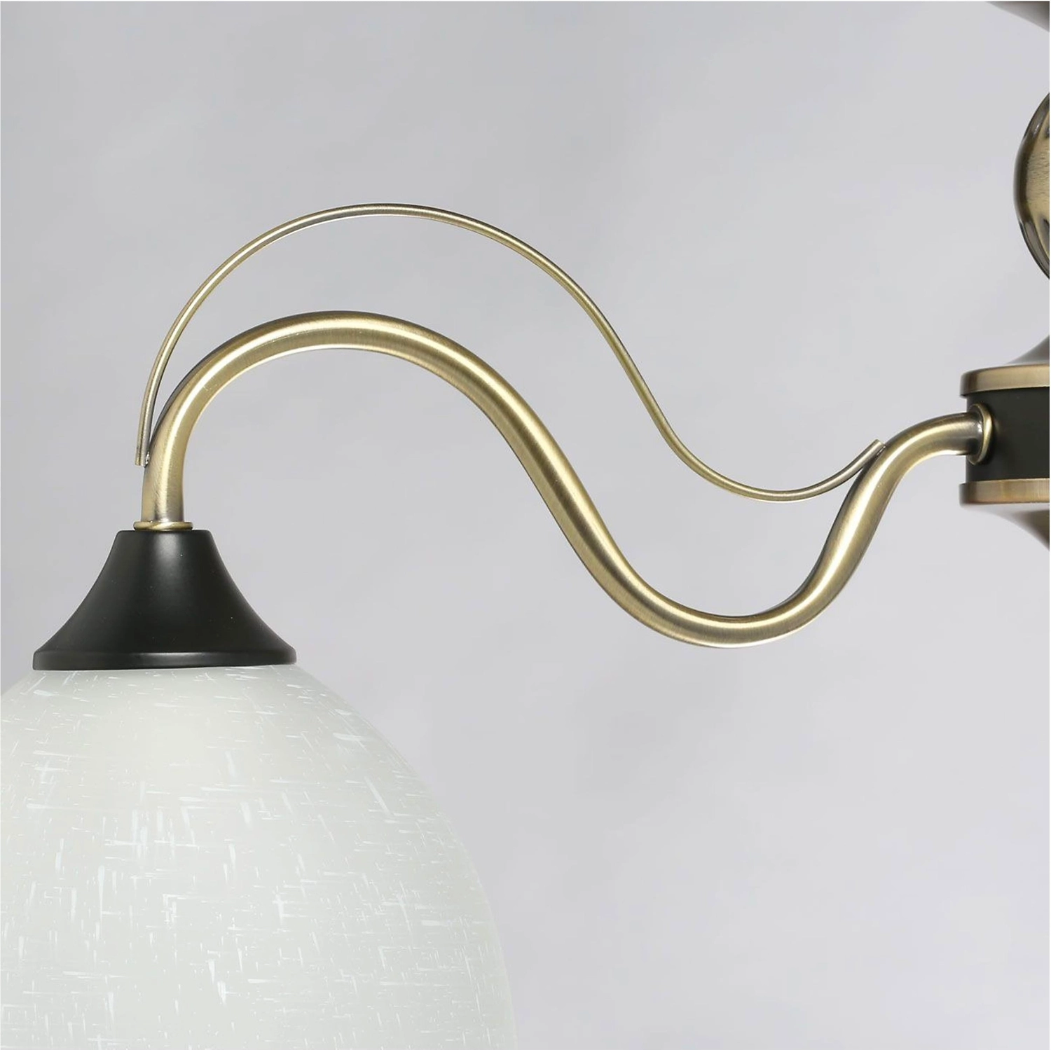 Дизайн в стиле неоклассики в тренде. Актуальная комбинация металлов цвета античной бронзы и черного. Рожки с металлическим декором добавляют легкости модели. Стеклянные матовые плафоны с рисунком обеспечивают мягкий световой пототок.