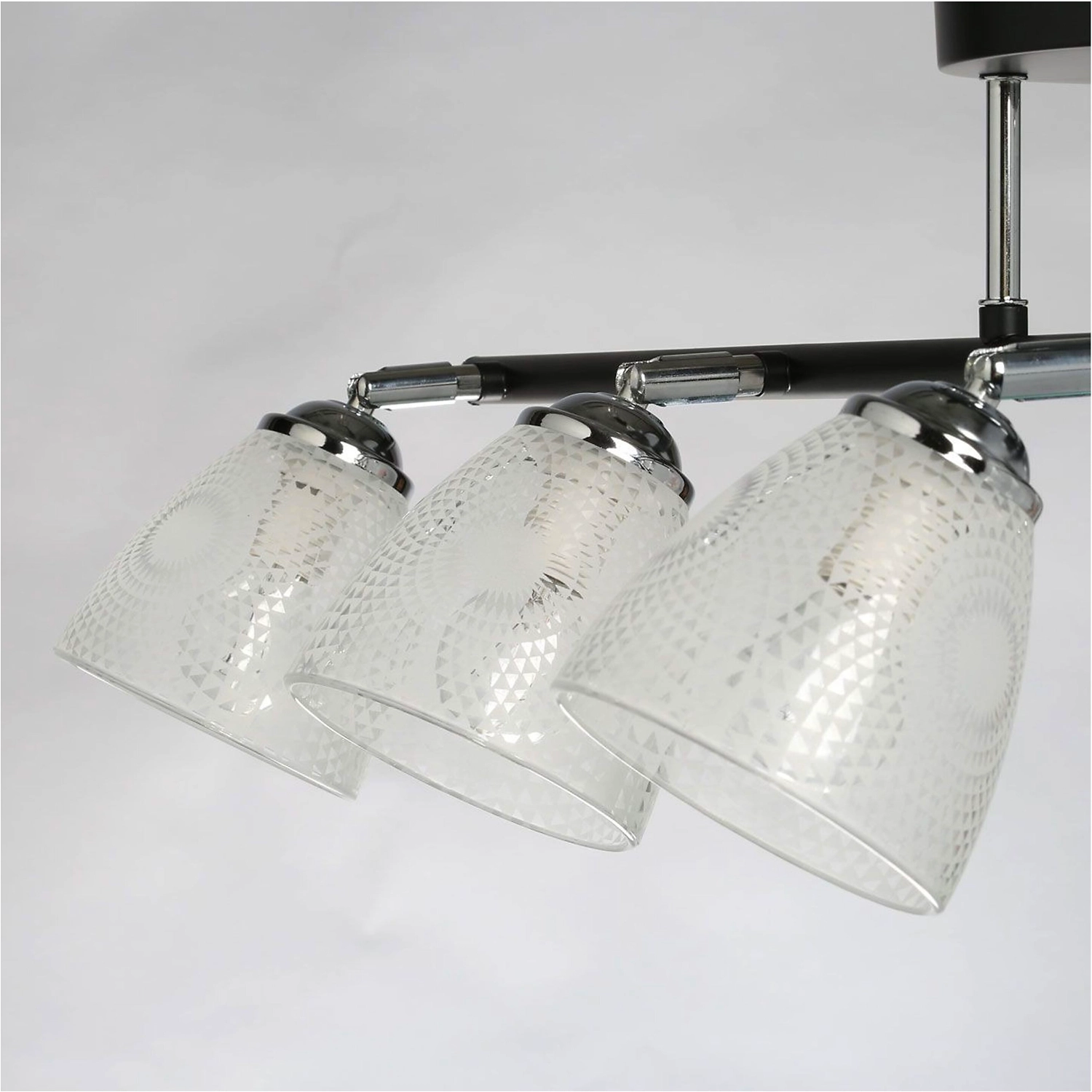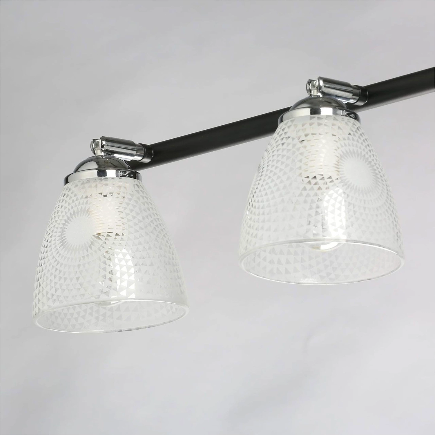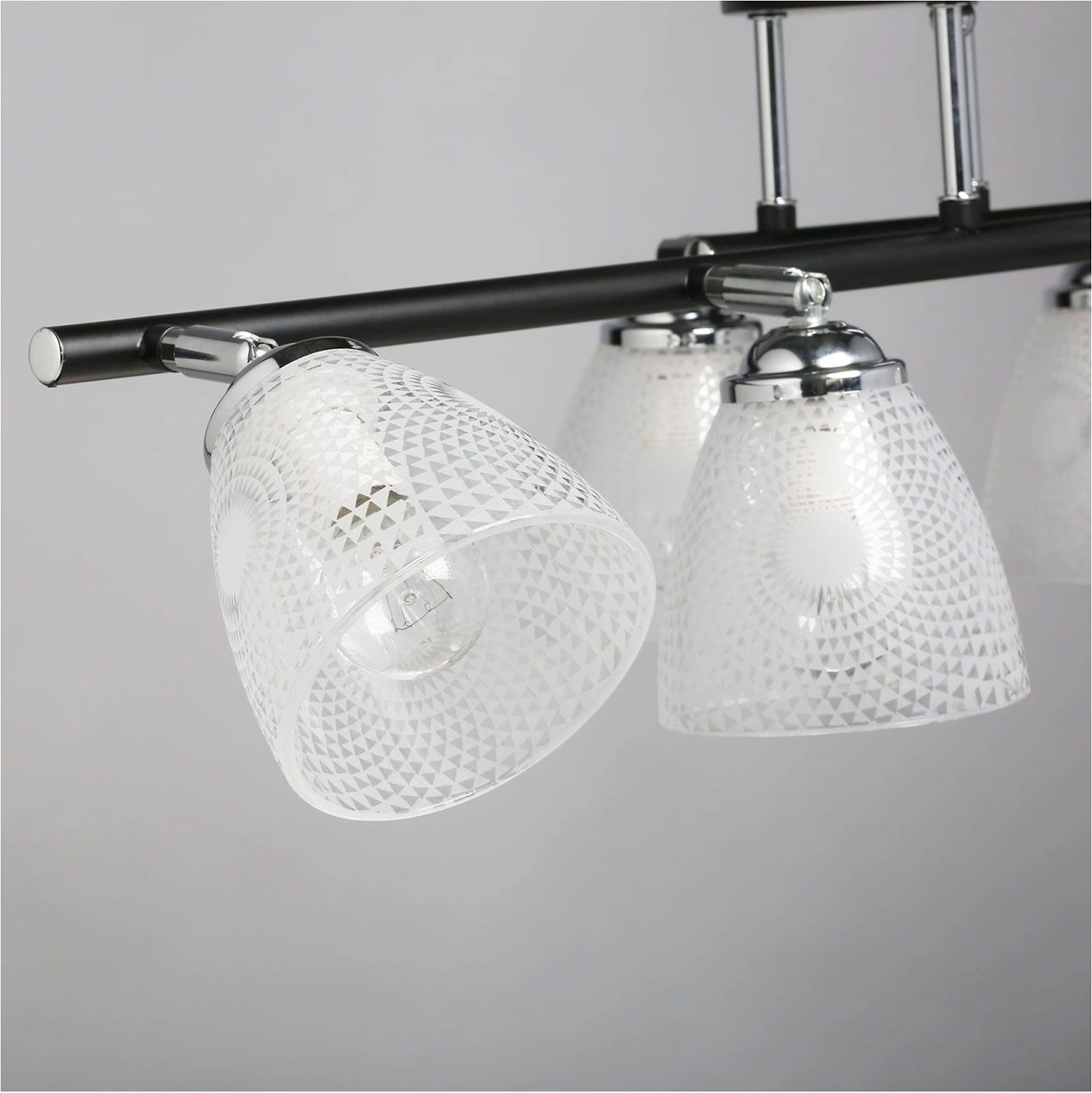 Продолговатая форма светильника как элемент дизайна. Стеклянные плафоны с принтом решают задачи общего и зонального освещения. Конструкция плафонов по типу спотов обеспечивает комфортное распределение света в помещении. Актуальная комбинация металлов черного цвета и хрома основания светильника.