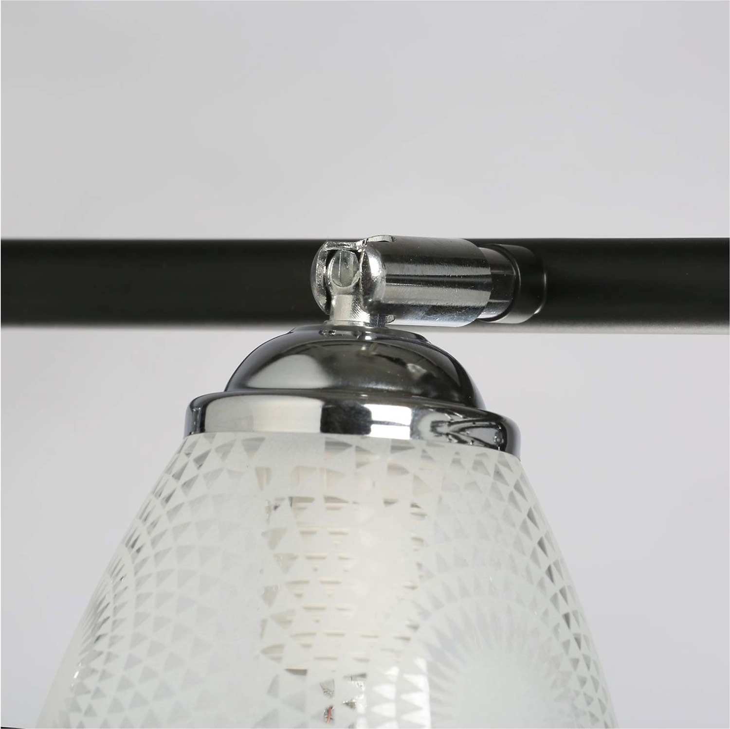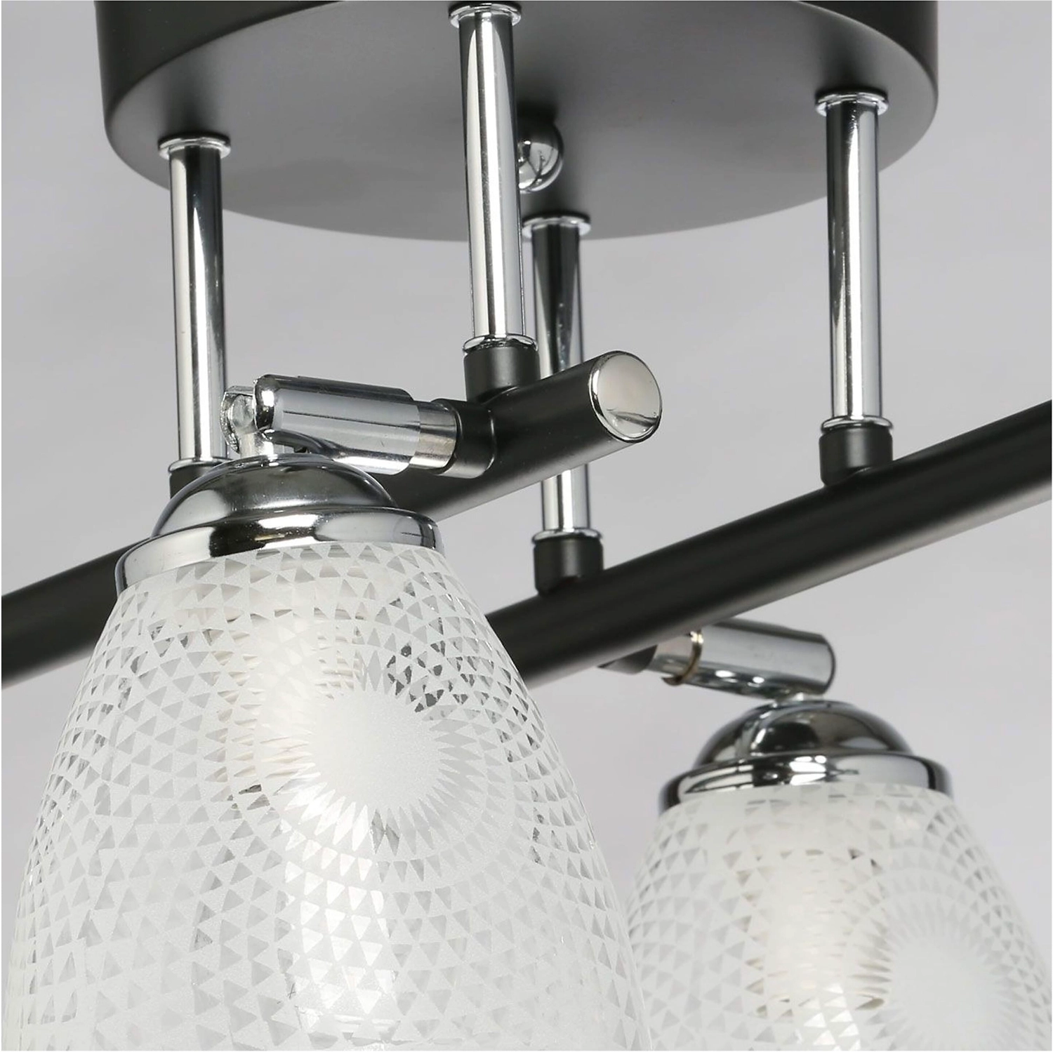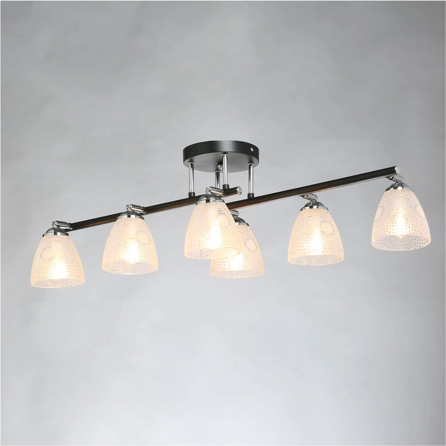 Продолговатая форма светильника как элемент дизайна. Стеклянные плафоны с принтом решают задачи общего и зонального освещения. Конструкция плафонов по типу спотов обеспечивает комфортное распределение света в помещении. Актуальная комбинация металлов черного цвета и хрома основания светильника.