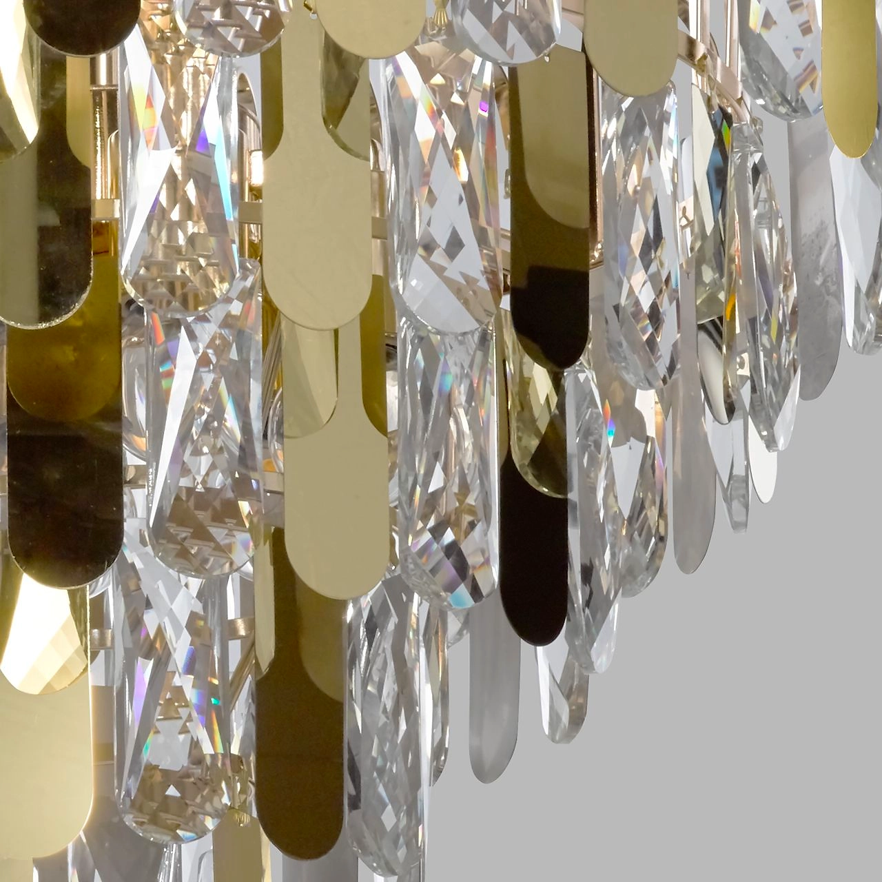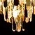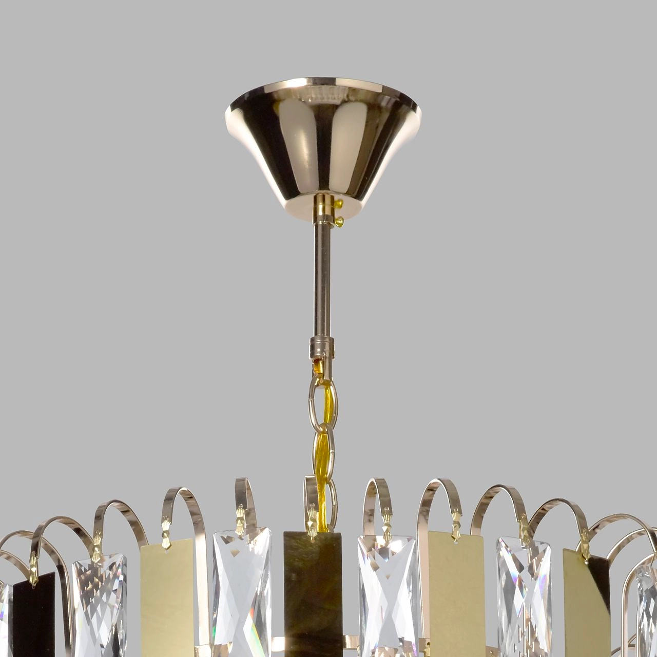 Популярный цвет золота основания светильника. Заменяемые источники света удобны в эксплуатации. Регулирумая высота светильника за счет звеньев цепи. Площадь освещения люстры рассчитана на 18 кв.м.
