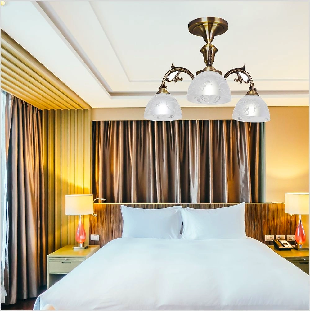 - Трехрожковая люстра с направленными вниз плафонами создает яркий световой поток, обеспечивает эффективное освещение помещения.