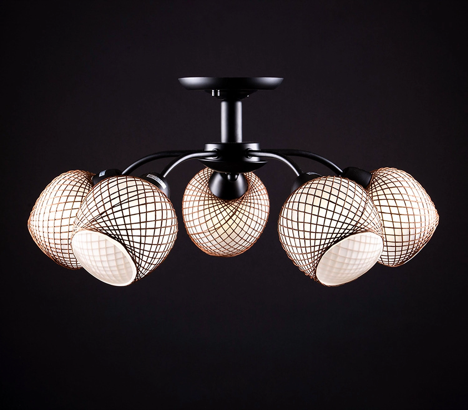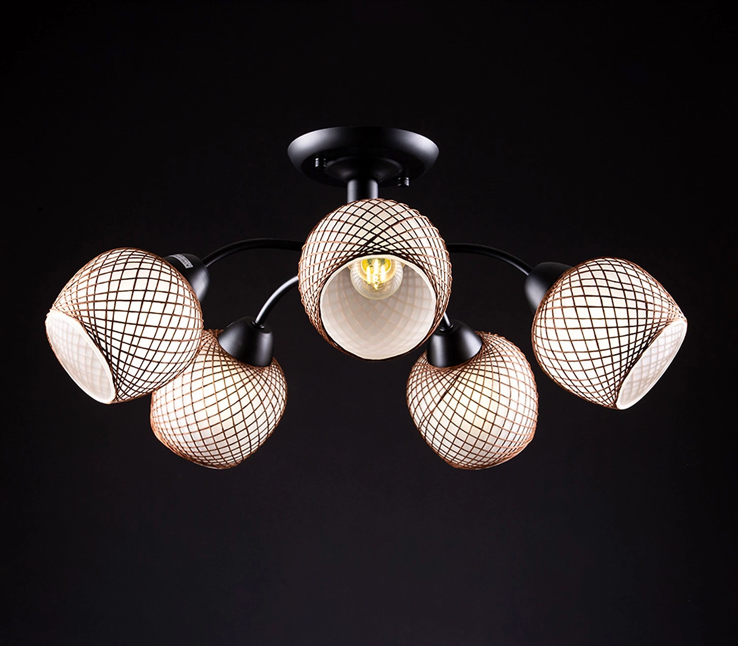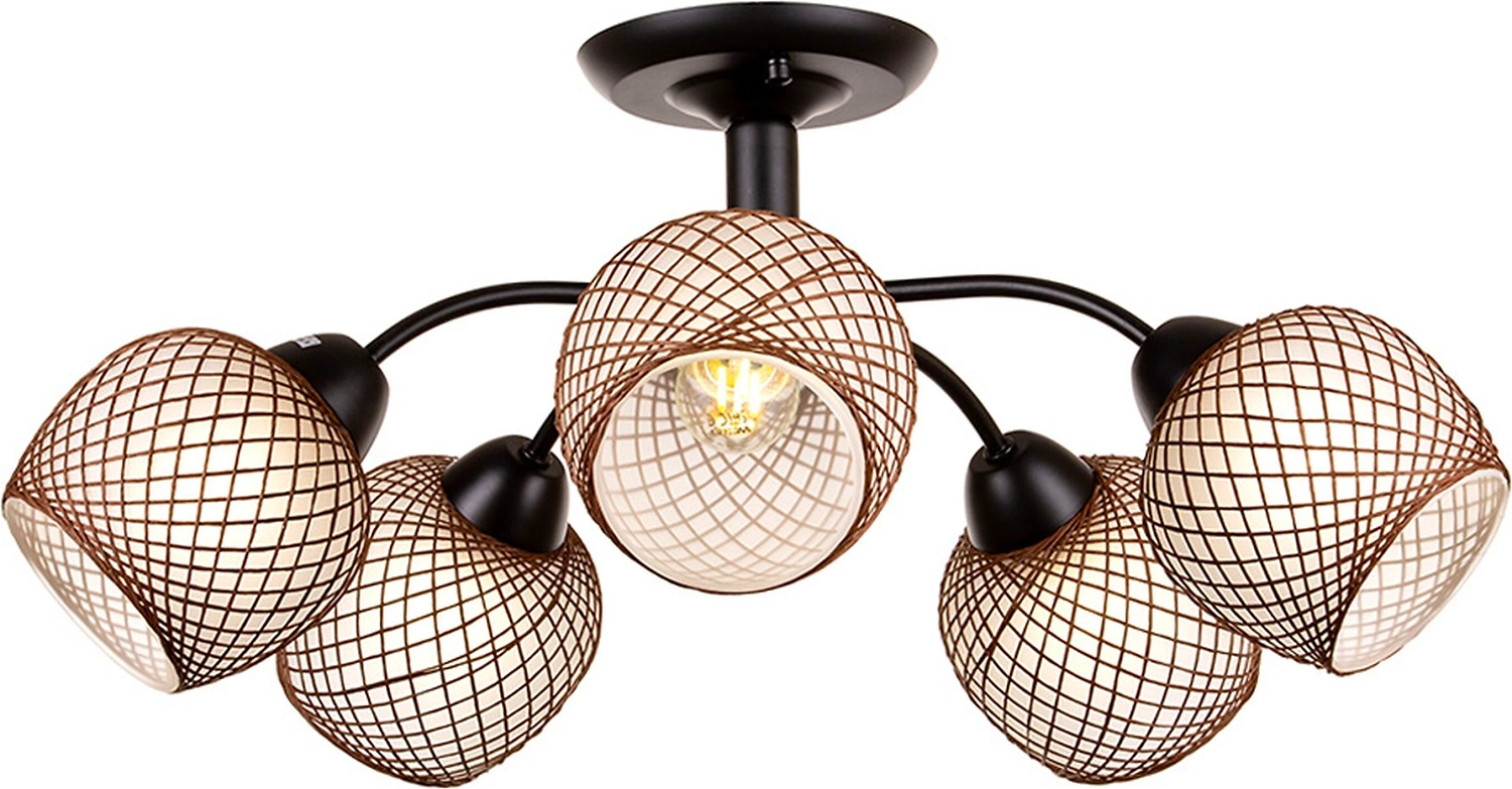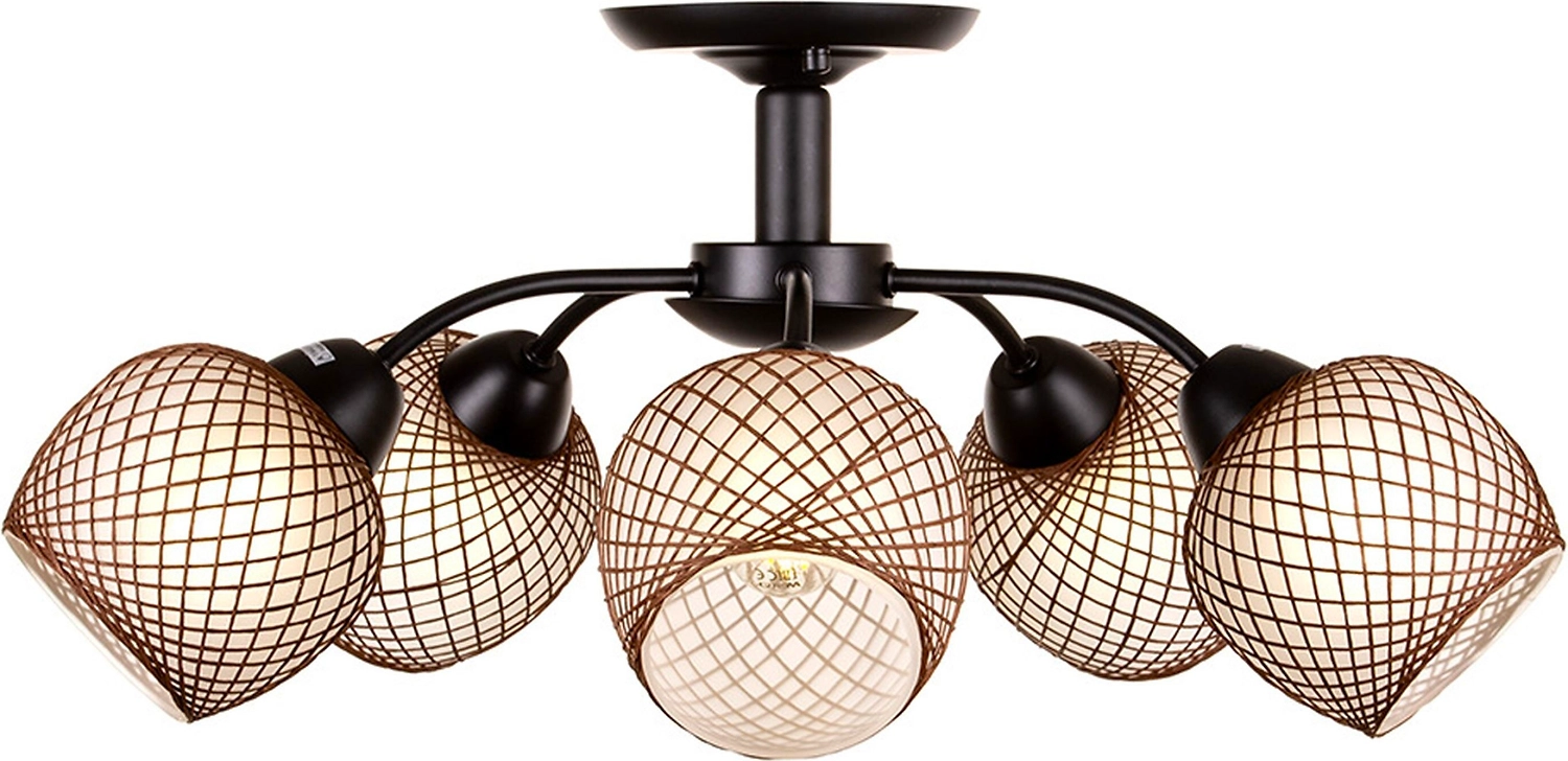 Металлическое основание люстры выполнено в черном цвете. Плафоны округлой формы декорированы элементом в виде золотистой нити. Абажуры изготовлены в светлом оттенке, имеют полуматовую поверхность. Люстра приятно рассеивает свет, создает в помещении комфортное освещение. Материалы отличаются износостойкостью и отличными эксплуатационными качествами.