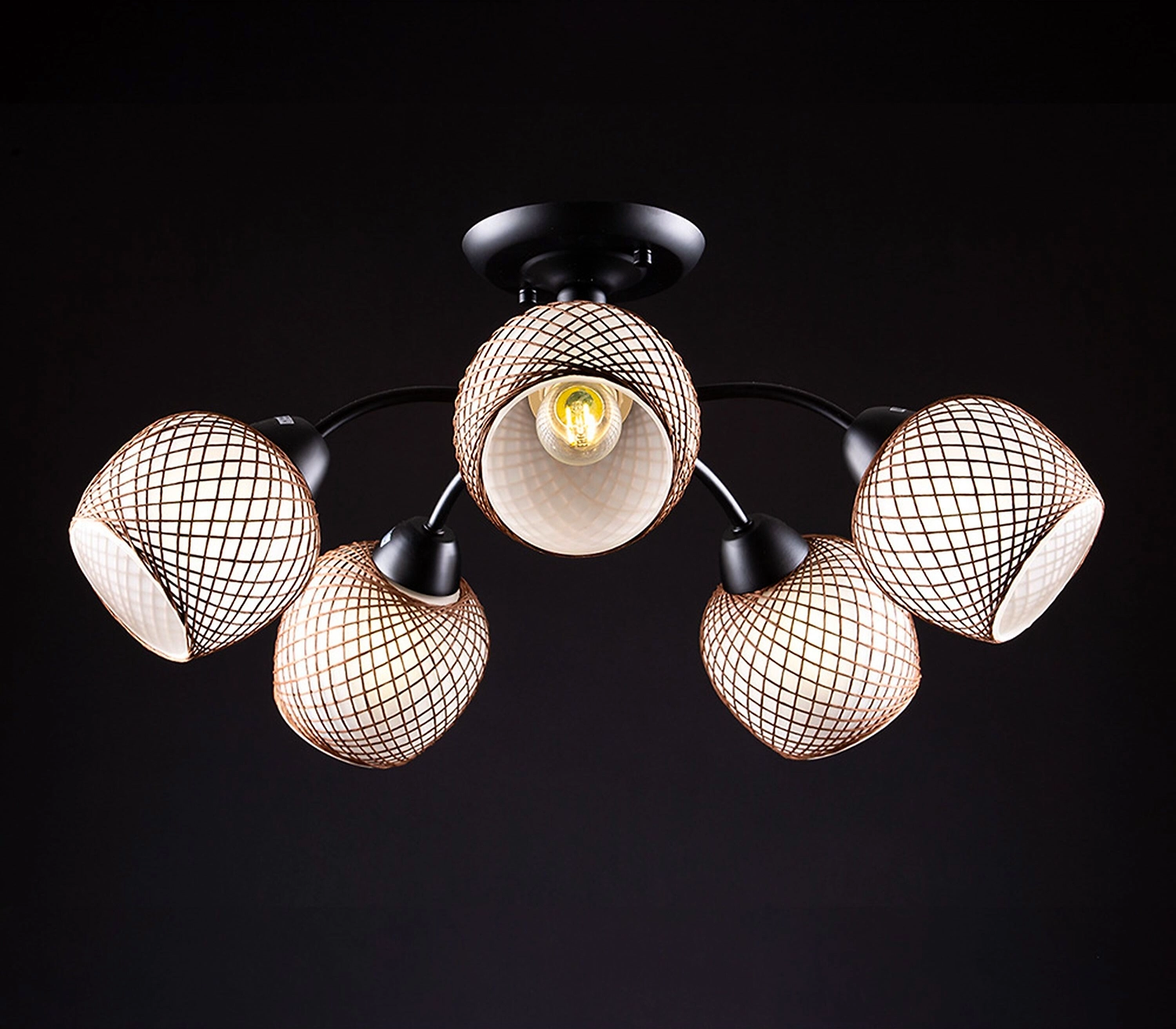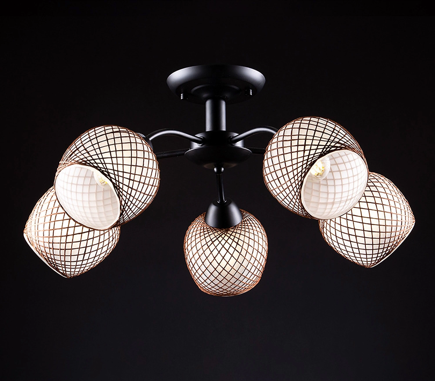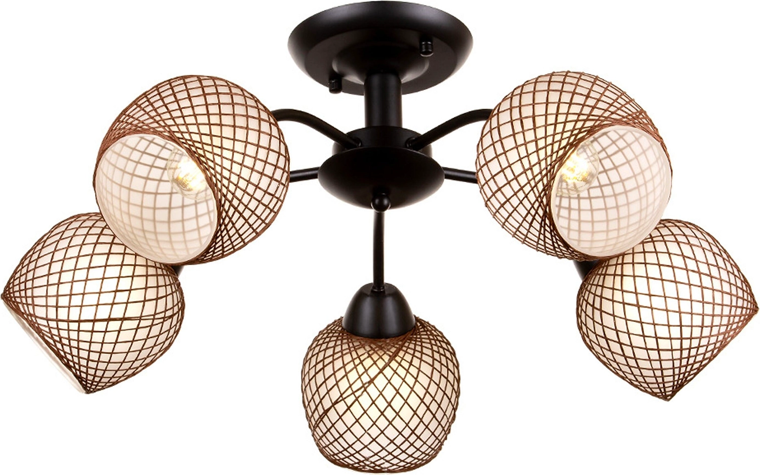 Металлическое основание люстры выполнено в черном цвете. Плафоны округлой формы декорированы элементом в виде золотистой нити. Абажуры изготовлены в светлом оттенке, имеют полуматовую поверхность. Люстра приятно рассеивает свет, создает в помещении комфортное освещение. Материалы отличаются износостойкостью и отличными эксплуатационными качествами.
