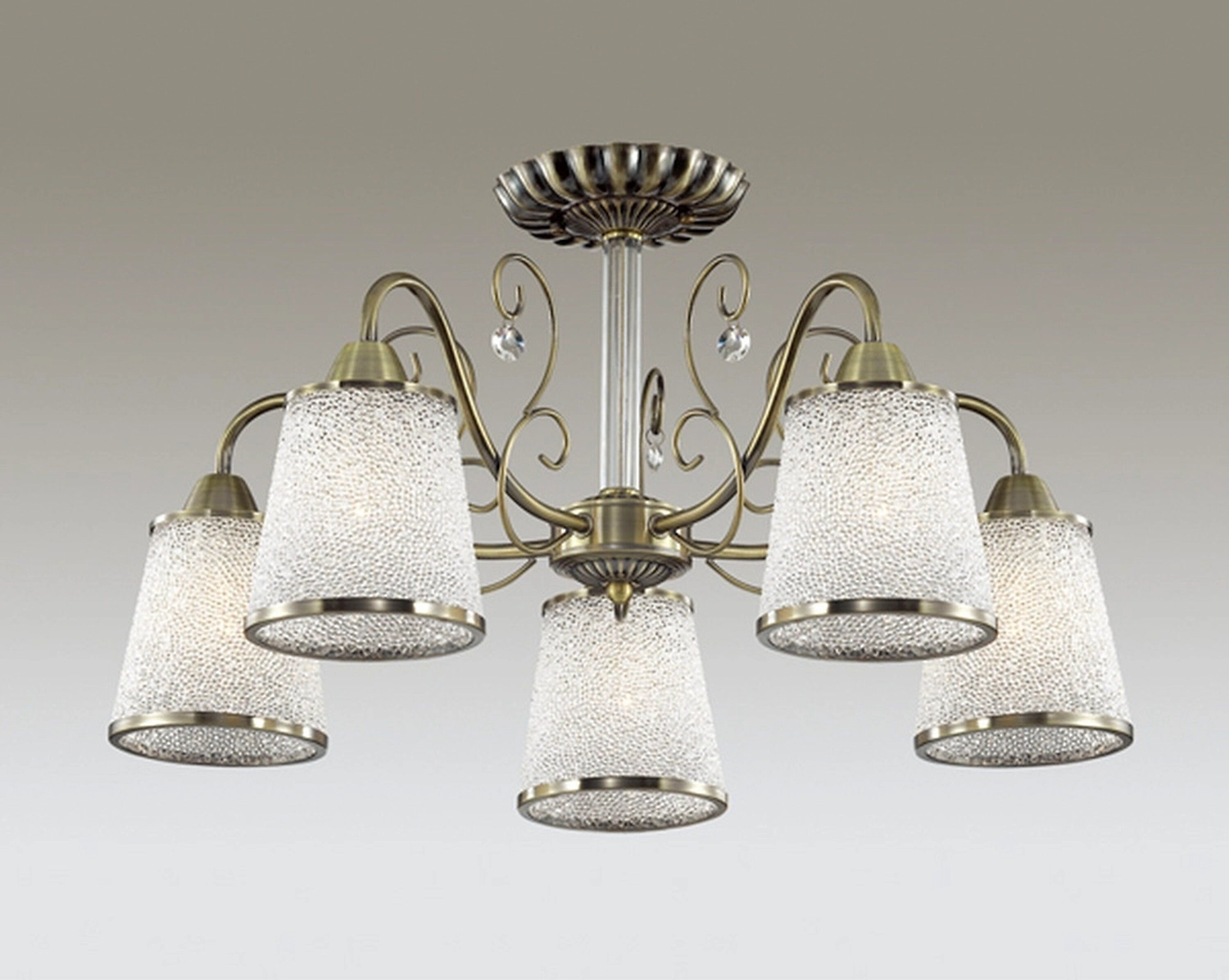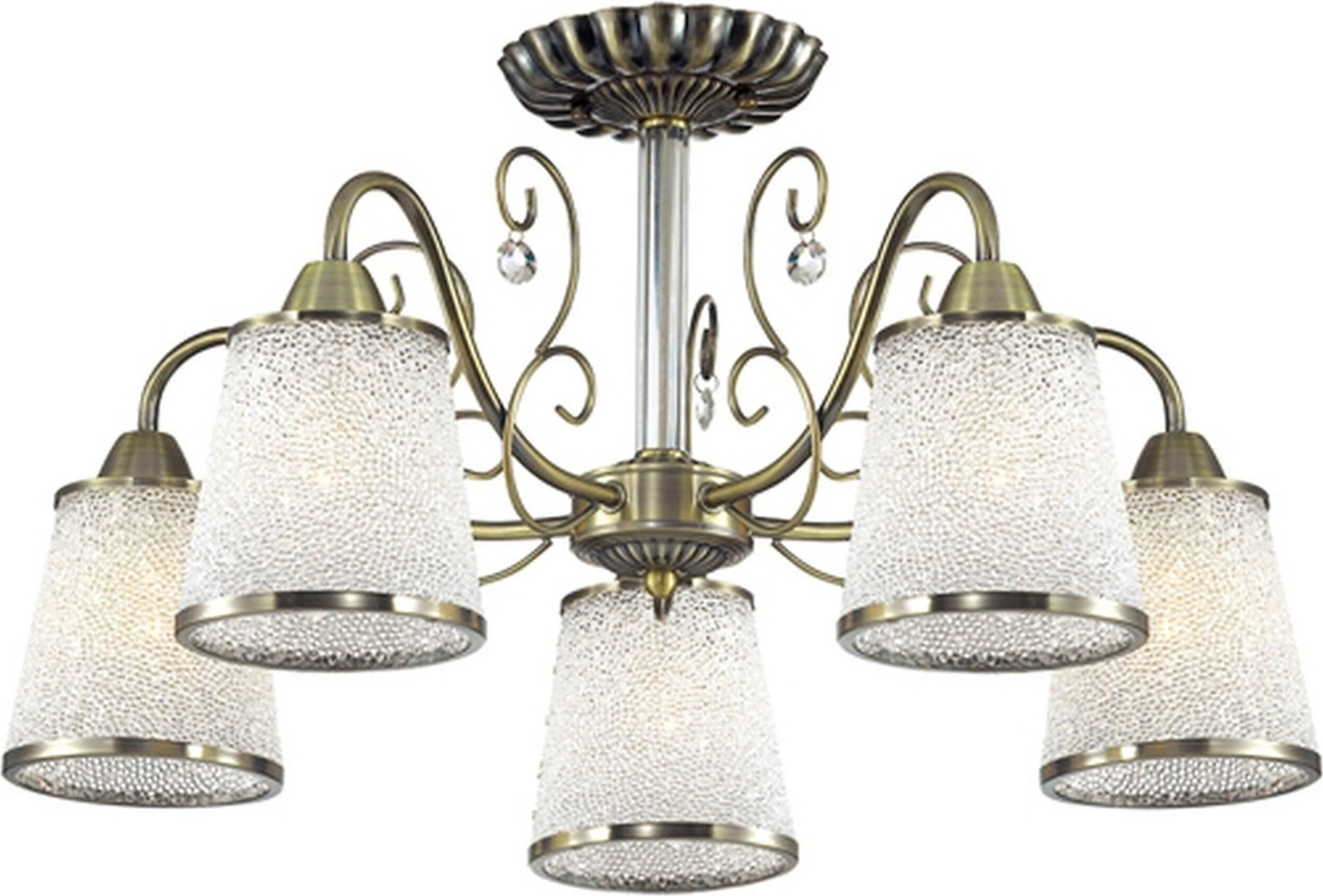 Основу люстры составляет металлический каркас под бронзу. Изящно закрученная арматура делает светильник элегантным и выразительным. Особый шарм модели придают хрустальные подвески. Органичным дополнением композиции служат прозрачные стеклянные плафоны с рельефным тиснением. Люстра может подключаться к диммерам и выключателям с подсветкой.