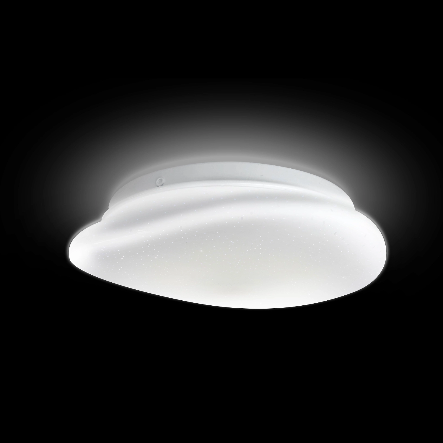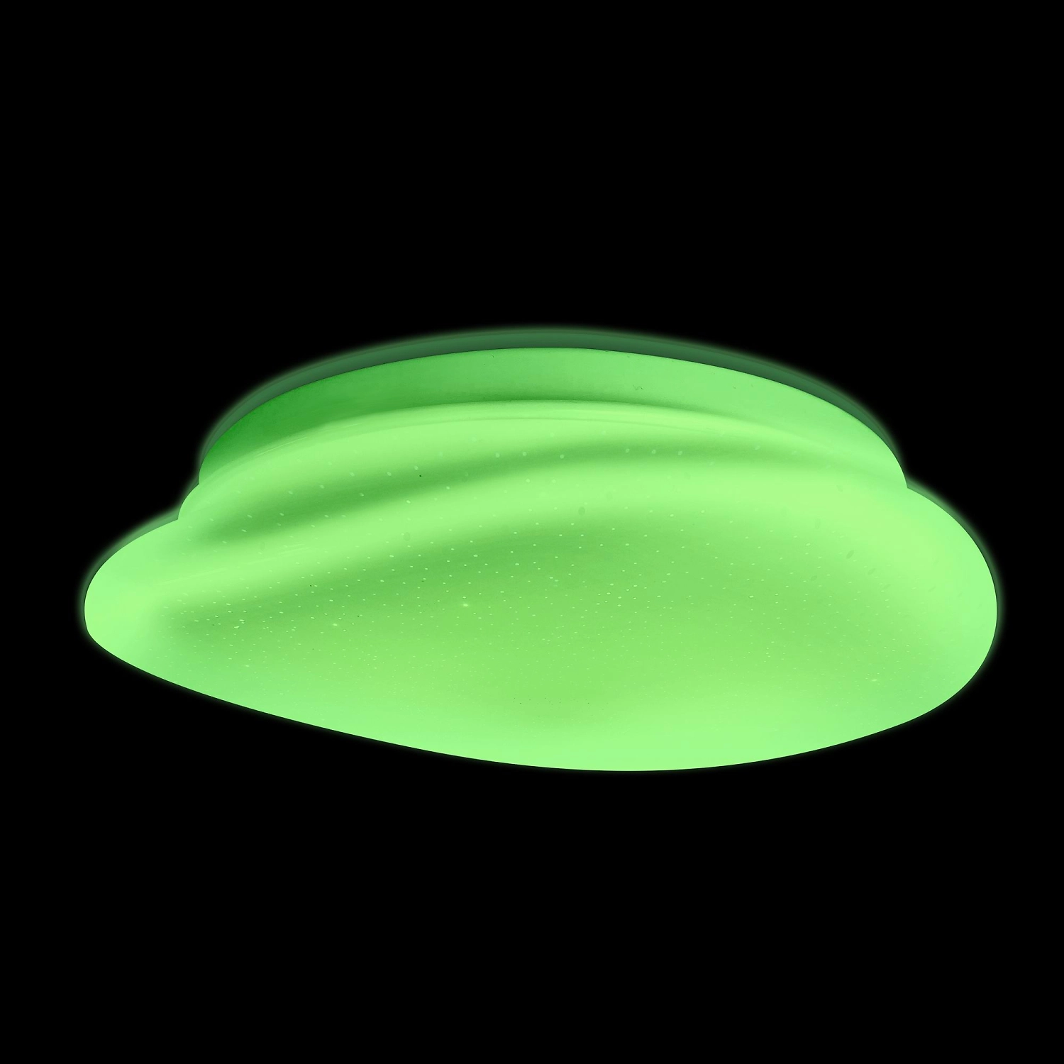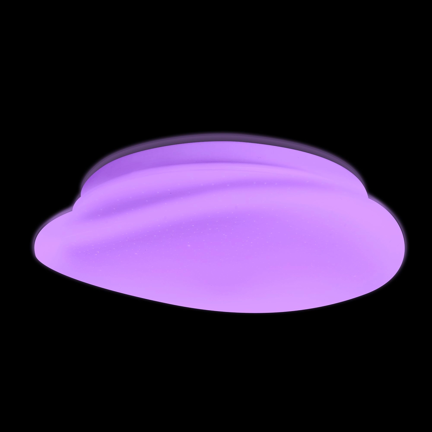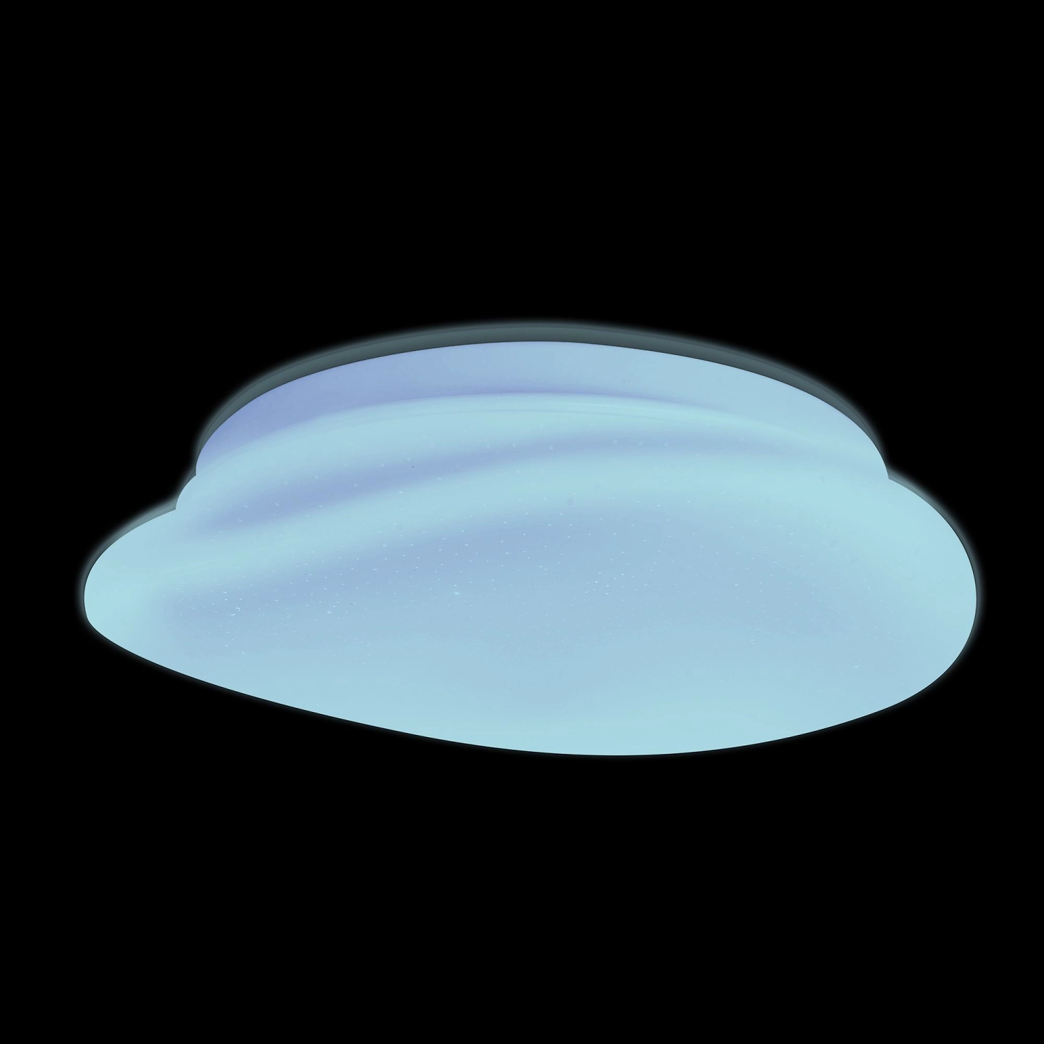 Светодиодный светильник имеет металлический каркас и белый плафон из ПВХ. Модель поддерживает смену яркости свечения и цветовой температуры, может работать в ночном и режиме звездного неба, подключается к умным устройствам через bluetooth.
